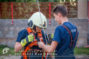 Bei der Station „Drehleiter“ wurden die verschiedenen Anbaugeräte des Rettungskorbes durchbesprochen und gemeinsam aufgebaut. Krankentragenaufnahme, Wendestrahlrohr und auch der Lasthaken waren rasch aufgebaut und durchbesprochen. Am Lasthaken wurde im Anschluss das, speziell für den Einsatz an der 30 Meter hohen Drehleiter geprüfte, Abseilgerät angeschlagen. Ausgerüstet mit einem 5 Punkt Gurt konnte jede Feuerwehrfrau und jeder Feuerwehrmann hoch in den Rettungskorb steigen und anschließend mit dem Abseilgerät die knapp 20 Meter nach unten fahren. Der letzte Schritt kostete zwar eingies an Überwindung, wurd aber mit einem tollen Ausblick und einem einzigartigen Gefühl belohnt.
