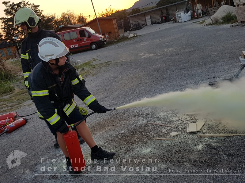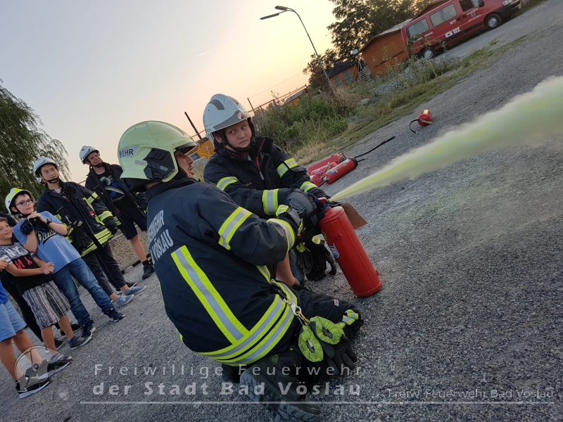 Die jüngsten Mitglieder der Stadtfeuerwehr Bad Vöslau lernen im Rahmen ihrer Ausbildung auch den Umgang mit tragbaren Feuerlöschern. Dazu wurde am 20. September 2018 ein kleines Holzfeuer von den Jugendbetreuern vorbereitet. Die Mädchen und Burschen hatten alle die Möglichkeit einen Feuerlöscher im Echteinsatz auszuprobieren. Dabei wurde auch das richtige Vorgehen mit der Windrichtung geübt.