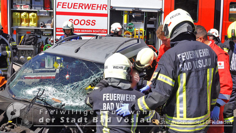 Gemeinsam wurde die Unfallstelle abgesichert, ein Brandschutz aufgebaut und die Menschenrettung des eingeklemmten Micro-Car Fahrers vorbereitet. Dazu wurde von der Feuerwehr Sooss mittels hydraulischem Rettungsgerät eine große Seitenöffnung geschaffen sowie die Einklemmungen im Fußraum beseitigt. Während der gesamten Rettungsarbeiten wurde der Lenker von 2 Rettungssanitätern der Feuerwehr Bad Vöslau betreut. In Absprache mit dem eingetroffenen Notarzt aus Baden wurde gemeinsam mit den Rettungsmannschaften aus Bad Vöslau und Baden eine schonende Rettung mittels Spineboard durchgeführt.