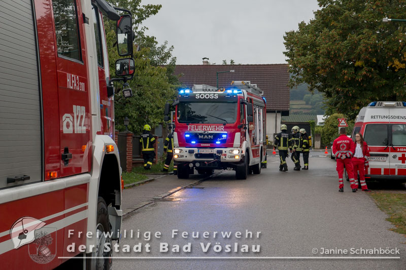 Beim Eintreffen der Feuerwehr Sooß war starker Chlorgeruch wahrnehmbar, mit einem Überdruckbelüfter wurde das Chlorgas von dem Wohnhaus weggedrückt. Der Atemschutztrupp des HLFA3 der Bad Vöslauer Stadtfeuerwehr rüstete sich in der Zwischenzeit mit Schutzanzügen der Schutztufe 2 aus.