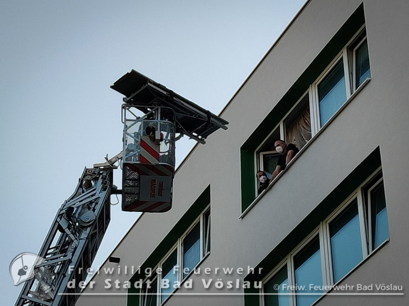 Die Bad Vöslauer Feuerwehreinsatzkräfte waren zu diesem Zeitpunkt auf dem Rückweg von einer automatischen Brandmelderauslösung und konnten somit direkt zu der neuen Einsatzadresse fahren. Vor Ort war bereits der Bad Vöslauer Rettungswagen und ein Notarzteinsatzfahrzeug aus Baden. Gemeinsam mit den Sanitätern entschloss man sich zu einer schonenden Rettung mit der Drehleiter.