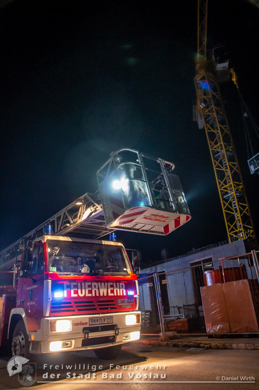 Wegen eines Stromausfalles auf einer Baustelle, saß ein Arbeiter in einem Arbeitskorb fest. Der Arbeitskorb hing in gut 14 Metern Höhe an einem – stromlosen – Turmdrehkran. Der Einsatzleiter der Freiwilligen Feuerwehr Leobersdorf stellte rasch fest, dass der Arbeiter unverletzt ist und den Korb nicht aus eigener Kraft verlassen kann. Zur Rettung wurde daher die Drehleiter der Freiwilligen Feuerwehr der Stadt Bad Vöslau alarmiert.
