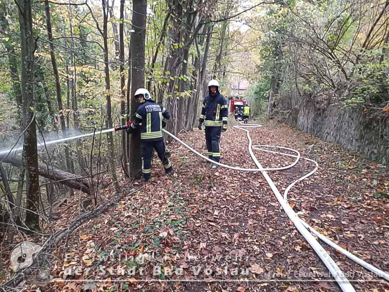Insgesamt wurden mehrere hundert Meter Schlauchleitung bis zur Ruine verlegt, das Bad Vöslauer Großtanklöschfahrzeug und eine Tragkraftspritze aus Großau übernahmen hier die Schlüsselfunktionen in der Wasserversorgung. Mit 7 Tank- bzw. Hilfeleistungsfahrzeugen wurde Löschwasser aus dem nahen Großau zur Einsatzstelle transportiert.