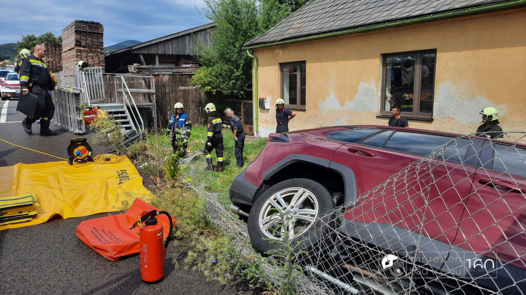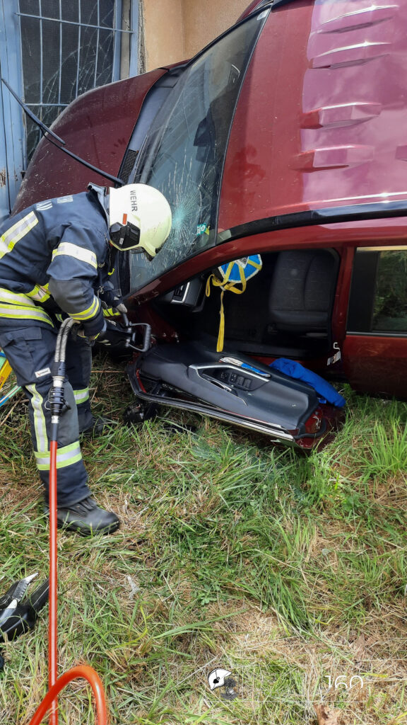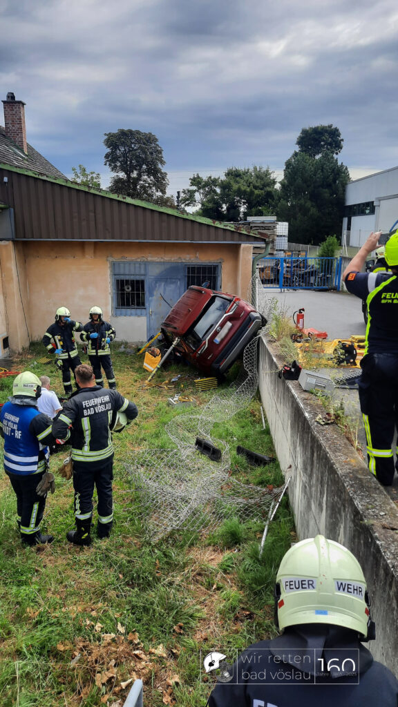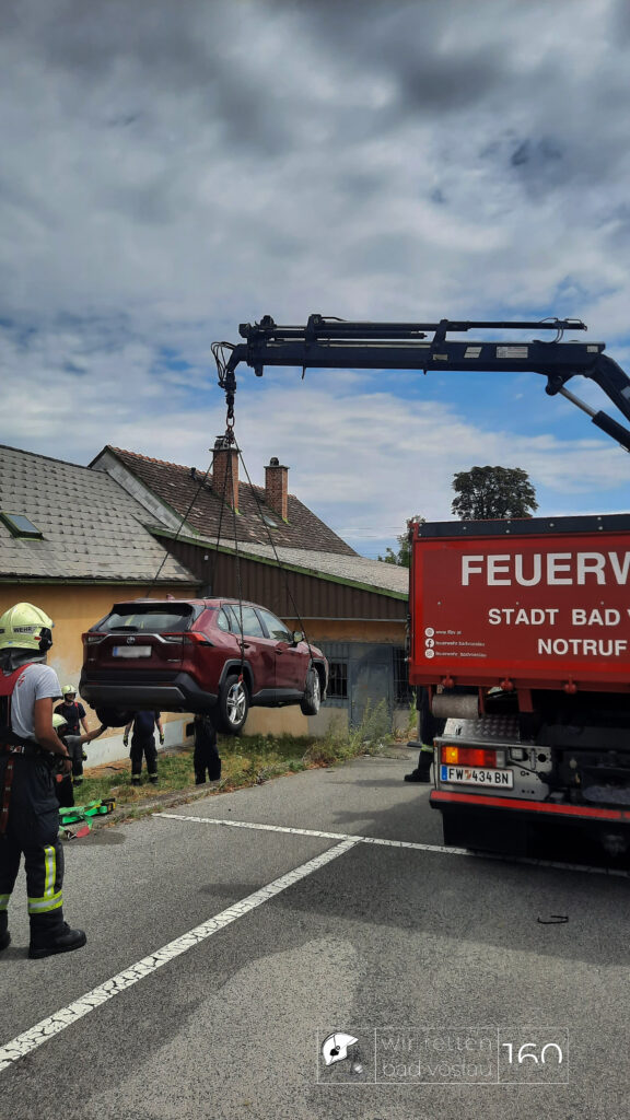 Ein PKW kam aus unbekannter Ursache von der Fahrbahn eines Supermarktparkplatzes ab und blieb in Schräglage auf einer Einfriedung hängen. Beim Eintreffen der Feuerwehreinsatzkräfte wurde der im Fahrzeug eingeschlossene Lenker vom Rettungsdienst betreut. Gemeinsam mit der Freiwilligen Feuerwehr Gainfarn wurde das Fahrzeug stabilisiert. Anschließend wurde die Fahrertüre mit einem hydraulischen Rettungsgerät geöffnet und der verletzte Lenker an den Rettungsdienst übergeben.