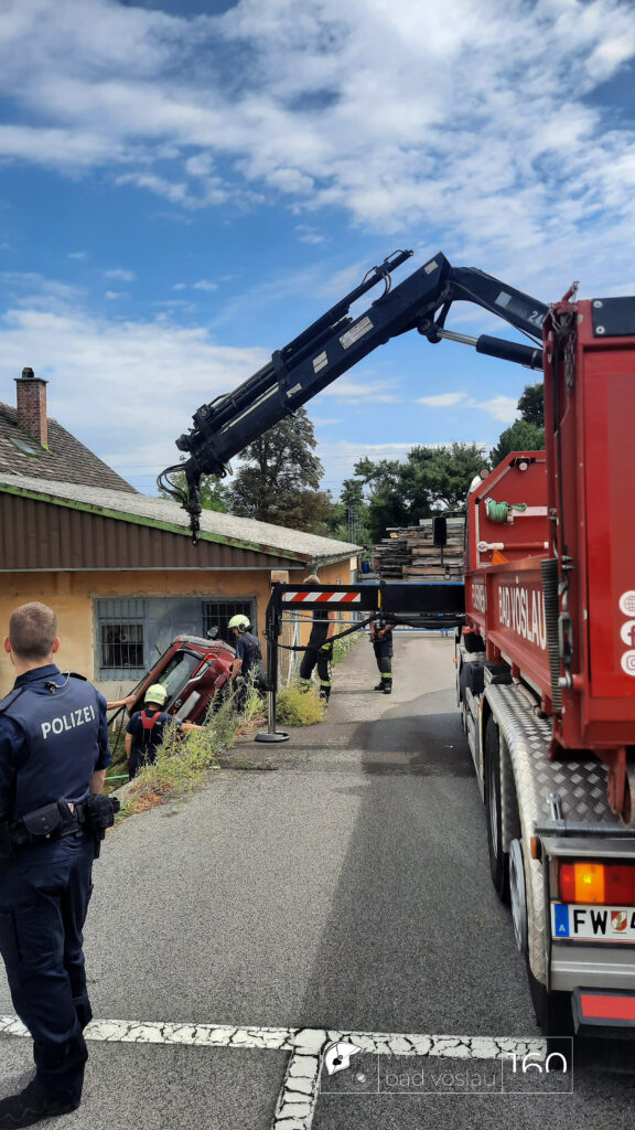 Die Fahrzeugbergung wurde nach der Freigabe durch die Polizei mit dem Wechselladefahrzeug der Bad Vöslauer Stadtfeuerwehr durchgeführt.