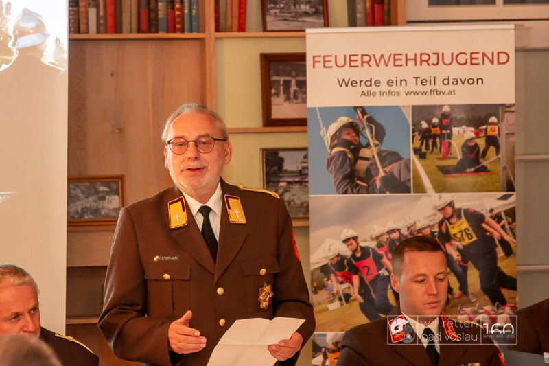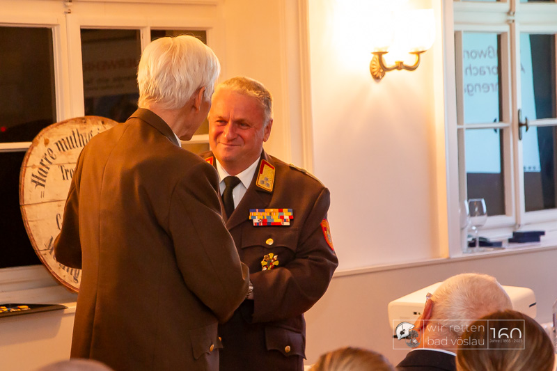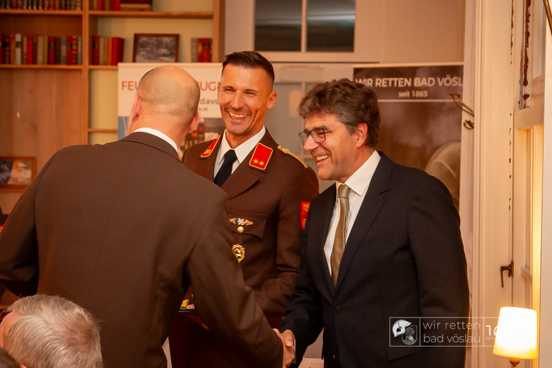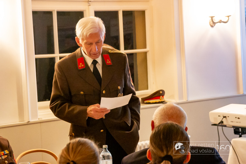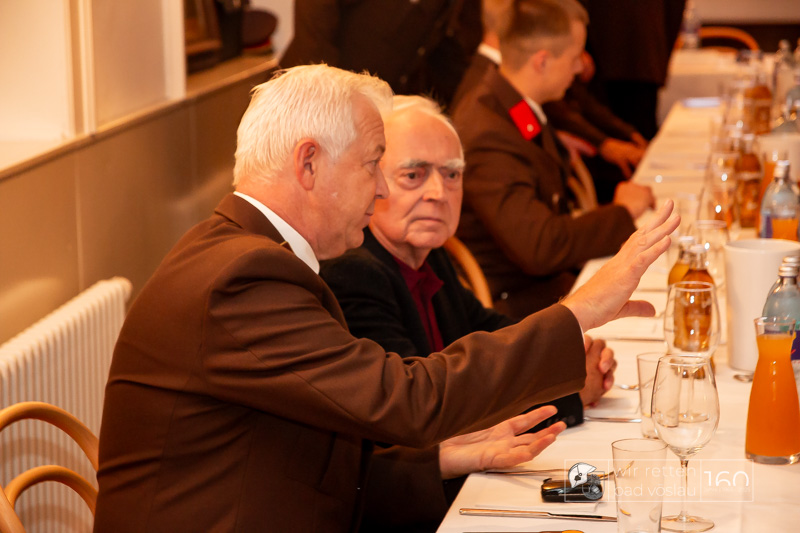 Im Anschluss richteten die beiden Ehrenkommandanten Anton und Markus Hoffmann ihre Worte an die Anwesenden. Anton Hoffmann erinnerte an die Errichtung des Feuerwehrhauses in der Friesstraße und daran, dass er vor genau 40 Jahren gemeinsam mit Feuerwehrtechniker Ing. Alfred Michalek die Feuerwehrjugend gründete, die bis heute ein wesentlicher Bestandteil der Wehr ist. Markus Hoffmann blickte auf die frühen Jahre der Feuerwehr zurück, las alte Berichte vor und bedankte sich bei seinem Vater für dessen Vorbildwirkung und Engagement. Kommandant Michalek dankte beiden für ihr jahrzehntelanges Wirken und sprach auch seinem Stellvertreter Christian Hoffmann sowie dem Leiter des Verwaltungsdienstes Alexander Sebestik seinen Dank für die hervorragende Zusammenarbeit im Kommando aus.