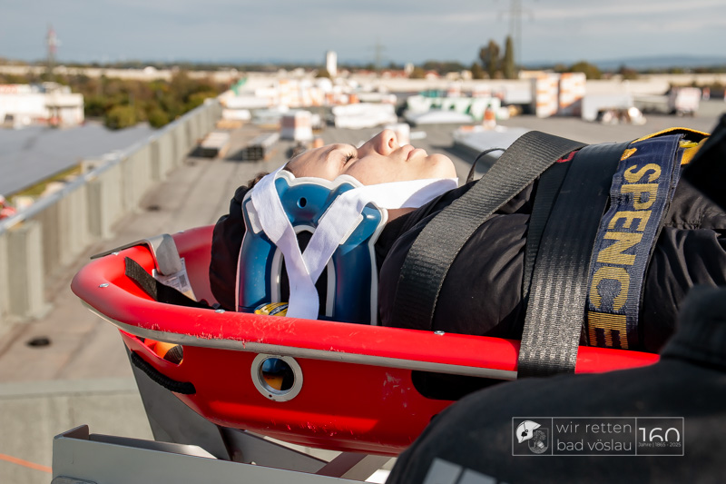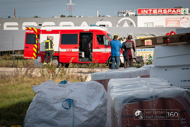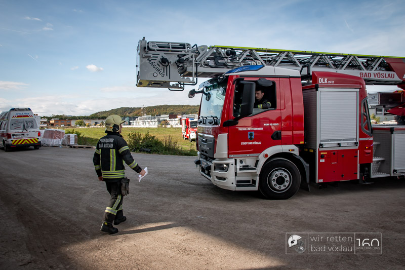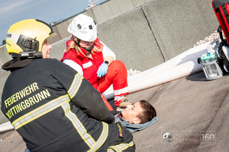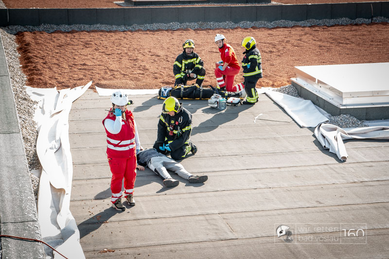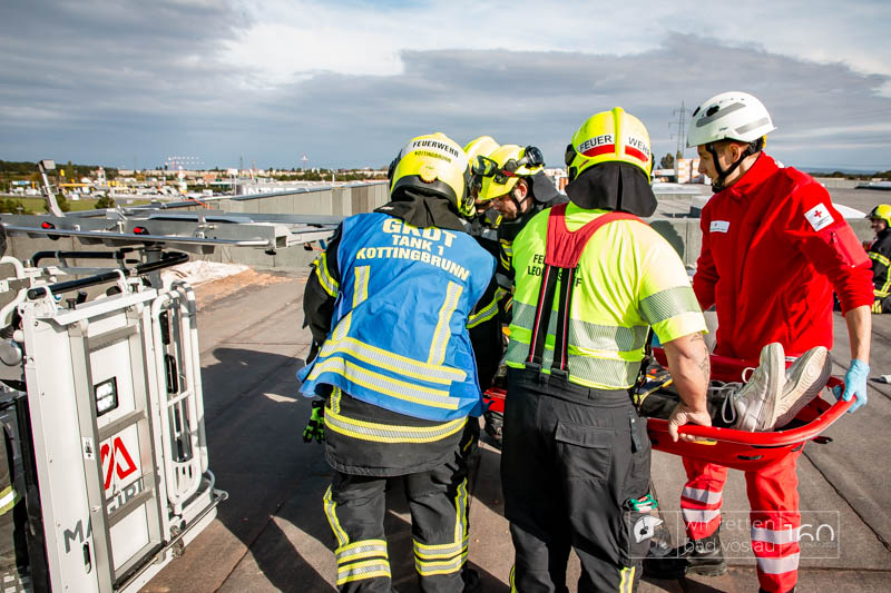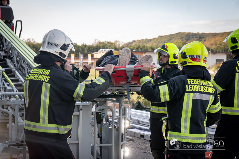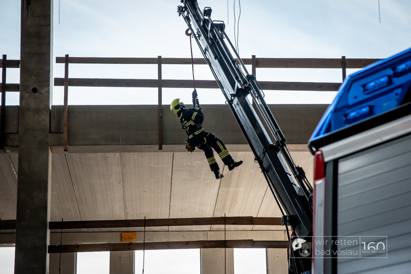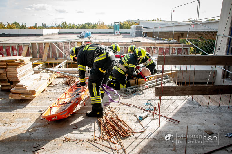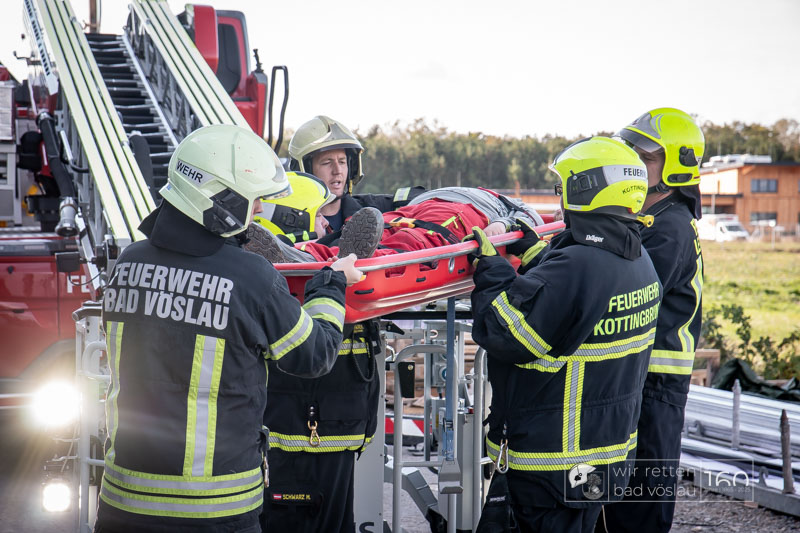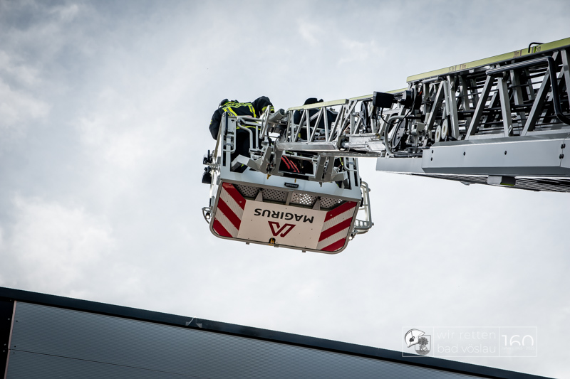 Die Drehleiter Bad Vöslau wurde von Einsatzkräften aus Kottingbrunn und Leobersdorf sowie dem Roten Kreuz bei der Menschenrettung vom Hallendach unterstützt. Zum Teil konnten die Menschen noch selbst in den Drehleiterkorb einsteigen, zum Teil mussten sie mit der Krankentragenaufnahme und Korbschleiftragen von dem Dach gehoben werden.