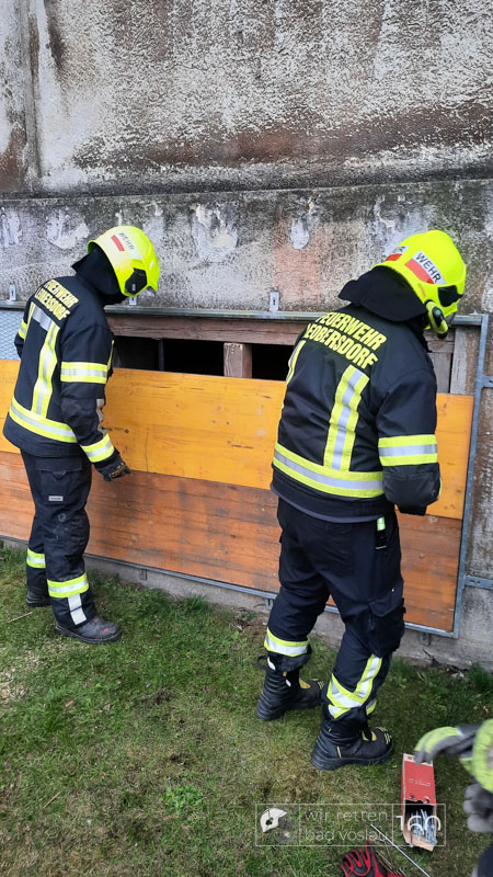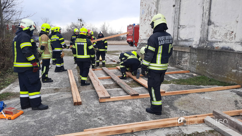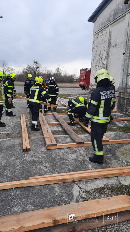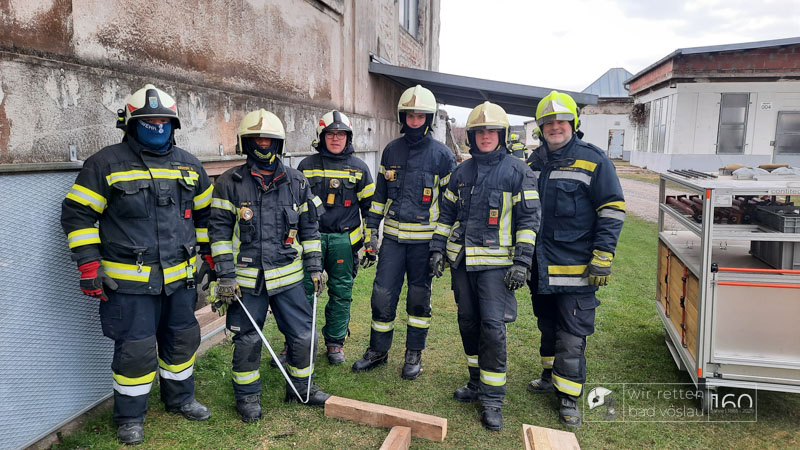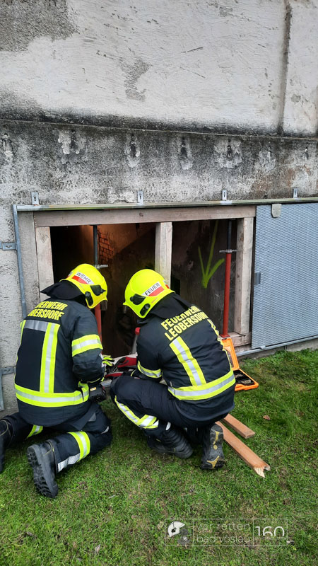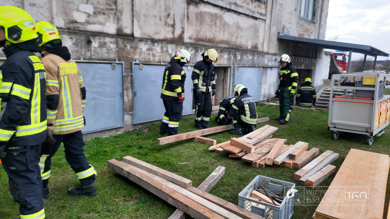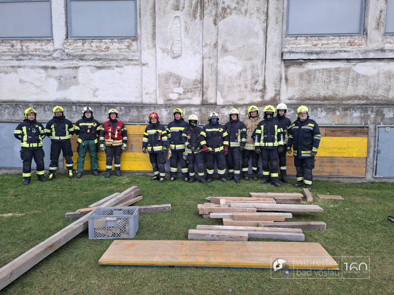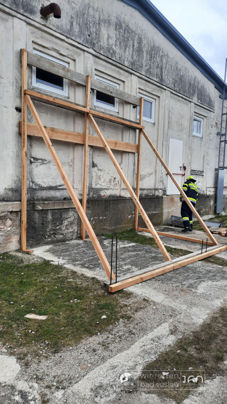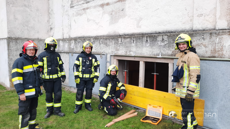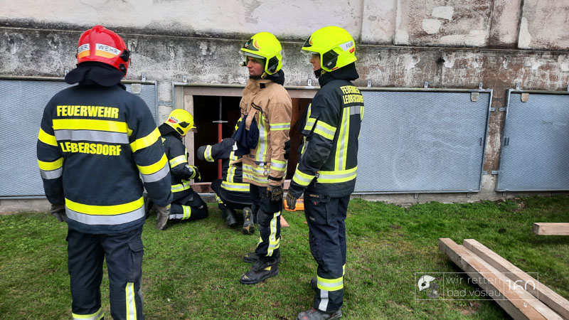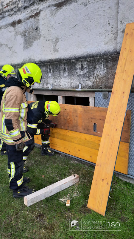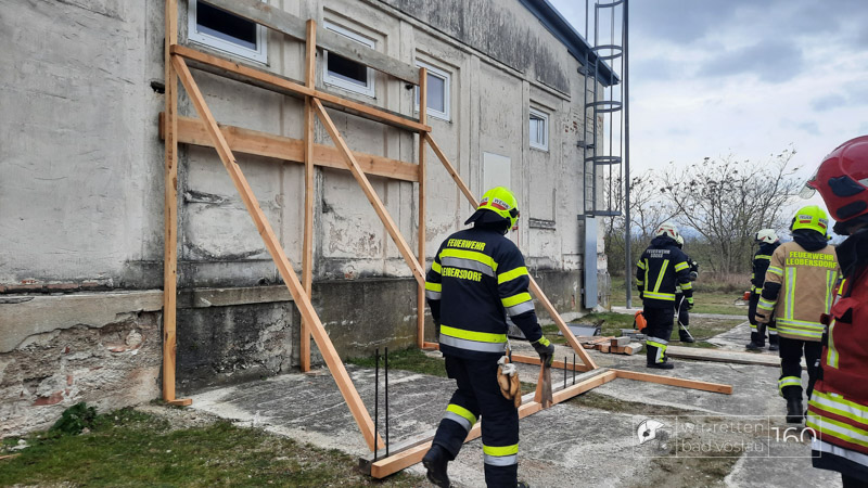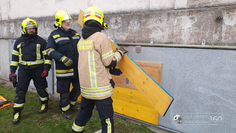 Die Bad Vöslauer Einsatzkräfte wurden diesmal durch zwei Mitglieder der Sooßer Feuerwehr ergänzt und mussten gemeinsam mit den Kameraden der Feuerwehr Leobersdorf einen Keller sichern und eine Hausmauer gegen Umstürzen abstützen.