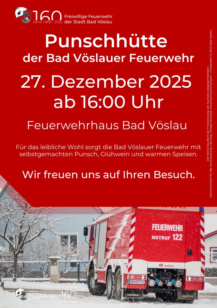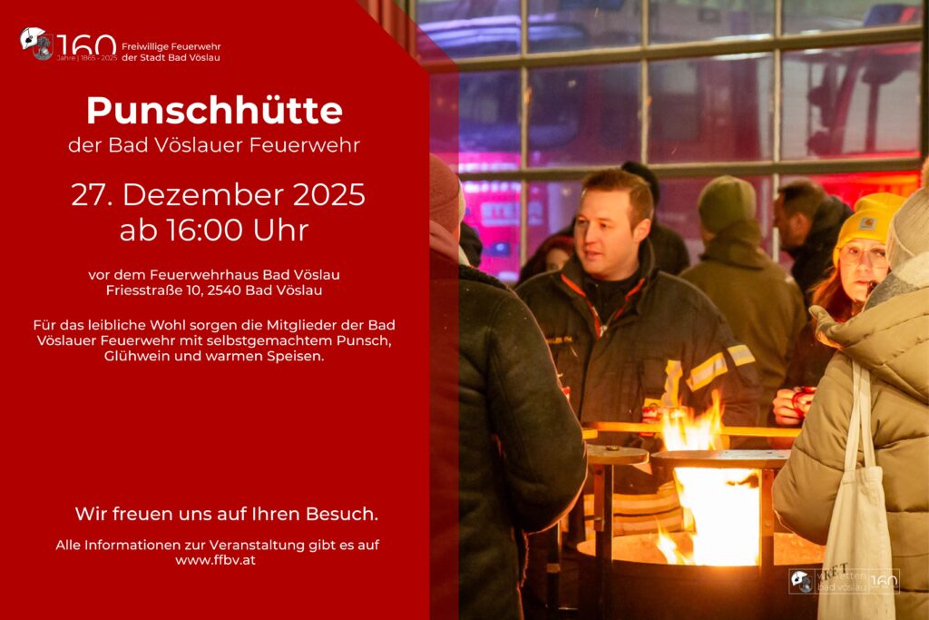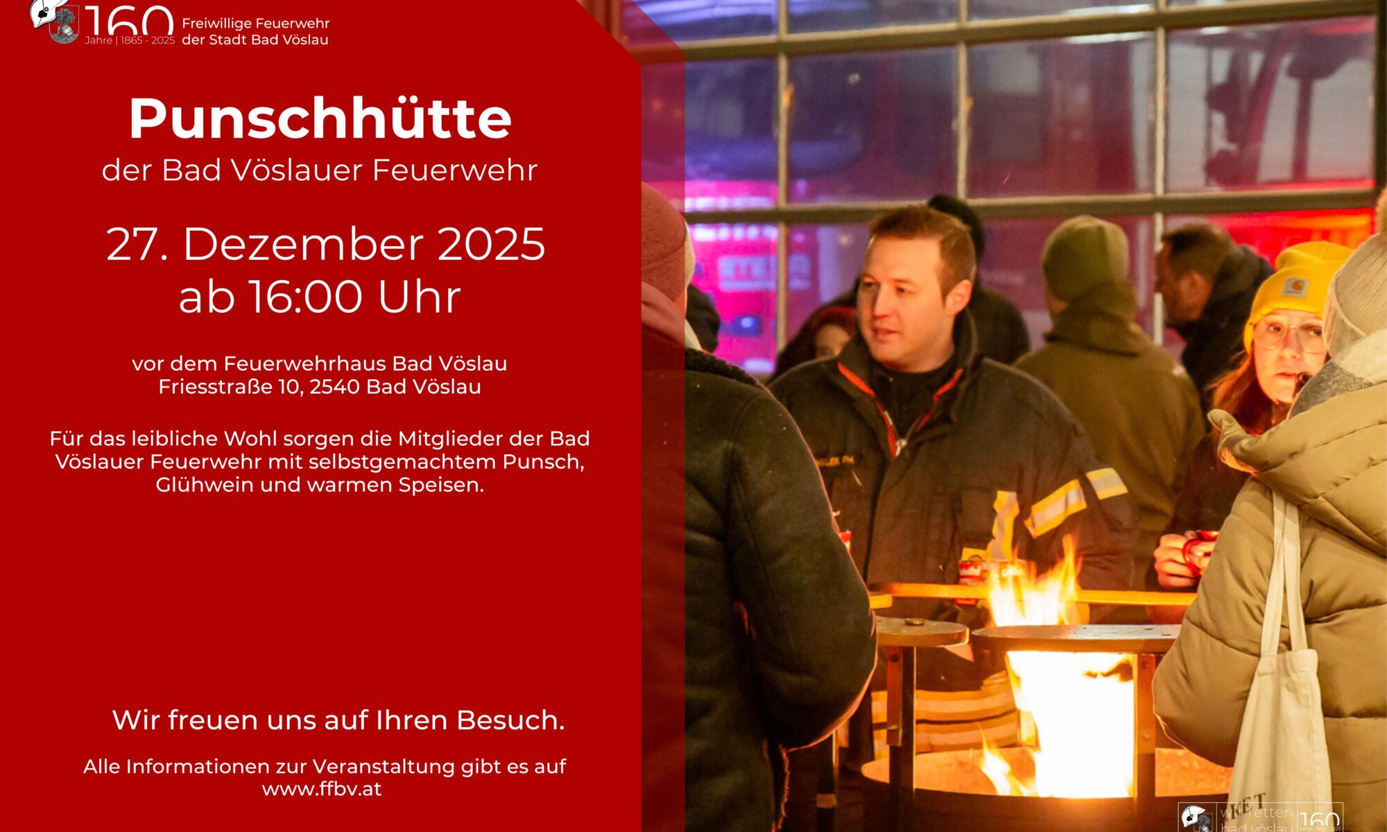 Am 27. Dezember ab 16:00 Uhr eröffnen wir unsere Punschhütte vor dem Feuerwehrhaus. Gemeinsam mit euch wollen wir das Jubiläumsjahr bei selbst gemachten Punsch, Glühwein und warmen Speisen ausklingen lassen.