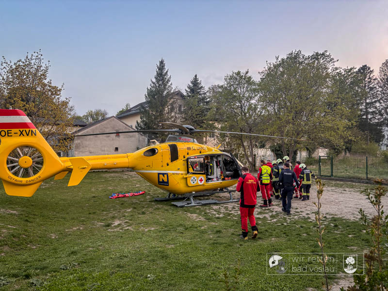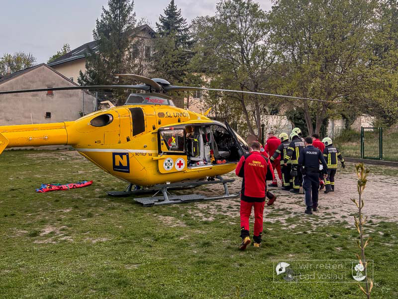 Beim Eintreffen der Feuerwehreinsatzkräfte waren bereits ein Rettungswagen und ein Notarzteinsatzfahrzeug des Roten Kreuzes sowie die Polizei vor Ort Der Notarzthubschrauber Christophorus 3 landete im gleichen Augenblick auf einem angrenzenden Spielplatz.