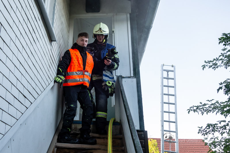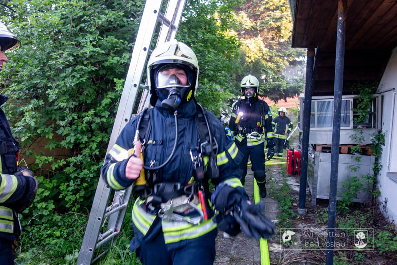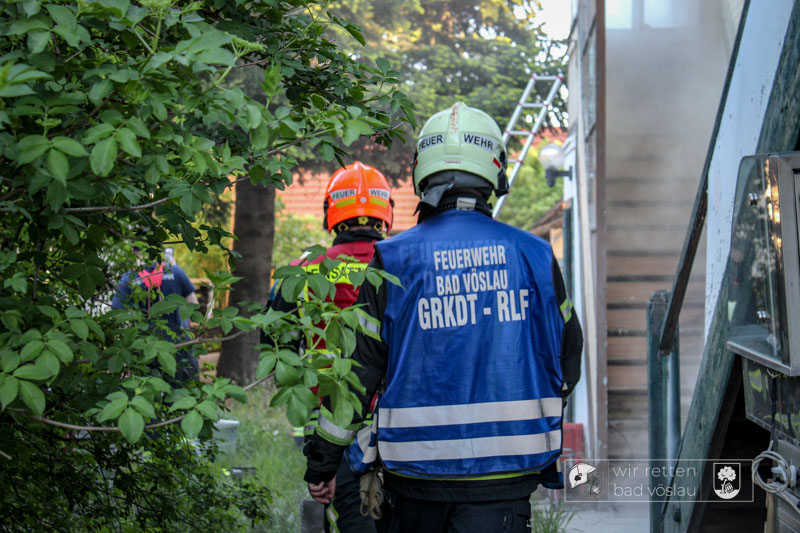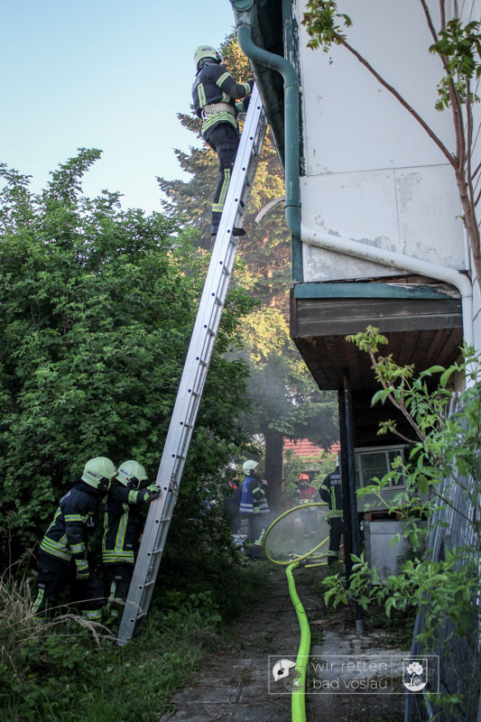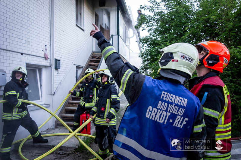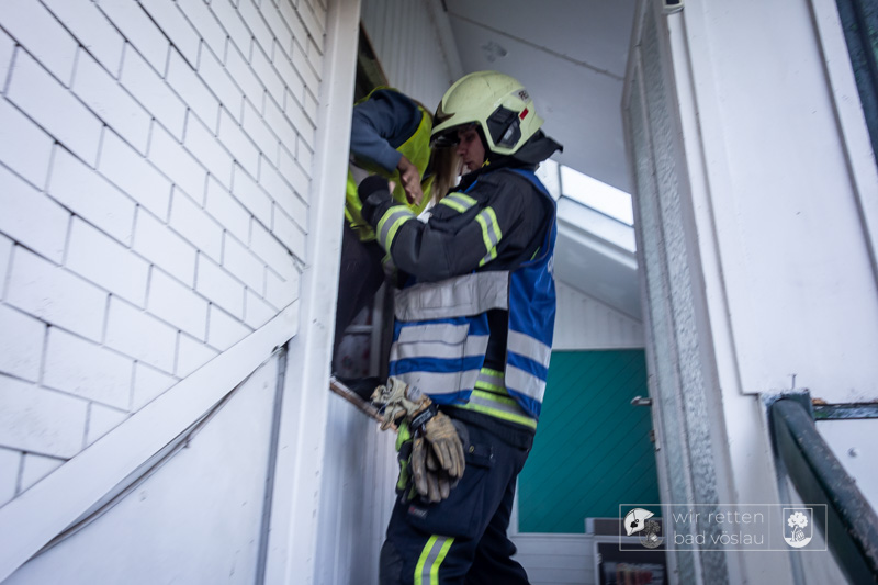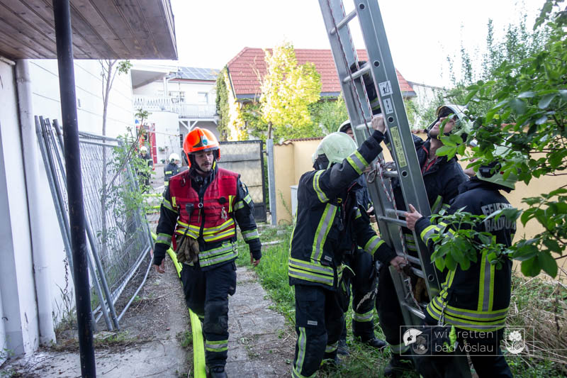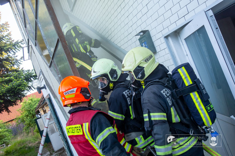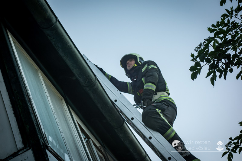 Eine dieser Personen konnte sich auf den Dachboden retten und machte lautstark auf sich aufmerksam. Mit einer zweiteiligen Schiebleiter konnte ein Feuerwehrmitglied zumindest in die Nähe des Hausbewohners gelangen und diesen bis zum Eintreffen des Atemschutztrupps beruhigen.