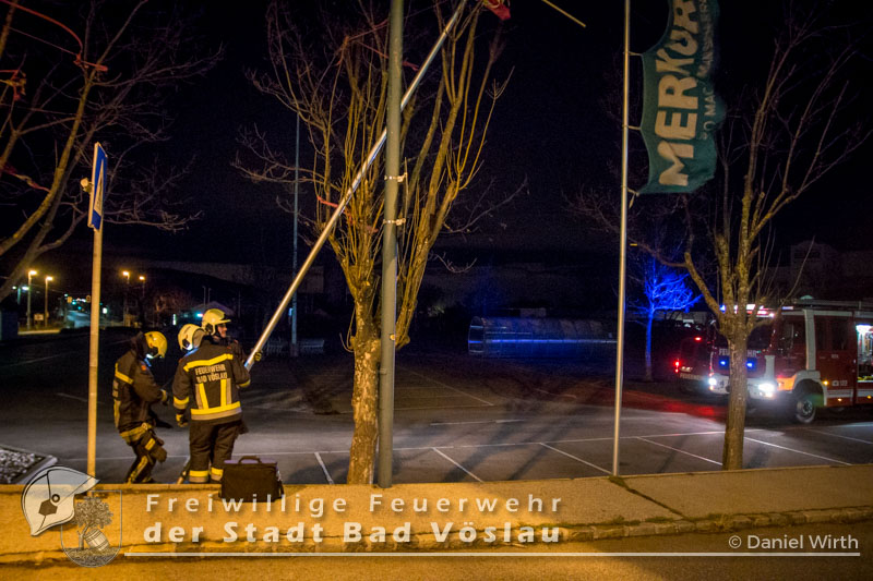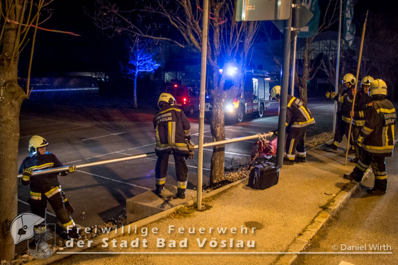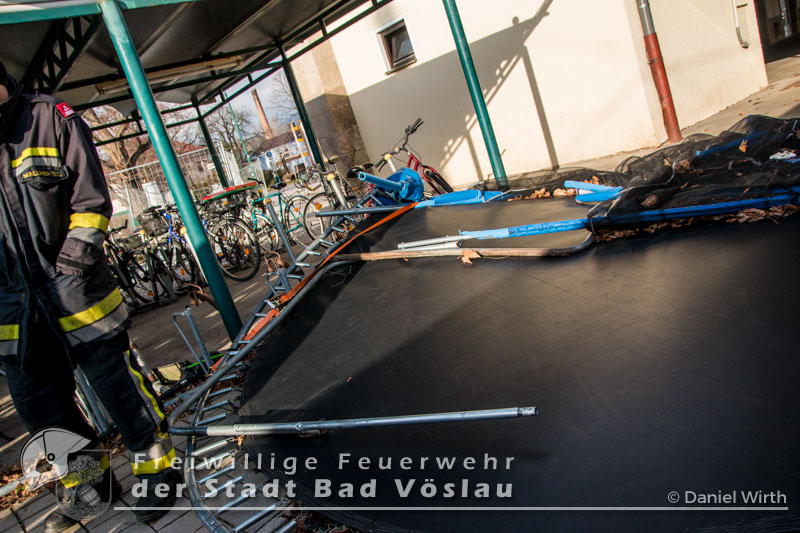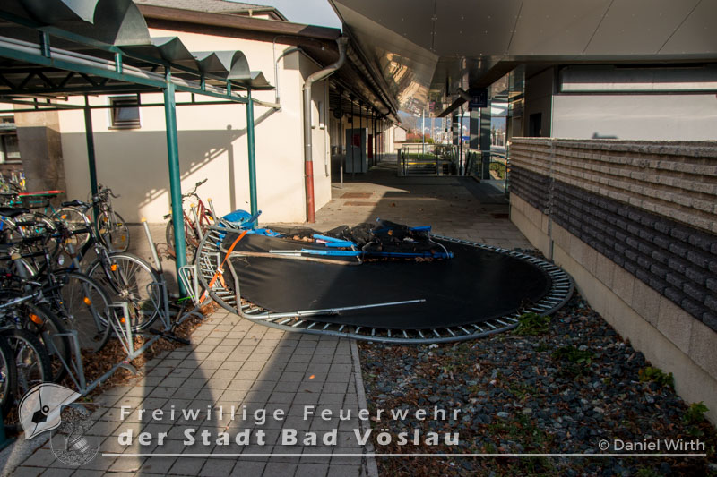 Ein abgehobenes Trampolin wurde gegen 9:30 Uhr bei der Bezirksalarmzentrale Baden gemeldet. Das Sportgerät hatte sich im Bereich des Bahnhofes Bad Vöslau zwischen einer Lärmschutzwand und dem Fahrradabstellplatz verfangen. Noch vor Eintreffen der Feuerwehr wurde das Trampolin provisorisch von Passanten gesichert. Um ein erneutes Abheben zu verhindern, wurde es mit einem Spanngurt gesichert. Nach einer halben Stunde konnte auch dieser, vorerst letzter Einsatz für diesen Tag, beendet werden.