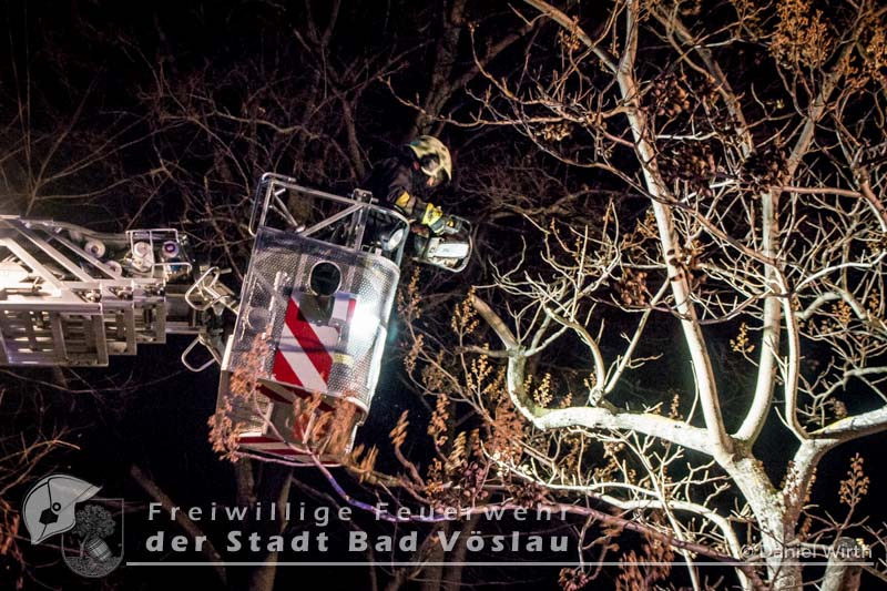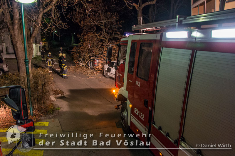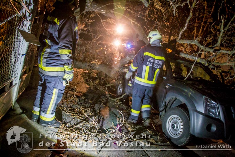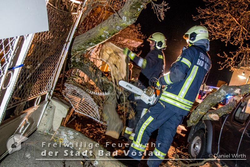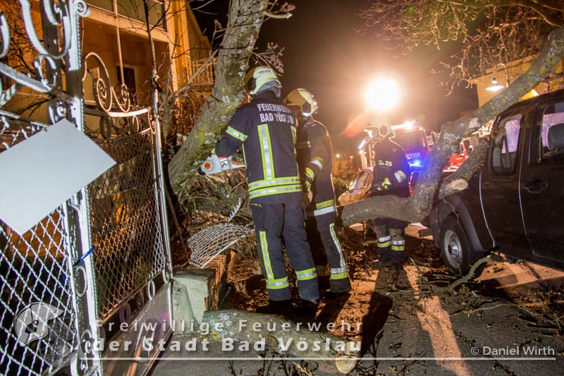Nach erfolgreicher Beendigung dieses Sturmschadens erfolgte sogleich eine neuerliche Alarmierung. Durch den Sturm wurde erneut ein großer Ast eines Baumes abgebrochen, landete auf einem Auto und blockierte sowohl Fahrbahn als auch Gehsteig. Auch hierfür kamen wieder die Kettensägen zum Einsatz. Mit Hilfe der Polizei konnte der Fahrzeugbesitzer aufgefunden werden. Um weiteren Schäden durch herabfallende Äste vorzubeugen, wurde der gesamte Baum vorsorglich umgeschnitten. Nach gut 2 Stunden konnten diese beiden Einsatzstellen als "erfolgreich abgearbeitet" bezeichnet werden.