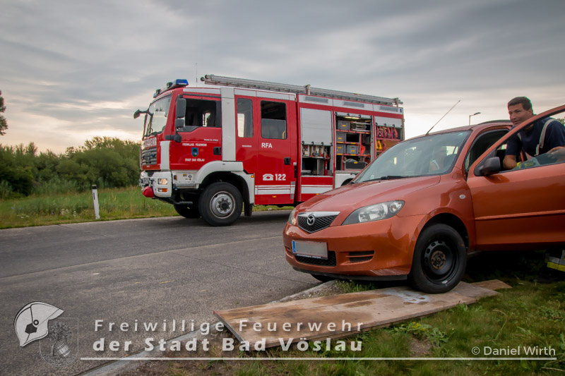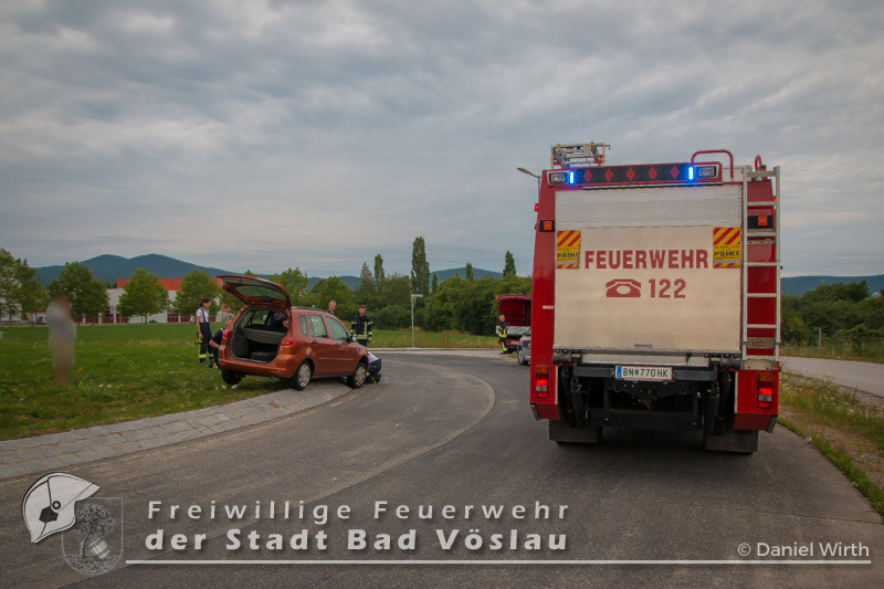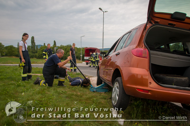 In den Morgenstunden des 23. Juli 2017 kam es am Autobahnzubringer von Bad Vöslau zu einem Verkehrsunfall. Ein PKW fuhr aus noch unbekannter Ursache auf einen Kreisverkehr. Versuche das Fahrzeug selbst zu bergen scheiterten, das Auto saß auf dem Randstein auf. Die Freiwillige Feuerwehr der Stadt Bad Vöslau rückte daher an um den PKW zu bergen. Mit einem Wagenheber und mehreren Schalungstafeln gelang es den freiwilligen Einsatzkräften den PKW ohne weitere Beschädigung aus dem Kreisverkehr zu schieben. Abschließend wurde das Fahrzeug gesichert abgestellt und