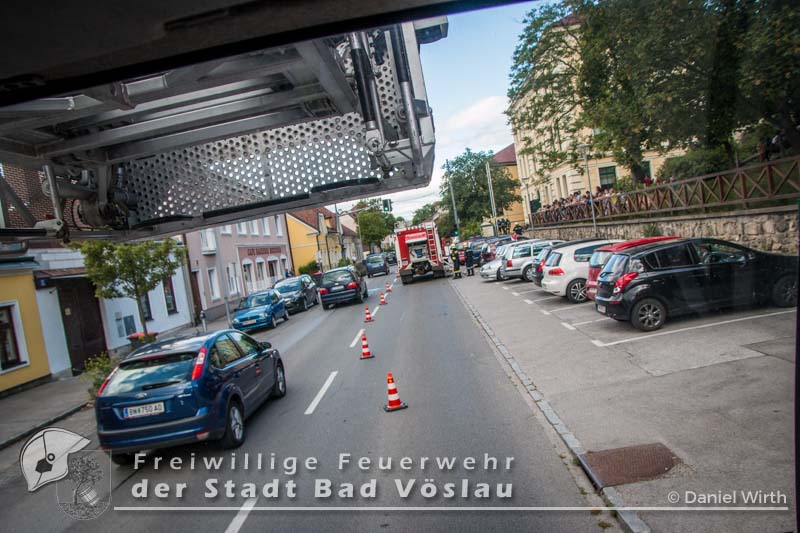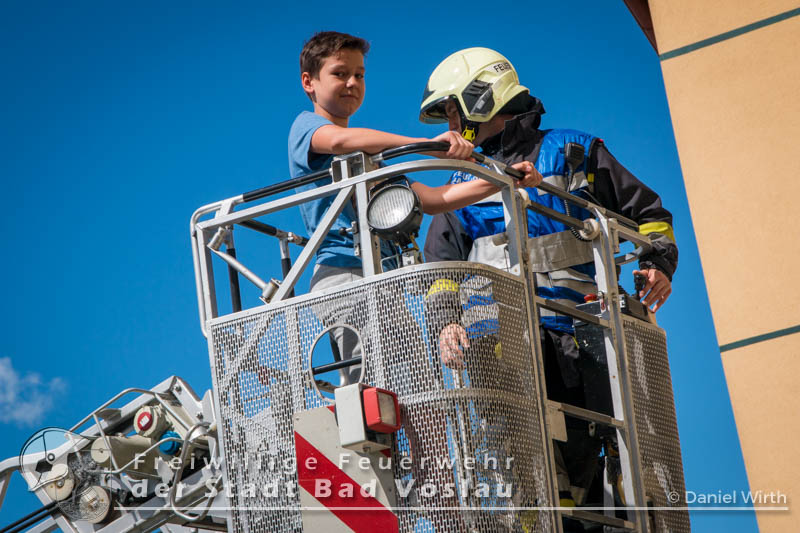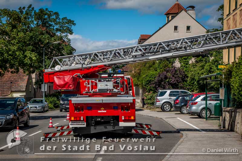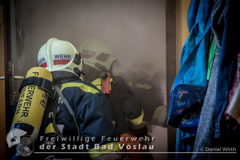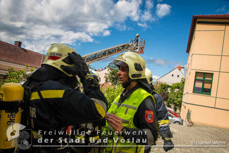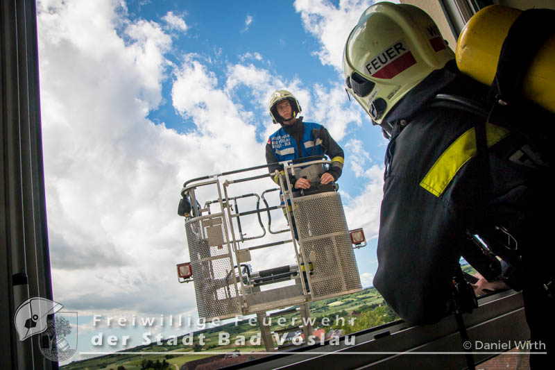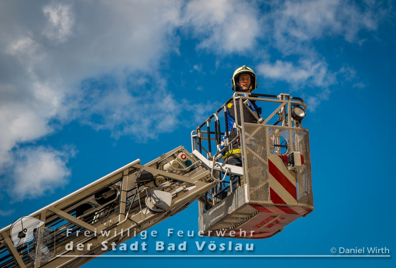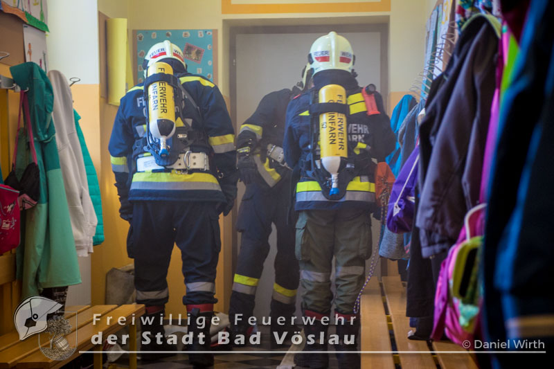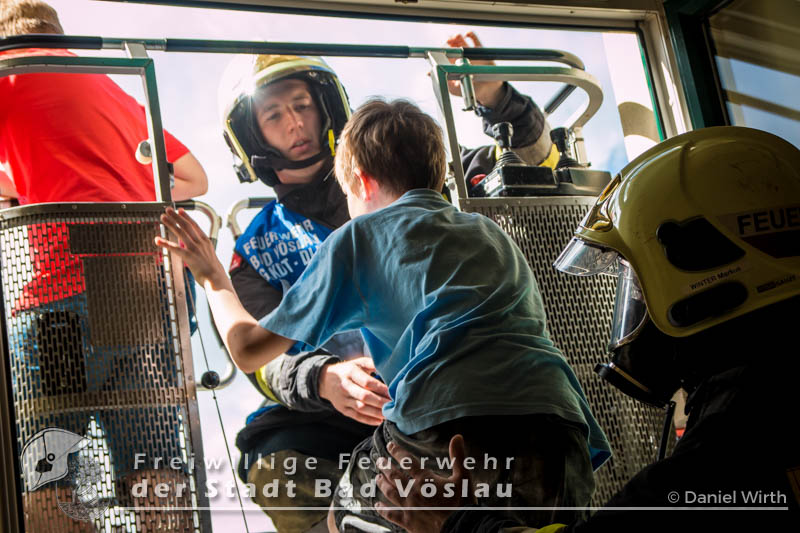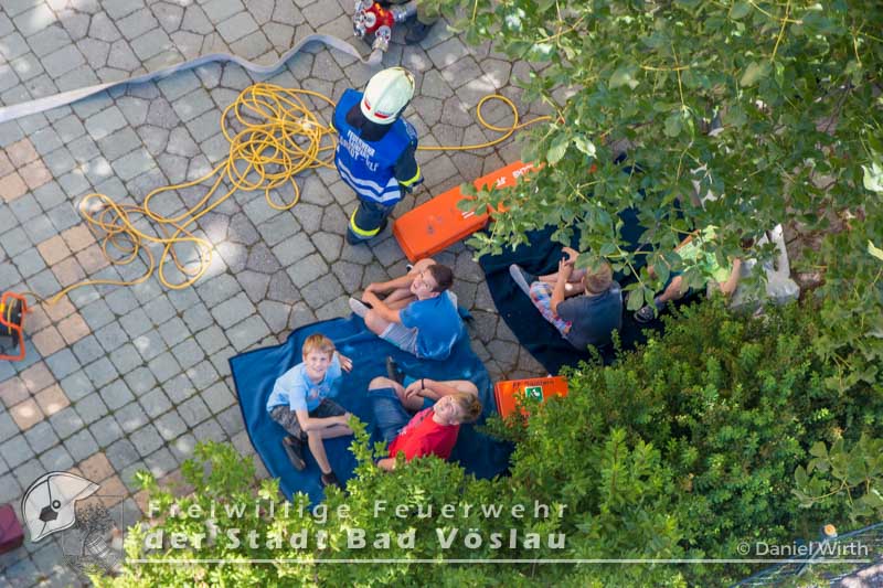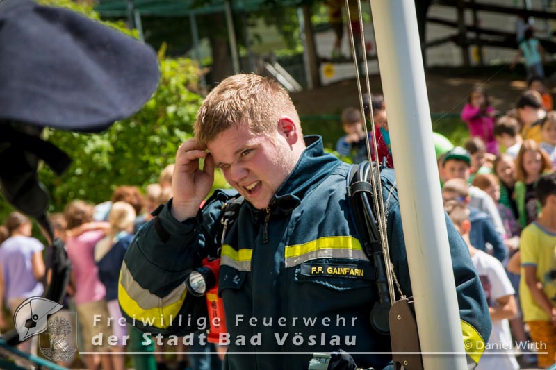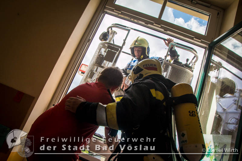 Der 17. Juni 2016 wird vielen Volksschulkindern aus Gainfarn wohl noch länger in Erinnerung bleiben. Gegen 10 Uhr, mitten im Unterricht, brach im 2. Obergeschoss des Schulgebäudes ein Brand aus. Sofort wurde damit begonnen die Schule zu evakuieren. Die meisten Schüler konnten mit ihren Lehrkräften noch vor dem Eintreffen der Feuerwehr aus dem Gebäude flüchten. Nach der Standeskontrolle mit den Klassenbüchern wurde festgestellt das noch 5 Kinder vermisst werden. Sofort wurden zwei Atemschutztrupps der Freiwilligen Feuerwehr Gainfarn zur Menschenrettung vorgeschickt. Von einem Trupp wurde auch noch eine Löschleitung vorgetragen. Nach kurzer Suche konnten zwei Kinder gefunden werden, die mit Fluchtfiltermasken aus dem Gebäude gebracht werden konnten. Im obersten Stockwerk wurden dann noch die restlichen Schüler gefunden. Das Stiegenhaus war allerdings zu diesem Zeitpunkt schon so stark verraucht, dass es als Rettungsweg nicht mehr genutzt werden konnte. Über die Drehleiter der Freiwilligen Feuerwehr der Stadt Bad Vöslau wurden die Kinder aus dem 2. Stock gerettet. Der zweite Atemschutztrupp konnte in der Zwischenzeit den Brandherd finden und ablöschen. Parallel dazu wurde eine Druckbelüftung aufgebaut und eine Abluftöffnung geschaffen um das Stiegenhaus rauchfrei zu machen. Nach einer Stunde konnte diese Übung erfolgreich abgeschlossen werden.