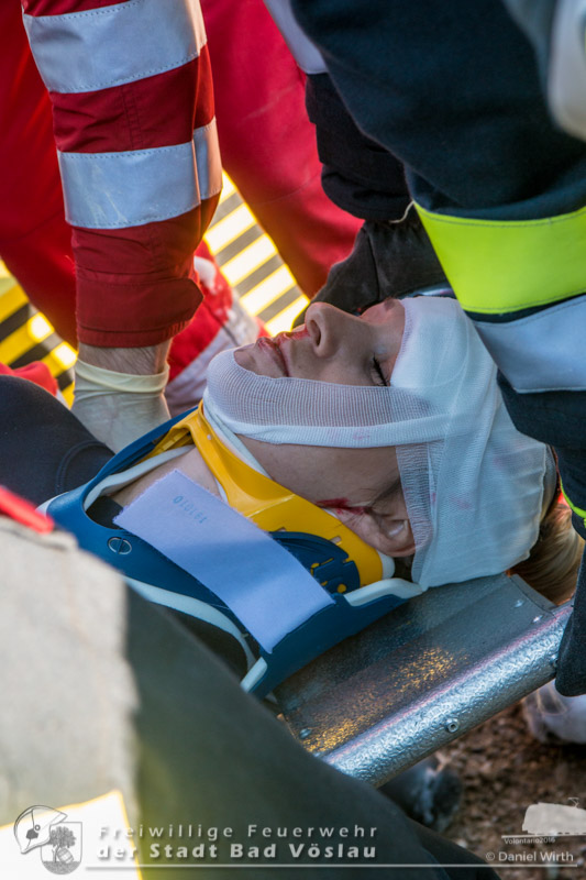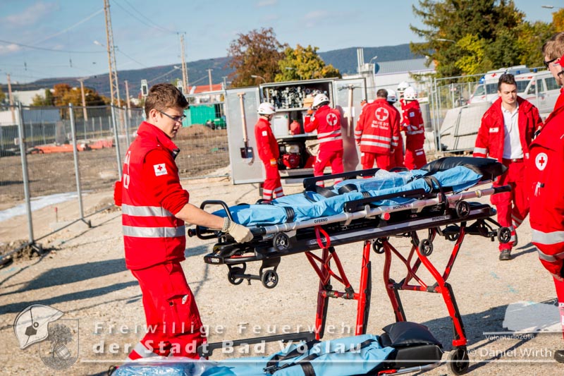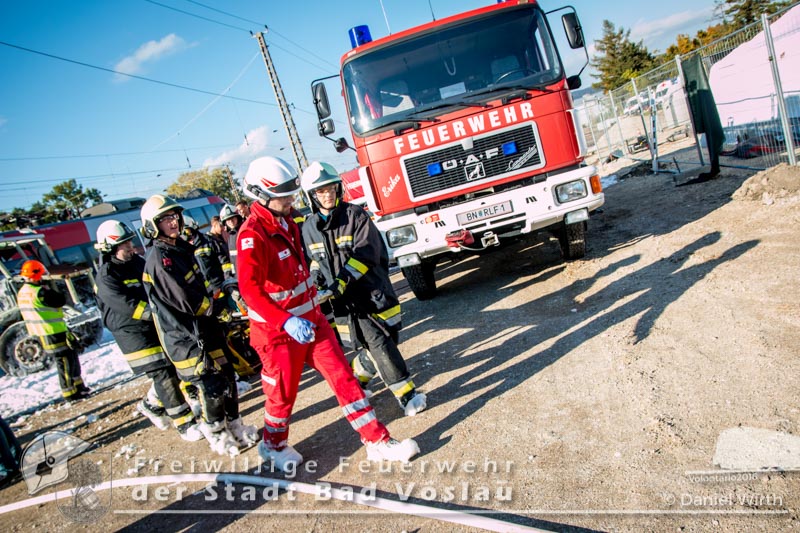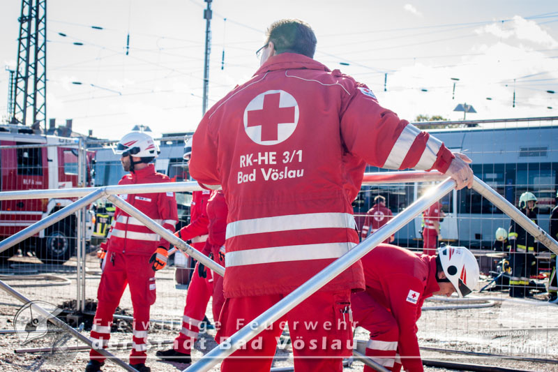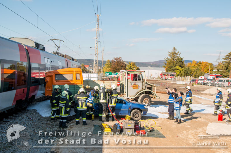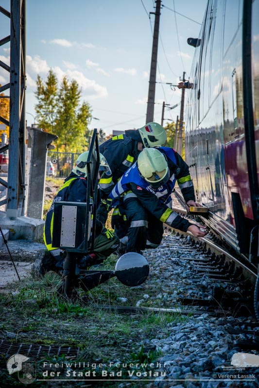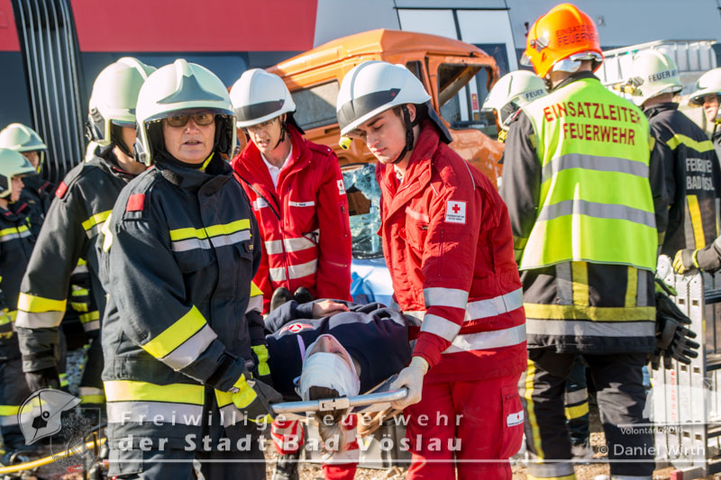 schonend aus dem Fahrzeug gerettet werden konnte. Übungsende. Nach knapp zwei Stunden konnte die Übung erfolgreich beendet werden. Insgesamt nahmen an der Übung 55 Feuerwehrmitglieder der Freiwilligen Feuerwehren Großau, Gainfarn, Bad Vöslau und Sooß, 14 Mitglieder des Roten Kreuz Bad Vöslau und Berndorf, 7 Beamte der Polizei Bad Vöslau und Baden sowie drei Mitarbeiten der Österreichischen Bundesbahnen an der Übung teil. Von den 79 Einsatzkräften mussten 13 verletzte Personen gerettet und versorgt werden. Ein großes Dankeschön ergeht an