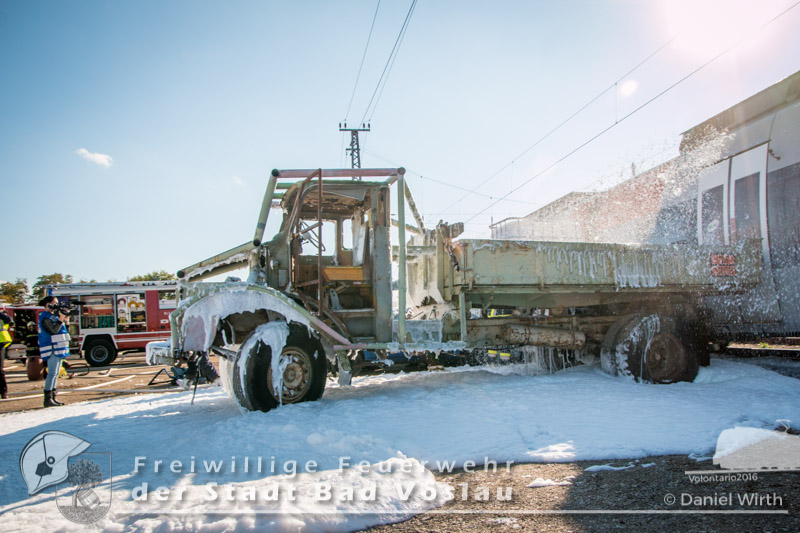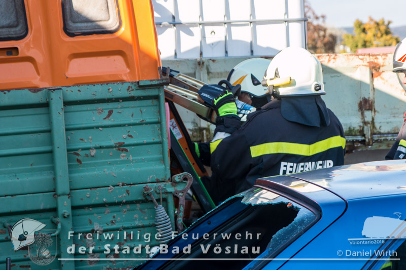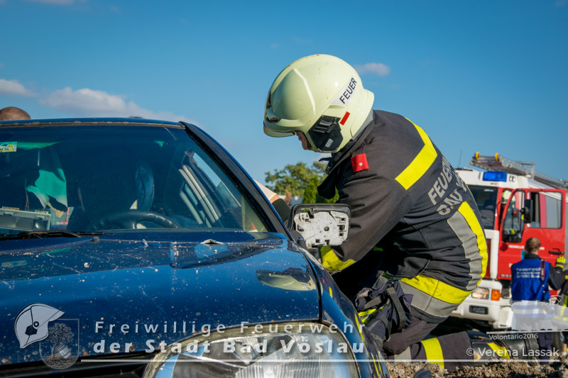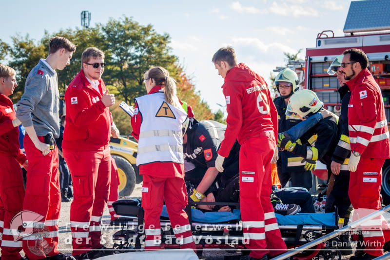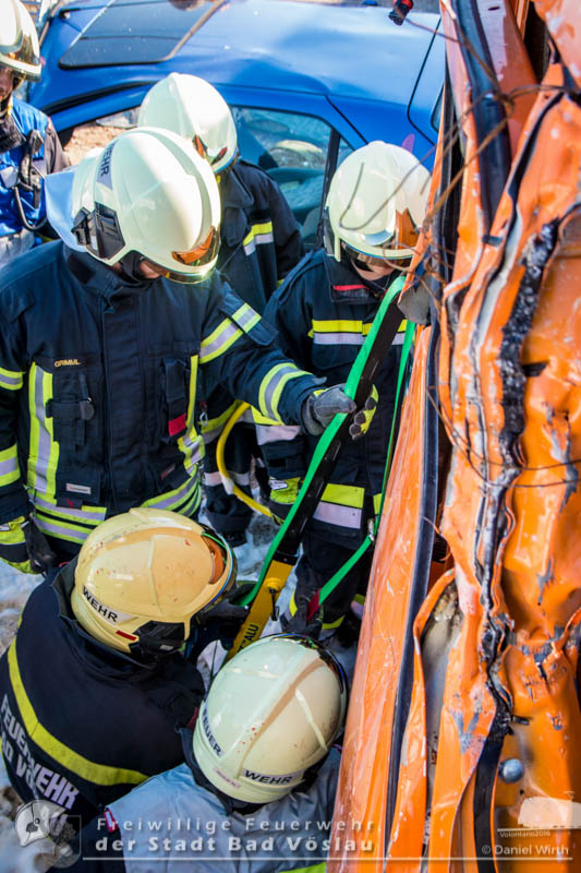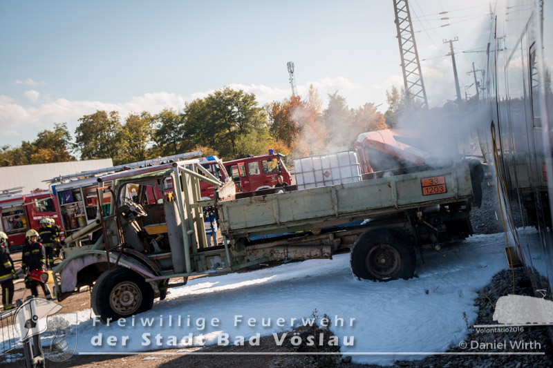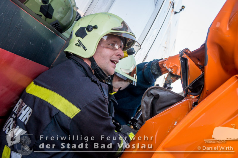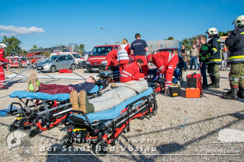 schonend aus dem Fahrzeug gerettet werden konnte. Übungsende. Nach knapp zwei Stunden konnte die Übung erfolgreich beendet werden. Insgesamt nahmen an der Übung 55 Feuerwehrmitglieder der Freiwilligen Feuerwehren Großau, Gainfarn, Bad Vöslau und Sooß, 14 Mitglieder des Roten Kreuz Bad Vöslau und Berndorf, 7 Beamte der Polizei Bad Vöslau und Baden sowie drei Mitarbeiten der Österreichischen Bundesbahnen an der Übung teil. Von den 79 Einsatzkräften mussten 13 verletzte Personen gerettet und versorgt werden. Ein großes Dankeschön ergeht an