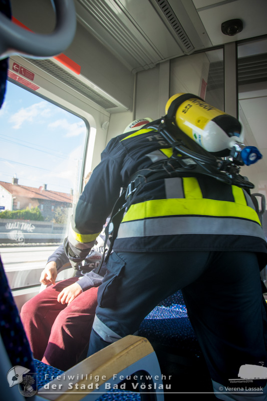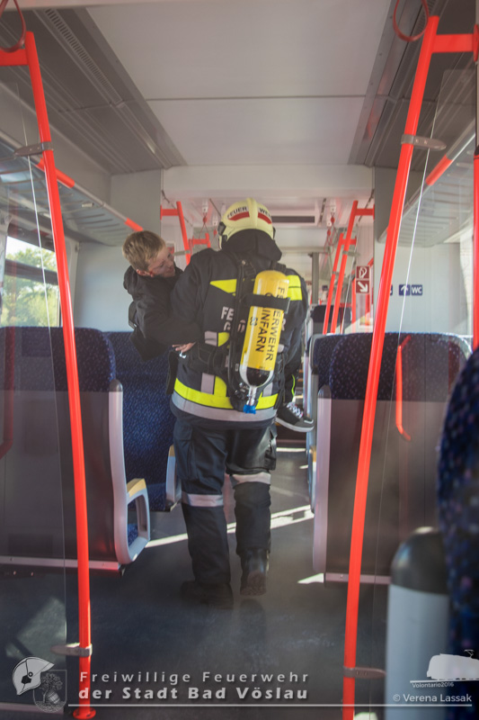 Die Feuerwehren Gainfarn und Großau übernahmen in der Zwischenzeit die Personenrettung aus der Schnellbahn. Beim Betreten des Schienenfahrzeuges vernahmen die Einsatzkräfte lautes Husten und Hilfeschreie, da durch einen Kabelbrand bereits große Teile des Zuges stark verraucht waren. Daher entschied der zuständige Einsatzabschnittsleiter die weitere Rettung unter Atemschutz durchzuführen. Die ebenfalls alarmierte Freiwillige Feuerwehr Sooß unterstützte die vorhandenen Kräfte bei der Menschenrettung aus dem Zug und bei der Beseitigung des auslaufenden Schadstoffes. Weitere Rettungsarbeiten, Einrichten der Sanitätshilfsstelle durch das Rote Kreuz Bad Vöslau und Berndorf.