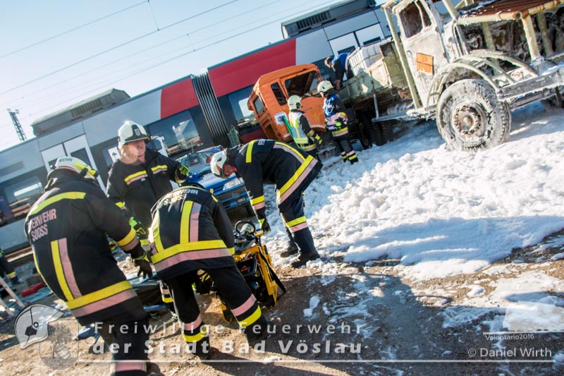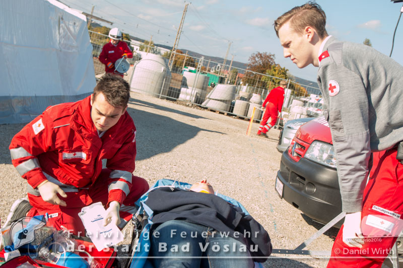 der beiden beschädigten Lastwägen trat eine große Menge des geladenen Benzins aus. Kurz nach dem ersten Feuerwehrfahrzeug traf der erste RTW aus Bad Vöslau ein. Der erste Sanitäter musste sich nun der schwierigen Aufgabe als Einsatzleiter Rotes Kreuz stellen und sich zunächst erstmal einen Überblick über die anfänglich unübersichtliche Situation schaffen. Der Fahrer des Rettungswagens richtete als Leiter Transport einen Sammelplatz für alle weiteren ankommenden Rettungsfahrzeuge ein. Außerdem war er für die Koordination und den späteren Abtransport der Patienten zuständig. Rettungsarbeiten aus der Schnellbahngarnitur.