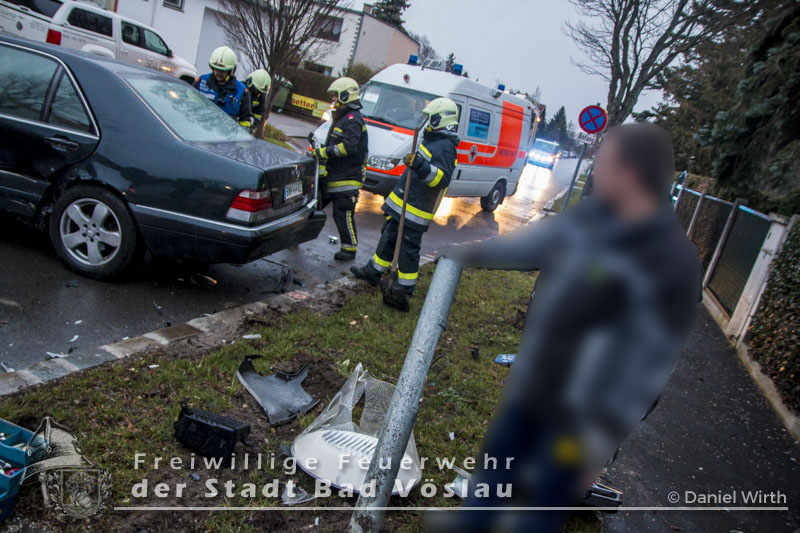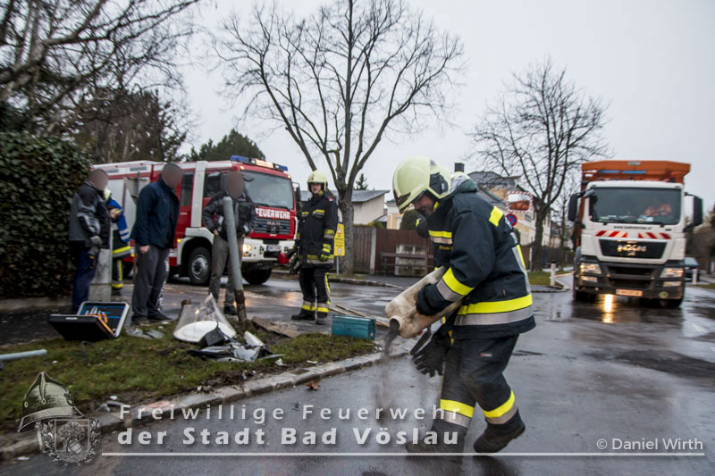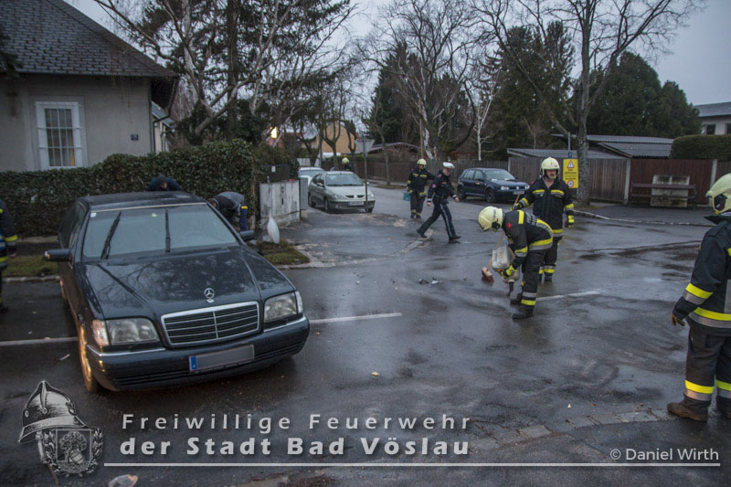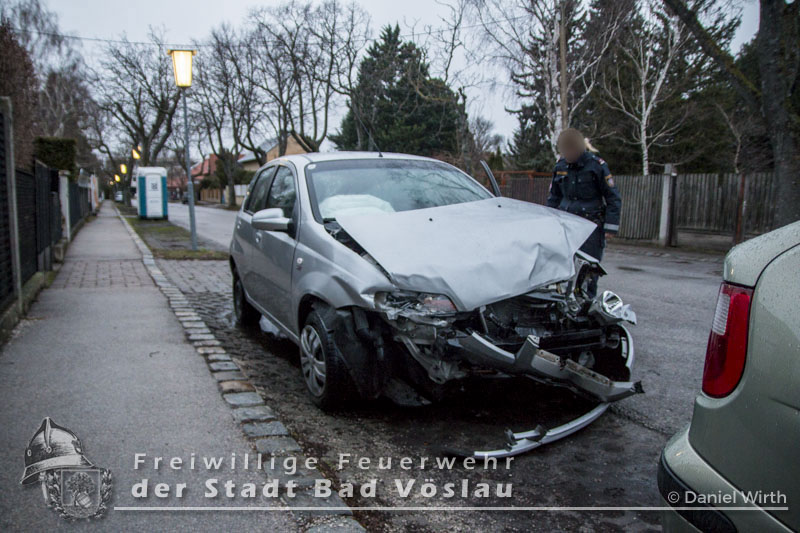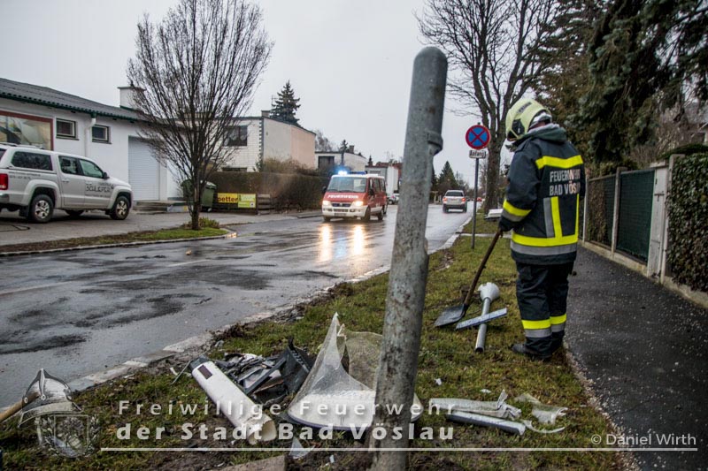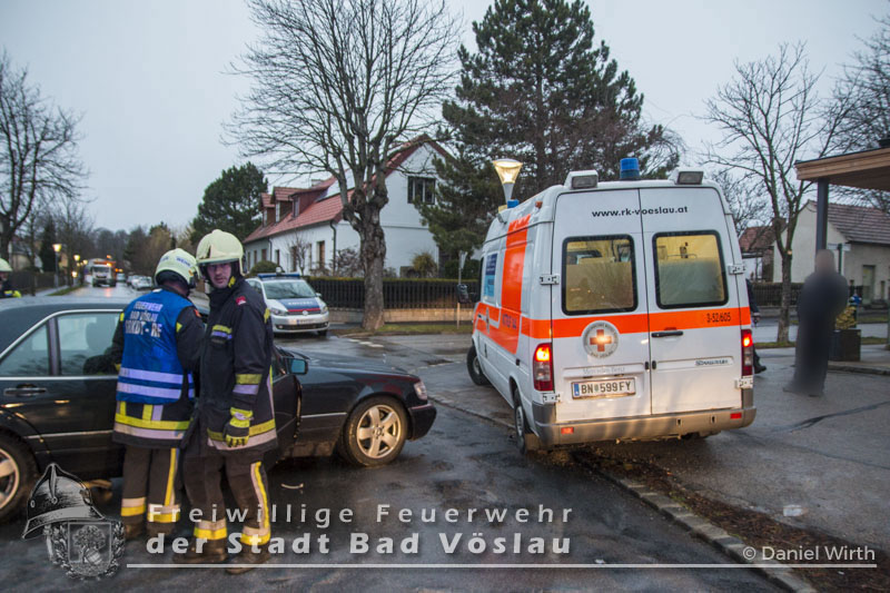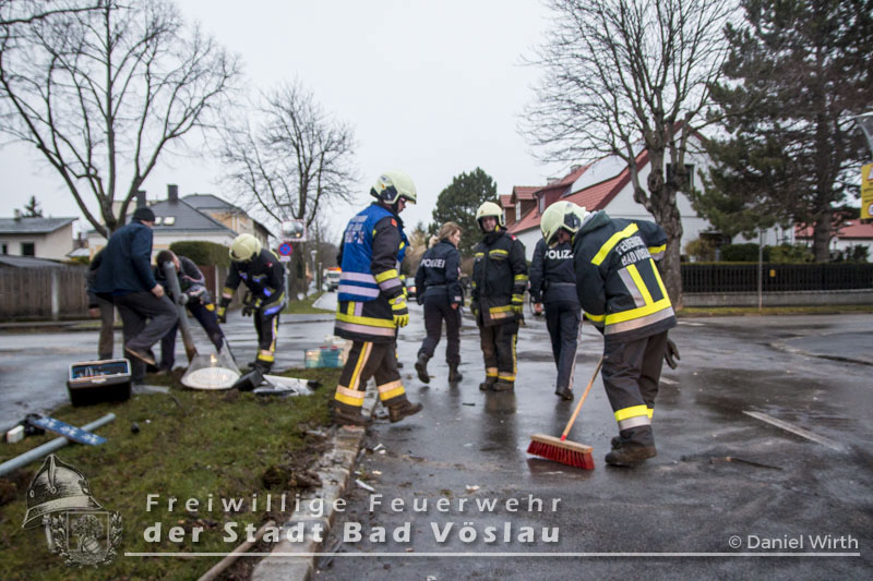 In den Morgenstunden des 10. Februar 2016 kam es im Stadtgebiet von Bad Vöslau zu einem Verkehrsunfall bei dem eine Person verletzt wurde. Aus bislang unbekannter Ursache stießen zwei Fahrzeuge im Kreuzungsbereich zusammen, durch die Wucht des seitlichen Aufpralles wurde ein PKW zur Seite geschleudert und knickte eine Straßenlaterne um. Von der Freiwilligen Feuerwehr der Stadt Bad Vöslau wurde zunächst die Unfallstelle abgesichert und ein Brandschutz aufgebaut. Der Rettungsdienst traf gleichzeitig mit der Feuerwehr ein, versorgte den verletzten Fahrzeuglenker und brachte ihn in ein Krankenhaus. Von den Feuerwehreinsatzkräften mussten die beiden Fahrzeuge