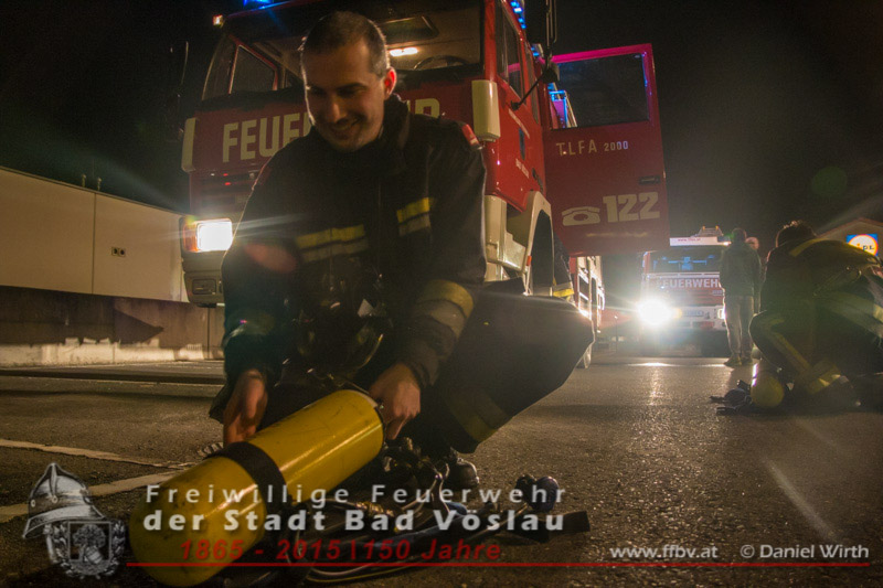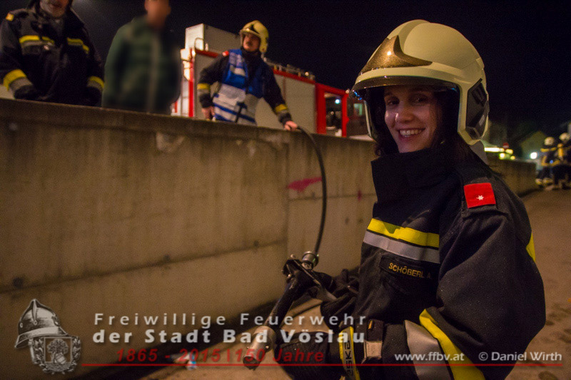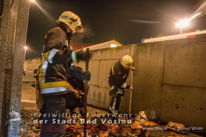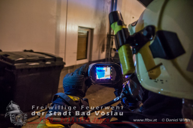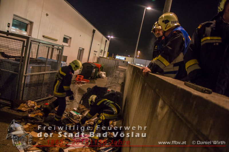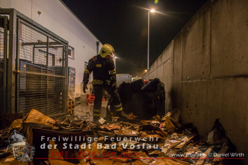Kunden eines Supermarktes bemerkten den Brand und wählten den Feuerwehrnotruf 122, kurz darauf wurde von diensthabenden Disponenten die Freiwillige Feuerwehr der Stadt Bad Vöslau zum Brandeinsatz alarmiert. Schon während der Anfahrt des Tanklöschfahrzeuges begann ein Trupp mit dem Anlegen der umluftunabhängigen Atemschutzgeräte. An der Einsatzstelle angekommen schlugen die Flammen bereits aus der Mülltonne, der Atemschutztrupp begann sofort mit der Brandbekämpfung und nahm ein Rohr vor. Kurze Zeit später waren die Flammen niedergeschlagen und der Mistkübel wurde von der Fassade des angrenzenden Gebäudes weggezogen. Daraufhin wurde die zum Teil zerschmolzene Tonne ausgeräumt um auch an die letzten Glutnester zu gelangen. Mit einer Wärmebildkamera und einem Hochdruckrohr wurden noch Nachlöscharbeiten durchgeführt. Nachdem die Fahrzeuge wieder aufgerüstet und die Wassertanks wieder aufgefüllt waren konnten die freiwilligen Helfer wieder den Heimweg antreten. Bericht & Fotos: Daniel WirthBeitrag erstellt am: 05. Februar 2015