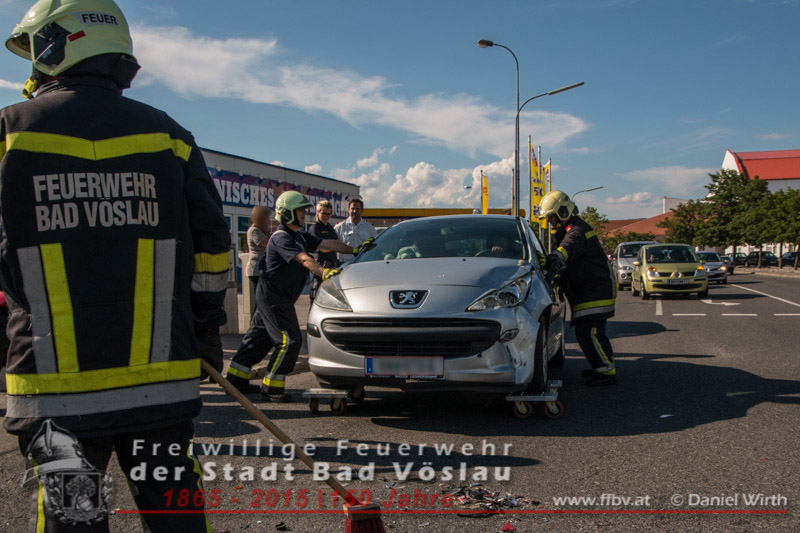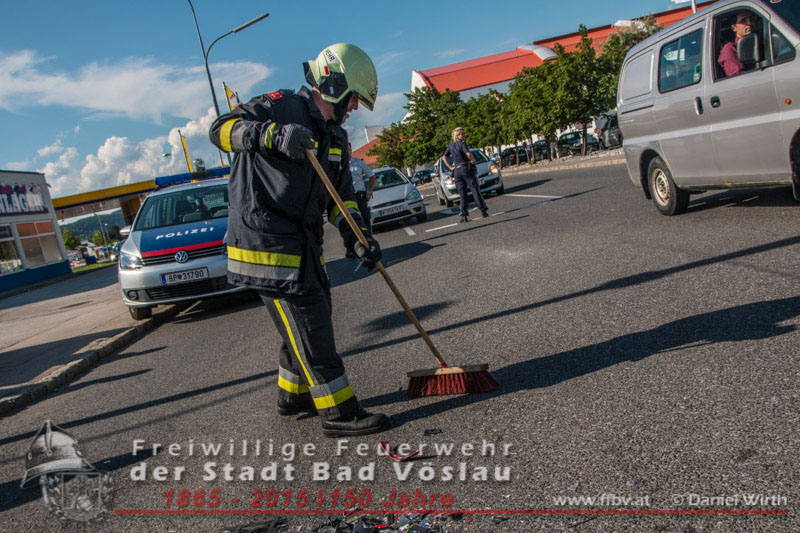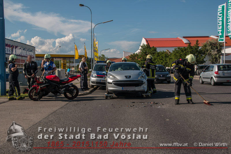 In den Nachmittagsstunden des 02.06.2015 kam es im Stadtgebiet von Bad Vöslau zu einem Verkehrsunfall. Ein Motorrad prallte aus unbekannter Ursache seitlich gegen einen PKW. Die beiden Sanitäter eines vorbeifahrenden Krankentransportwagens des Roten Kreuzes Bad Vöslau wurden Zeugen des Unfalles und hielten sofort an um die Unfallstelle abzusichern und um eventuell verletzte Personen zu versorgen. Zum Glück wurde bei dem spektakulären Zusammenstoß weder der Motorradfahrer noch die Fahrzeuglenkerin verletzt. Die beiden beschädigten Fahrzeuge mussten von den freiwilligen Feuerwehreinsatzkräften aus dem Kreuzungsbereich geschoben werden. Abschließend wurde der PKW gesichert abgestellt und die Fahrbahn von Trümmerteilen gereinigt. Nach einer guten halben Stunde konnte der Einsatz erfolgreich abgeschlossen werden. Fotos und Bericht: Daniel Wirth, SB ÖABeitrag erstellt am: 04.06.2015