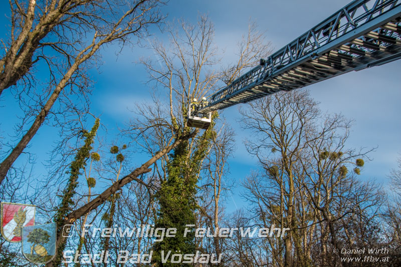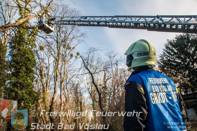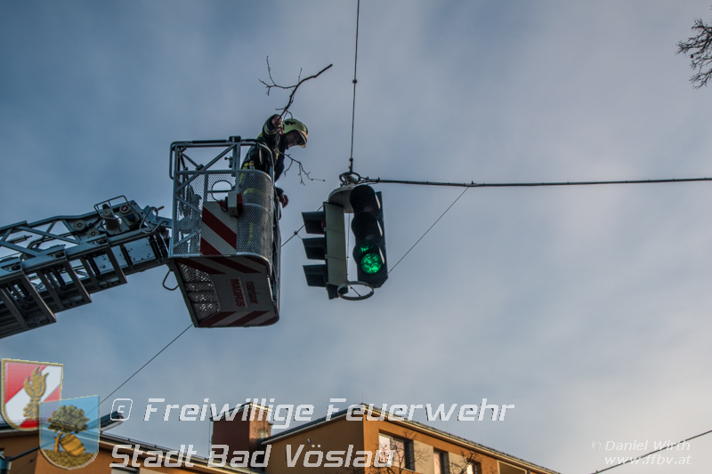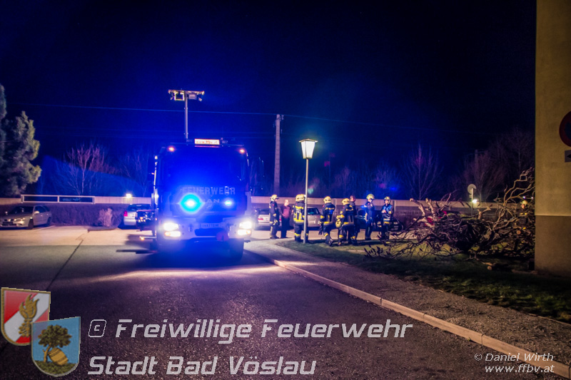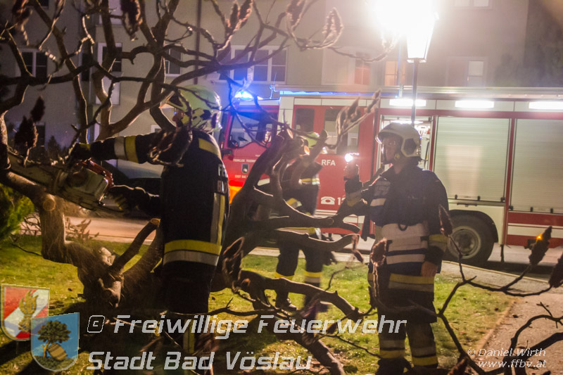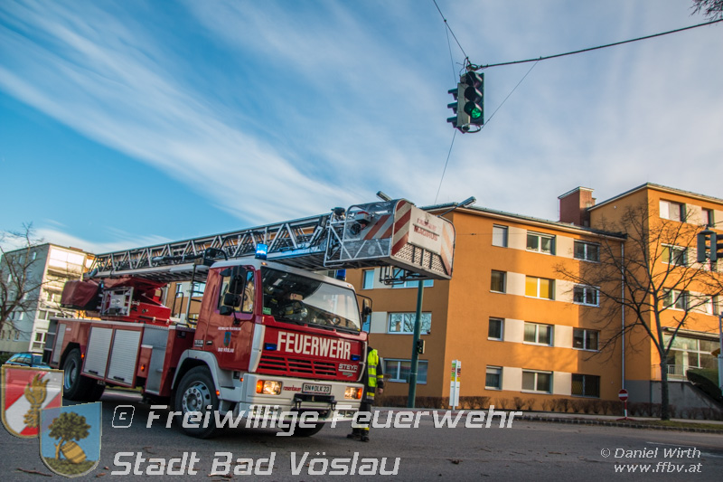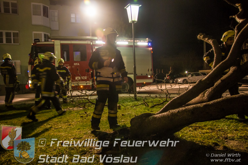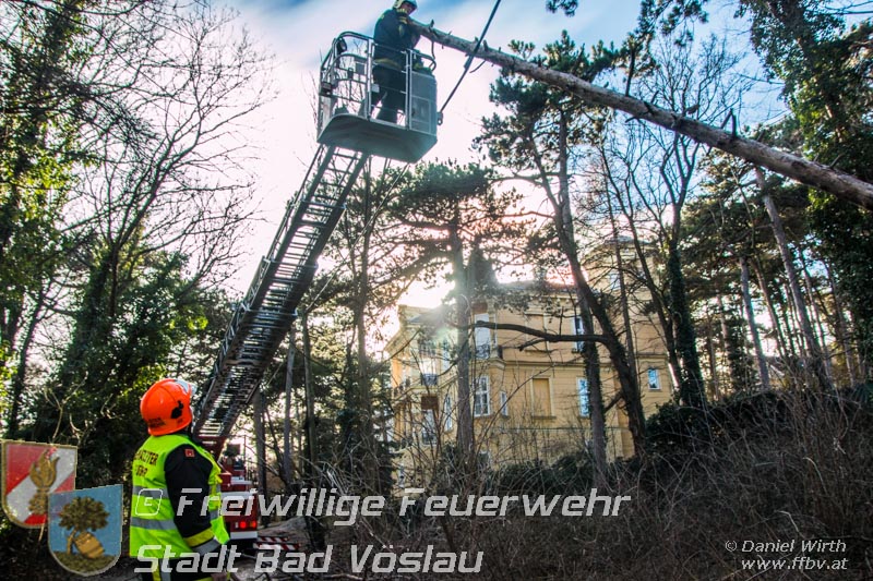 Sturmtief Felix - 7 wetterbedingte Einsätze für die Feuerwehr Bad Vöslau... Am 10. Jänner 2015 kam es in Niederösterreich zu unzähligen wetterbedingten Einsätzen. Sturmtief Felix fegte mit Böen von bis zu 100km/h über das Land und knickte Bäume um oder deckte beispielsweise Dächer ab. In Bad Vöslau kam es zu 7 wetterbedingten Einsätzen. Begonnen hat der Einsatzmarathon gegen 13 Uhr mit einem umgeknickten Baum welcher auf einer Stromleitung zu liegen kam. Von der Freiwilligen Feuerwehr wurde die Straße unter dem hängenden Baum abgesperrt. Nach Verständigung des Energieversorgers wurde der Baum mit der Drehleiter vorsichtig von der Leitung entfernt. Parallel dazu wurde ein umgestürzter Baum gemeldet welcher auf einem Haus liegen soll. Die Erkundung durch den Einsatzleiter ergab jedoch, dass es sich hierbei um eine Falschmeldung handelte. Ein umgestürzter Zaun beschäftigte im Anschluss die Besatzung des Rüstfahrzeuges, dieser wurde wieder aufgestellt und gesichert. Ins Feuerwehrhaus schafften es die Fahrzeuge nicht, zuvor musste noch in Kottingbrunn ein umgeknickter Baum, welcher in einer Astgabel festhing, mit Hilfe der Drehleiter umgeschnitten werden. Zurück aus Kottingbrunn blieb es bei einem Einparkversuch der Einsatzfahrzeuge bevor die Stadtgemeinde einen Ast auf einer Ampelanlage meldete. Der Verkehr auf der Kreuzung musste kurz angehalten werden bevor die Drehleiter in Stellung gebracht werden konnte und der Ast von der Ampel entfernt wurde. In den Abendstunden folgten nochmals 2 Einsätze bei denen, vom Sturm umgelegte, Bäume mit einer Kettensäge zerlegt werden mussten um die Verkehrswege und Gehsteige wieder freizumachen. In den frühen Abendstunden konnten sämtliche Einsätze