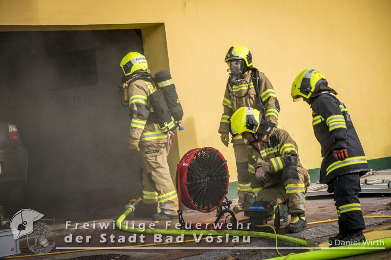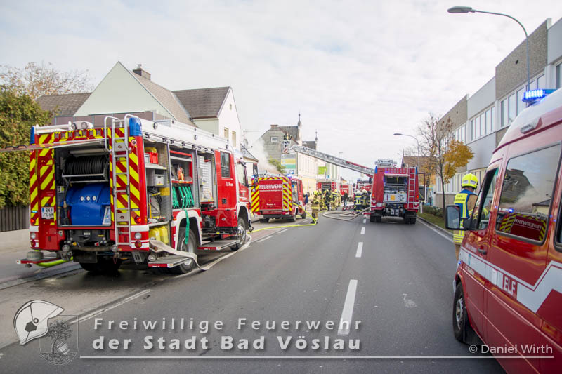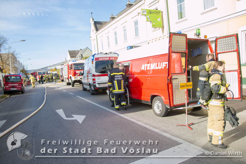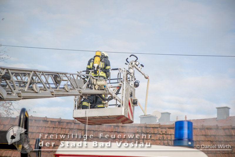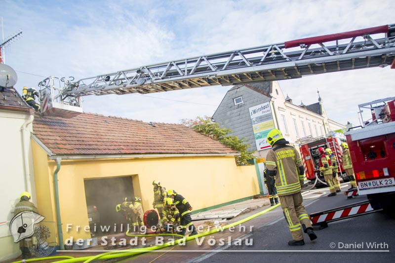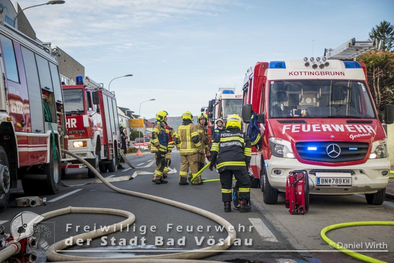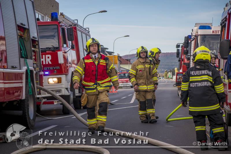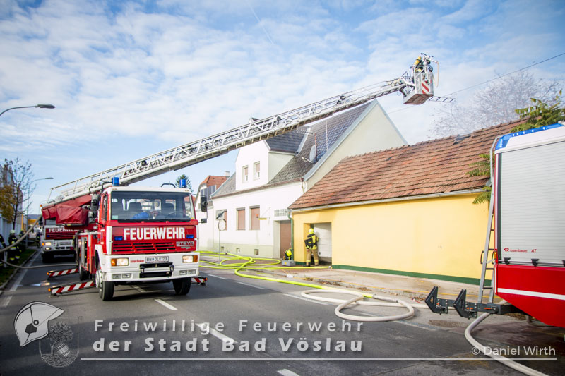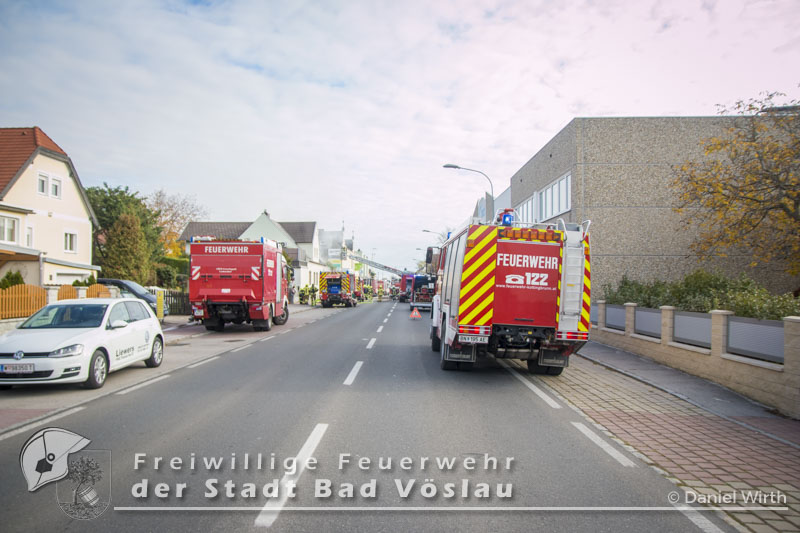 Am 01.11.2016 gegen 09:30 Uhr heulten in Kottingbrunn, Leobersdorf, Schönau an der Triesting und Bad Vöslau die Sirenen. Grund dafür war ein Dachstuhlbrand einer Garage in der Hirtenberger Straße. Bei der Anfahrt konnten schon Rauchschwaden entdeckt werden, auch aus den Dachziegel drang bereits dichter Rauch. Vom ersteintreffenden Rüstlöschfahrzeug Leobersdorf wurde eine Angriffsleitung für den Atemschutztrupp aufgebaut. Gemeinsam mit dem Atemschutztrupp des HLF 1 Kottingbrunn drang der Atemschutztrupp des Rüstlöschfahrzeuges Leobersdorf zum Brandobjekt vor und konnte das Garagentor ein wenig öffnen. Mit gezielten Wasserstößen konnten die Flammen im Inneren in Schach gehalten werden, ehe das Tor entfernt wurde. Sofort begaben sich die Atemschutztrupps ins Innere vor und begannen mit der Brandbekämpfung. Über die Drehleiter Bad Vöslau wurde eine Brandbekämpfung über das Dach auf der Straßenseite vorgenommen, indem mehrere Dachziegel entfernt wurden. Vom Einsatzleitfahrzeug Kottingbrunn wurde in der Zwischenzeit die Einsatzleitung aufgebaut und besetzt. Über den Innenhof wurde ein Atemschutztrupp zur Brandbekämpfung auf das Dach geschickt, welcher ebenfalls begann die Dachziegel zu entfernen. Die angrenzende PKW-Garage wurde aufgebrochen um eine Kontrolle dieses Raumes zu ermöglichen. Aufgrund der vielen Atemschutztrupps wurde vom Atemluftfahrzeug Bad Vöslau mit der Unterstützung der Pumpe Schönau/Triesting ein Atemschutzsammelplatz aufgebaut und die verbrauchten Atemluftflaschen aufgefüllt. Das Nachbarobjekt wurde inzwischen von einem Atemschutztrupp durchsucht und es konnte in einem Zimmer Rauch festgestellt werden. Unverzüglich wurde für dieses Objekt eine Druckbelüftung aufgebaut und das Haus somit rauchfrei gemacht. Da sich in der brennenden Garage viele Lacke und Öle befanden wurde das ablaufende Löschwasser mit diesen Stoffen kontaminiert. Um ein verschmutzen des Kanales zu verhindern wurde ein Kanalabdeckbehälter über den Kanal im Innenhof aufgebaut. Nachdem Brand Aus gegeben werden konnte wurde die beschädigte Garage gepölzt um ein Einstürzen dieses Objektes zu verhindern. Abschließend wurde das kontaminierte Löschwasser, in Absprache mit dem Schadstoffberatungsdienst der Feuerwehr Hirtenberg in einen Tankbehälter gesaugt und entsprechend entsorgt. Insgesamt standen bei diesem Brand 106 Einsatzkräfte, davon 92 Feuerwehrmitglieder im Einsatz. Bericht Melanie Deli, FF KottingbrunnFotos: Daniel Wirth, SB ÖA Beitrag erstellt am: 26.10.2016