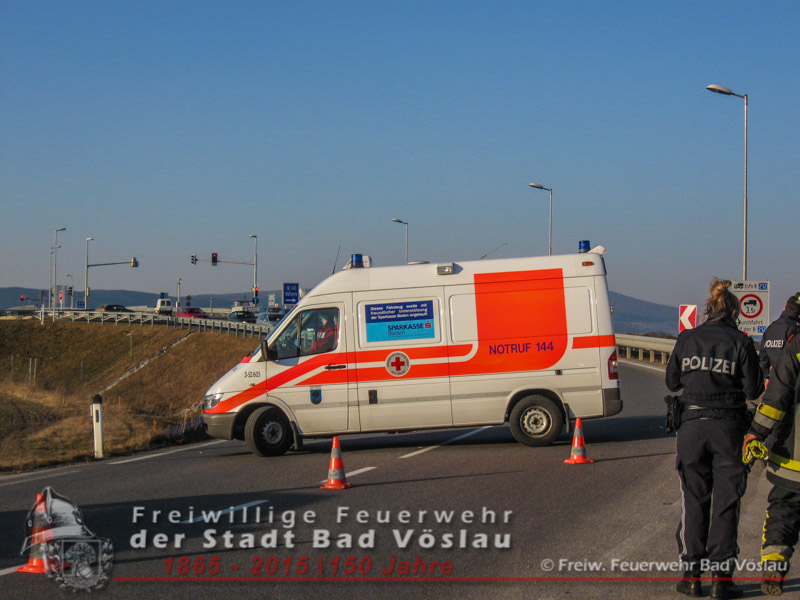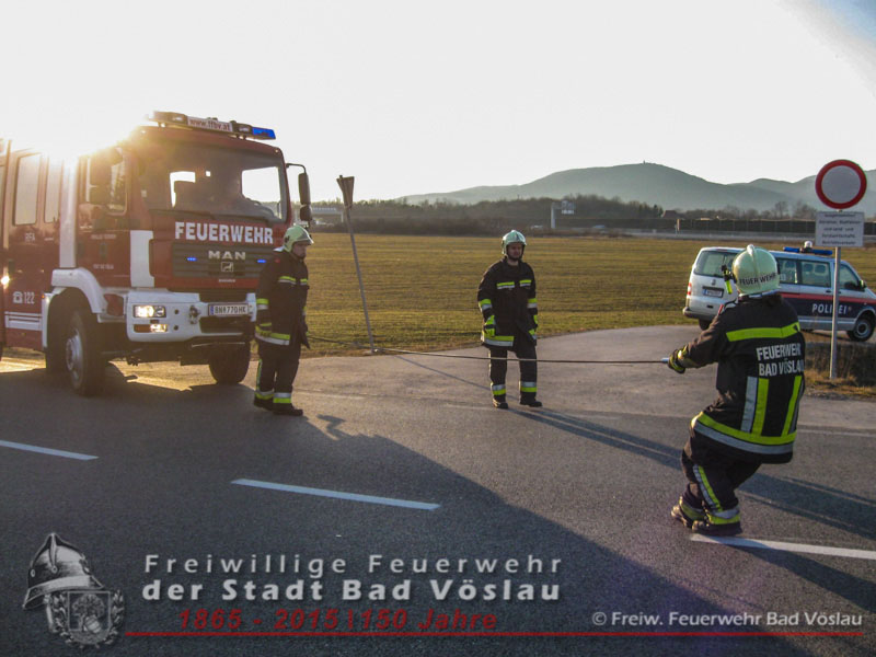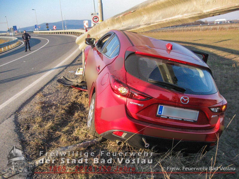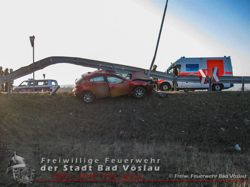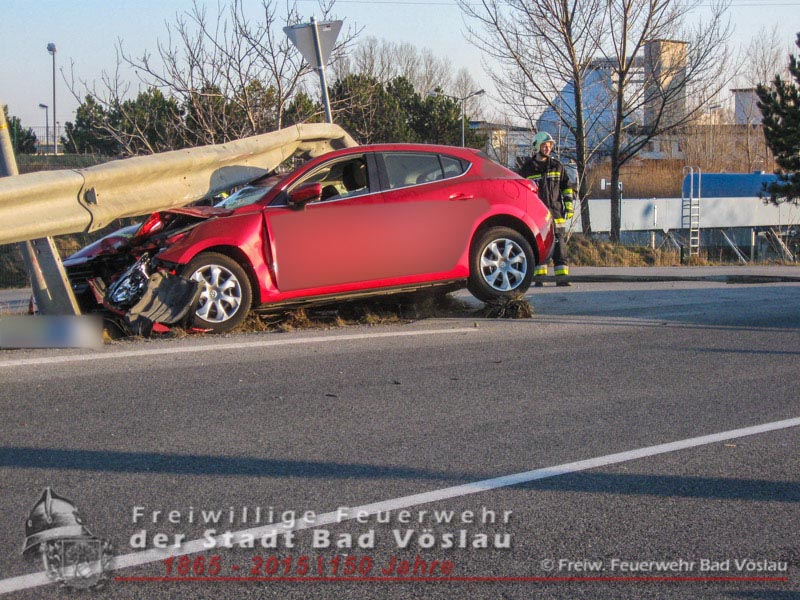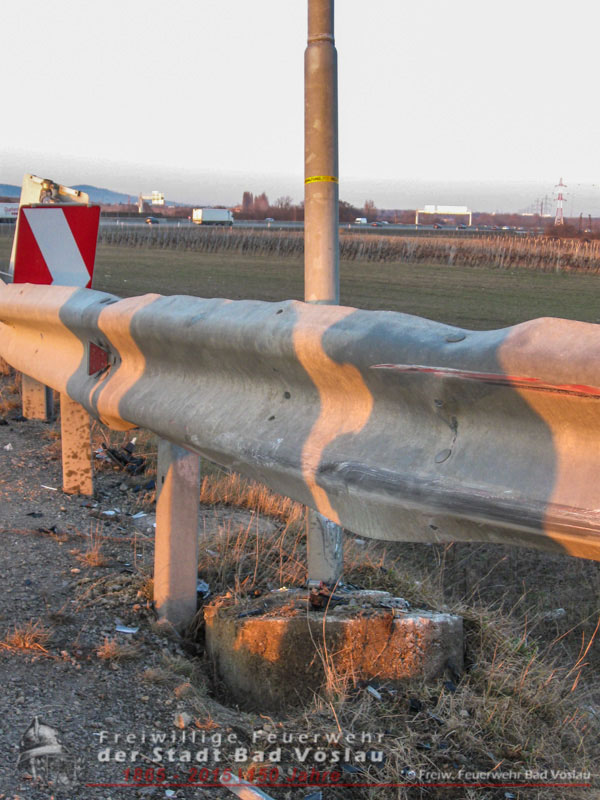 In den Nachmittagsstunden des 16. Februar 2015 wurde die Freiwillige Feuerwehr der Stadt Bad Vöslau durch die Bezirksalarmzentrale Baden zu einem Verkehrsunfall auf dem Autobahnzubringer alarmiert. Umgehend rückte das erste Gruppenfahrzeug zur Unfallstelle aus, dort eingetroffen stellten die Freiwilligen Einsatzkräfte folgende Lage fest. Ein PKW steckt unter der Leitschiene in einer Kurve, hinter der Leitschiene ging es rund 3 Meter steil bergab. Die Lenkerin war bereits aus dem Fahrzeug befreit und wurde von Ersthelfern bis zum Eintreffen des Roten Kreuzes Bad Vöslau betreut. Mit Verletzungen unbestimmten Grades wurde die Fahrerin von den Rettungskräften in ein umliegendes Krankenhaus gebracht. Für die Bergung des Fahrzeuges musste die Fahrbahn komplett gesperrt werden, mit der Seilwinde des Rüstfahrzeuges wurde das Auto aus der Leitschiene gezogen und anschließend einem privaten Abschleppdienst übergeben. Der Kraftstofftank des Unfallfahrzeuges wurde durch den Aufprall beschädigt, der auslaufende Dieselkraftstoff wurde in speziellen Wannen aufgefangen. Die Fahrbahn musste anschließend mit Ölbindemittel gereinigt werden. Nach knapp 2 Stunden im Einsatz konnte der Autobahnzubringer wieder voll für den Verkehr freigegeben werden. Fotos: Conrad FiedorowicBericht: Daniel Wirth Beitrag erstellt am: 17. Februar 2015
