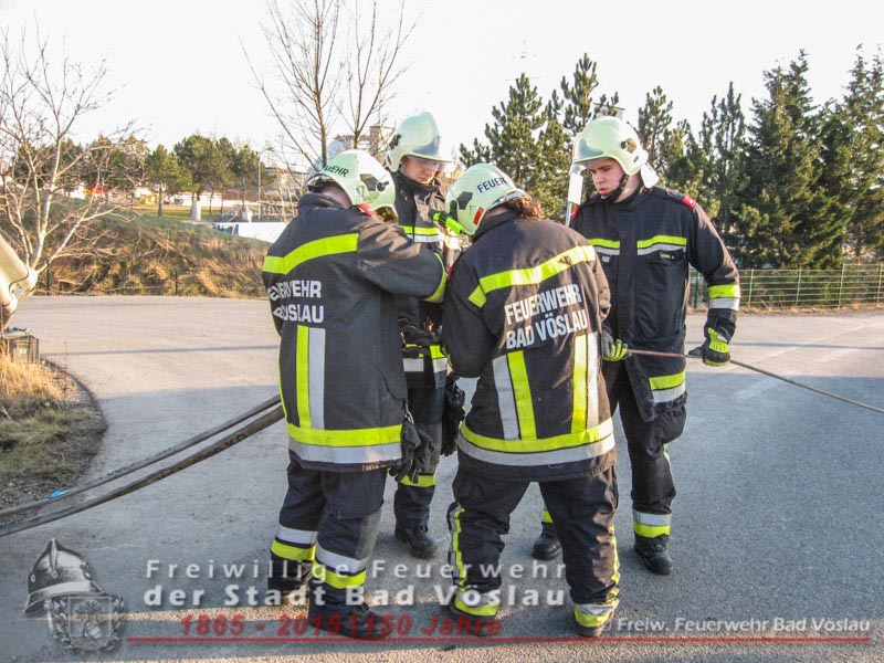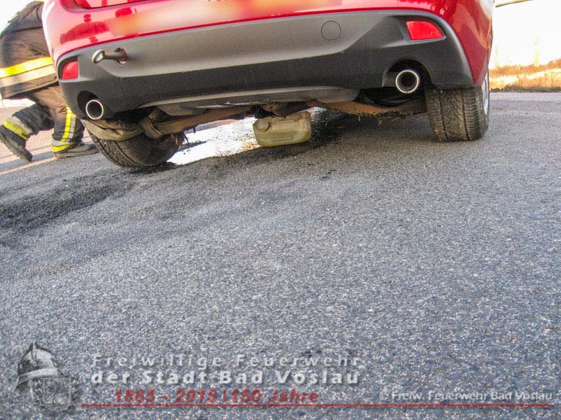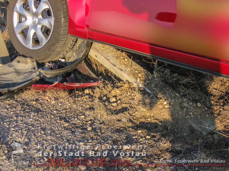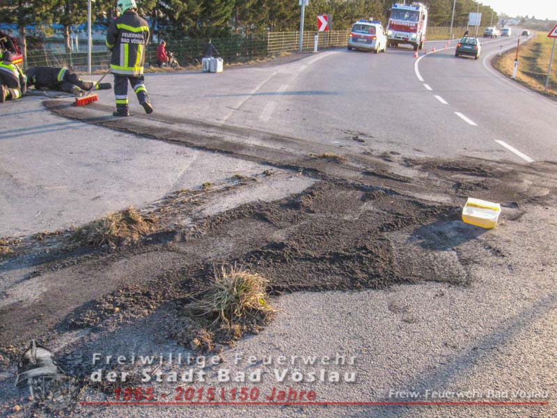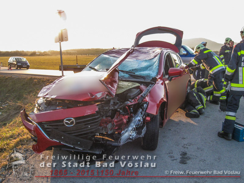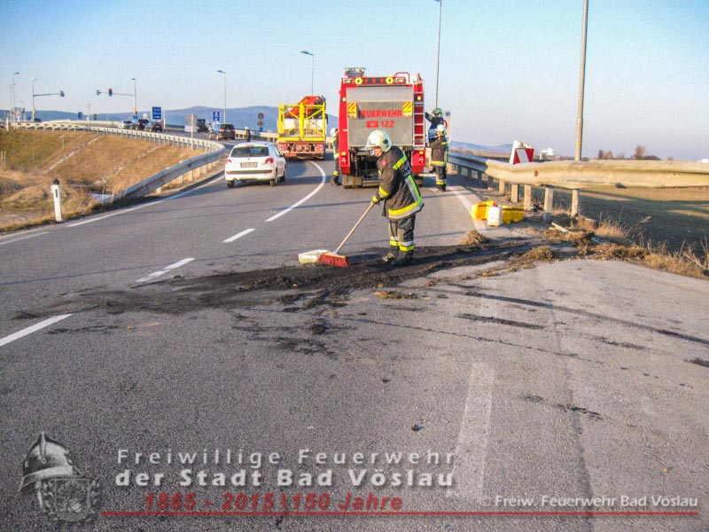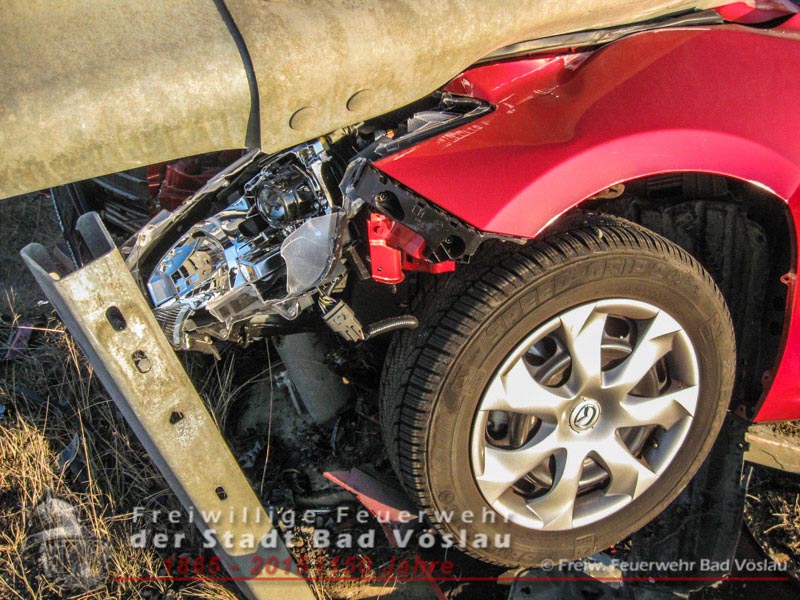 In den Nachmittagsstunden des 16. Februar 2015 wurde die Freiwillige Feuerwehr der Stadt Bad Vöslau durch die Bezirksalarmzentrale Baden zu einem Verkehrsunfall auf dem Autobahnzubringer alarmiert. Umgehend rückte das erste Gruppenfahrzeug zur Unfallstelle aus, dort eingetroffen stellten die Freiwilligen Einsatzkräfte folgende Lage fest. Ein PKW steckt unter der Leitschiene in einer Kurve, hinter der Leitschiene ging es rund 3 Meter steil bergab. Die Lenkerin war bereits aus dem Fahrzeug befreit und wurde von Ersthelfern bis zum Eintreffen des Roten Kreuzes Bad Vöslau betreut. Mit Verletzungen unbestimmten Grades wurde die Fahrerin von den Rettungskräften in ein umliegendes Krankenhaus gebracht. Für die Bergung des Fahrzeuges musste die Fahrbahn komplett gesperrt werden, mit der Seilwinde des Rüstfahrzeuges wurde das Auto aus der Leitschiene gezogen und anschließend einem privaten Abschleppdienst übergeben. Der Kraftstofftank des Unfallfahrzeuges wurde durch den Aufprall beschädigt, der auslaufende Dieselkraftstoff wurde in speziellen Wannen aufgefangen. Die Fahrbahn musste anschließend mit Ölbindemittel gereinigt werden. Nach knapp 2 Stunden im Einsatz konnte der Autobahnzubringer wieder voll für den Verkehr freigegeben werden. Fotos: Conrad FiedorowicBericht: Daniel Wirth Beitrag erstellt am: 17. Februar 2015