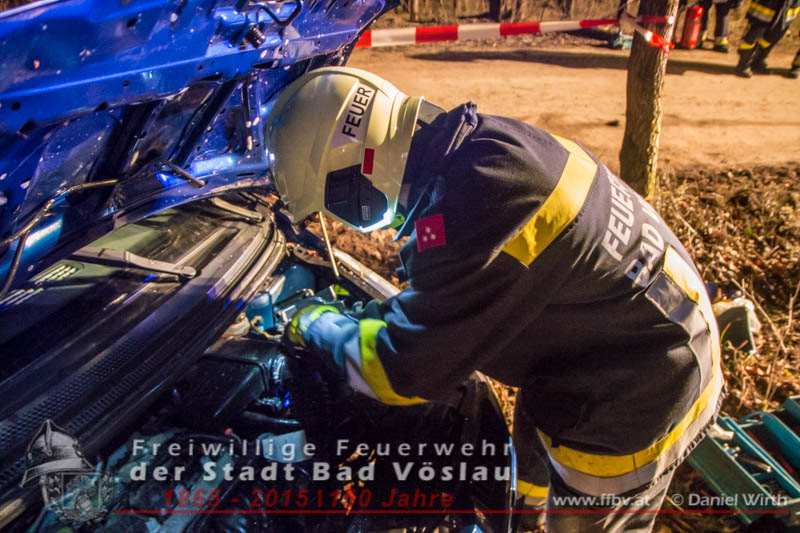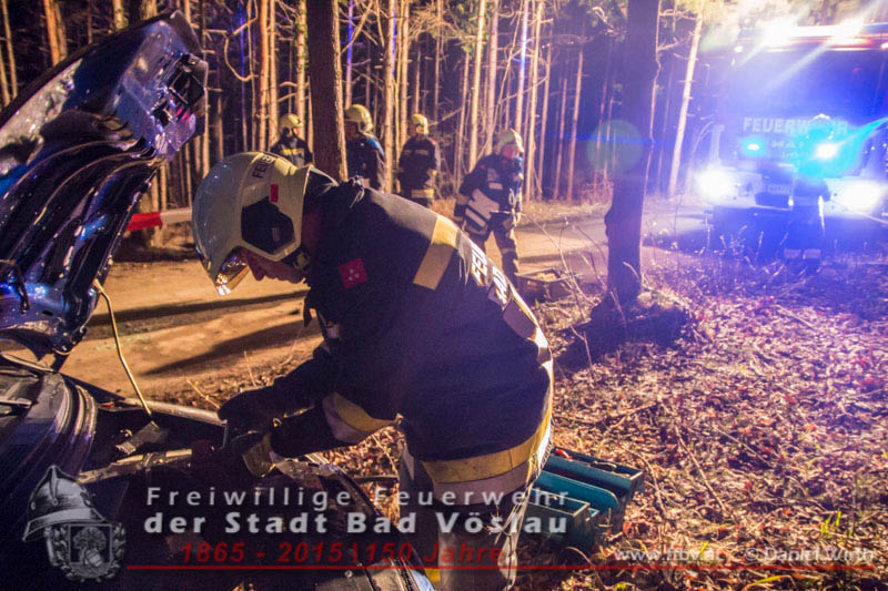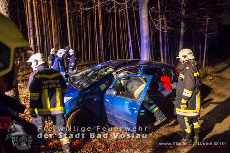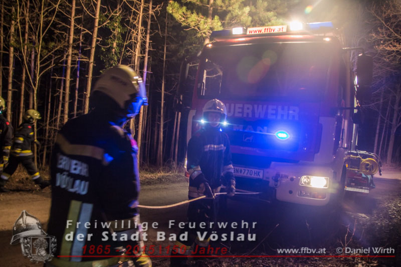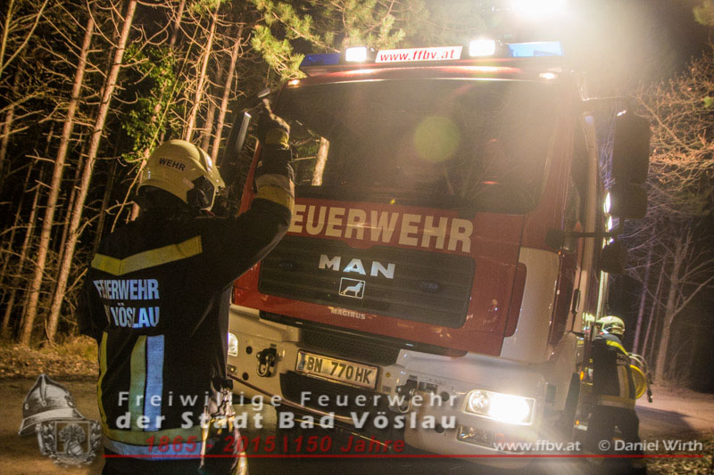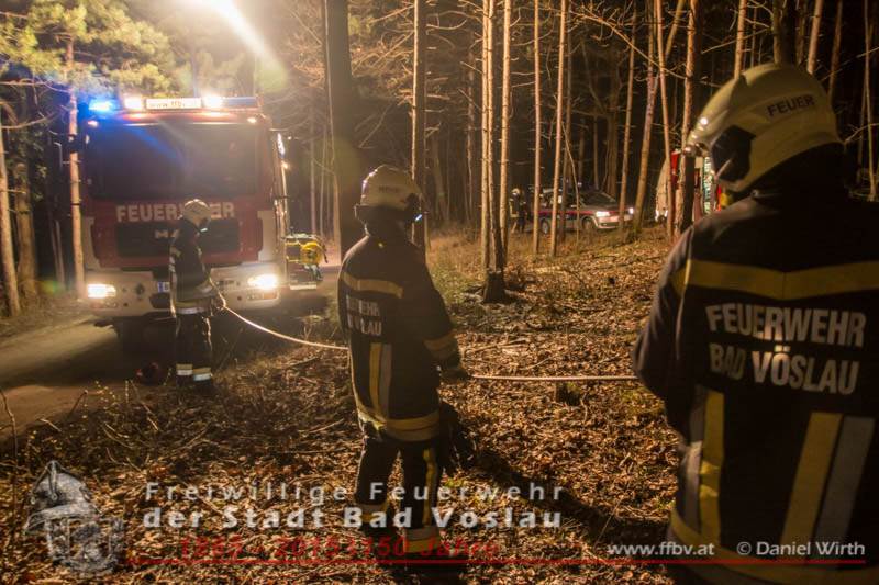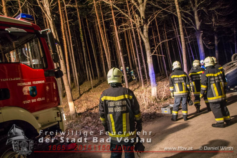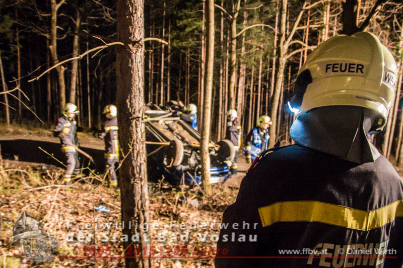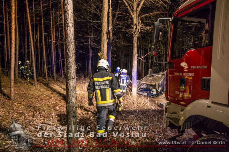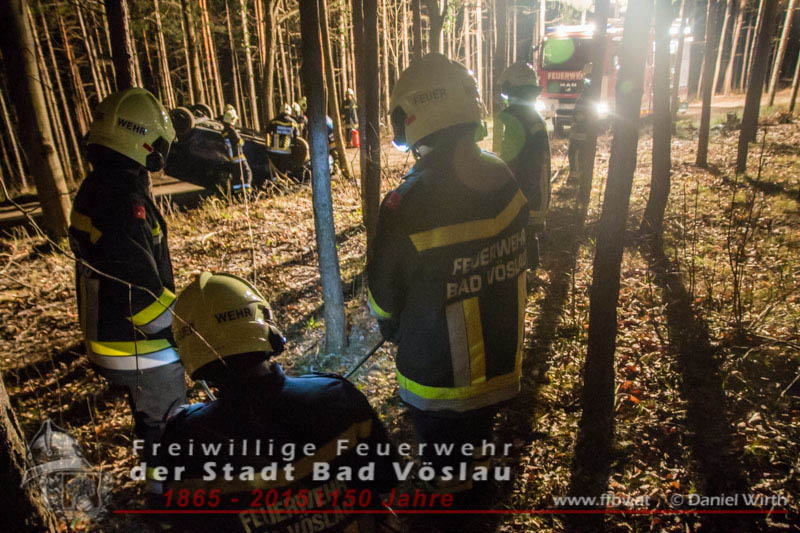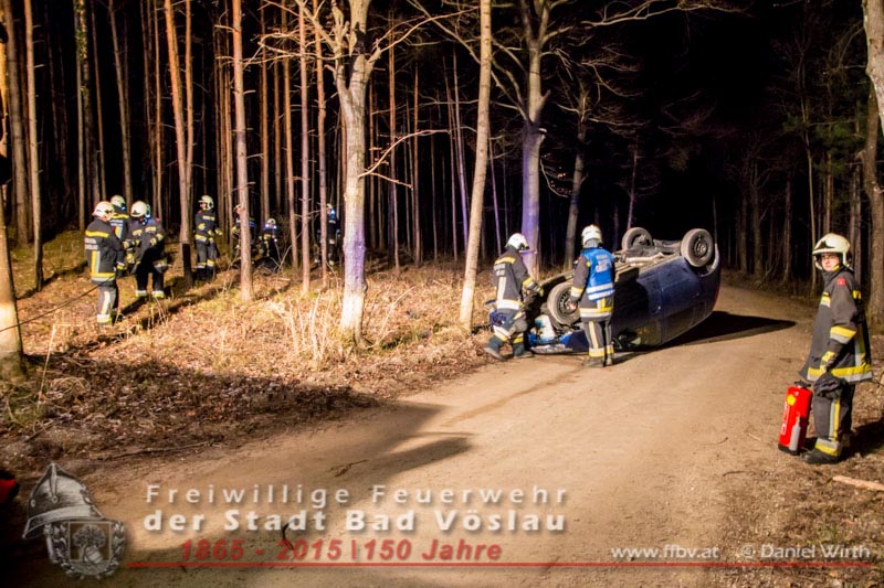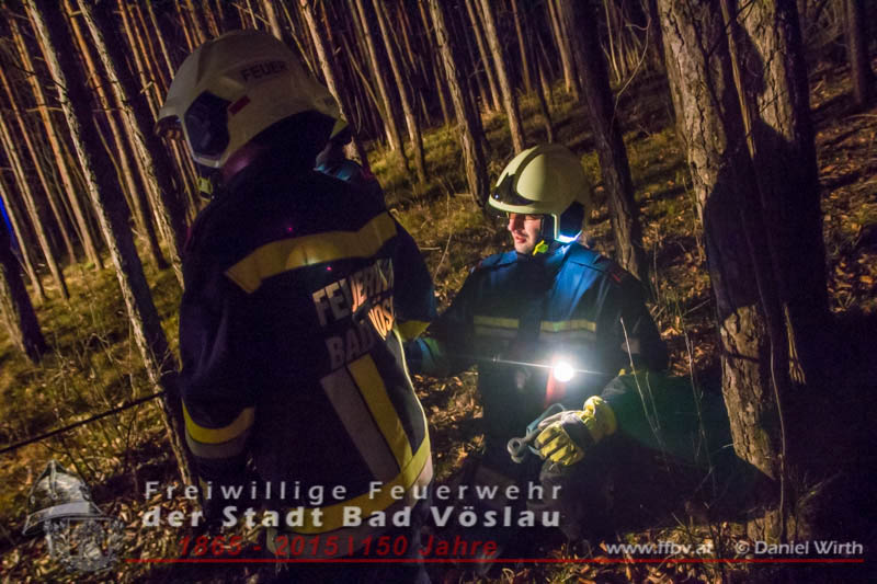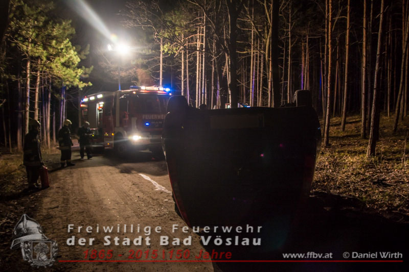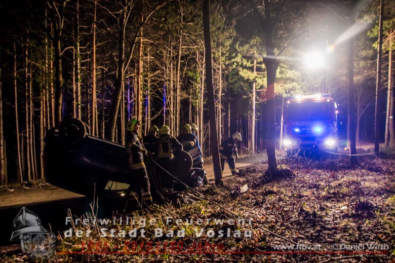 In den Nachtstunden des 06. April 2015 fuhr ein PKW vom Harzberg talwärts über eine Forststraße. Aus bislang unbekannter Ursache kam das Fahrzeug von der Straße ab, überschlug sich und blieb auf dem Dach liegen. Gegen 23:30 ging bei der Bezirksalarmzentrale Baden die Meldung über den Unfall ein, umgehend wurde die Freiwillige Feuerwehr der Stadt Bad Vöslau, der Rettungsdienst und die Polizei alarmiert.Binnen weniger Minuten traf bereits das erste Einsatzfahrzeug am Unfallort ein. Die Fahrzeuginsassen blieben bei dem Unfall unverletzt und konnten sich selbst aus dem PKW befreien, sie wurden von Rettungssanitätern des Roten Kreuzes Bad Vöslau betreut. Nach der Freigabe des PKW’s durch die Polizei konnte mit den Bergungsarbeiten begonnen werden. Über eine, an einem Baum angeschlagene, Umlenkrolle wurde das schwerbeschädigte Auto mit der Seilwinde des Rüstfahrzeuges wieder auf die Räder gestellt. Im Anschluss wurde die Batterie abgeklemmt und der PKW gesichert am Fahrbahnrand abgestellt. Fotos und Bericht: Daniel WirthBeitrag erstellt am: 07.04.2015