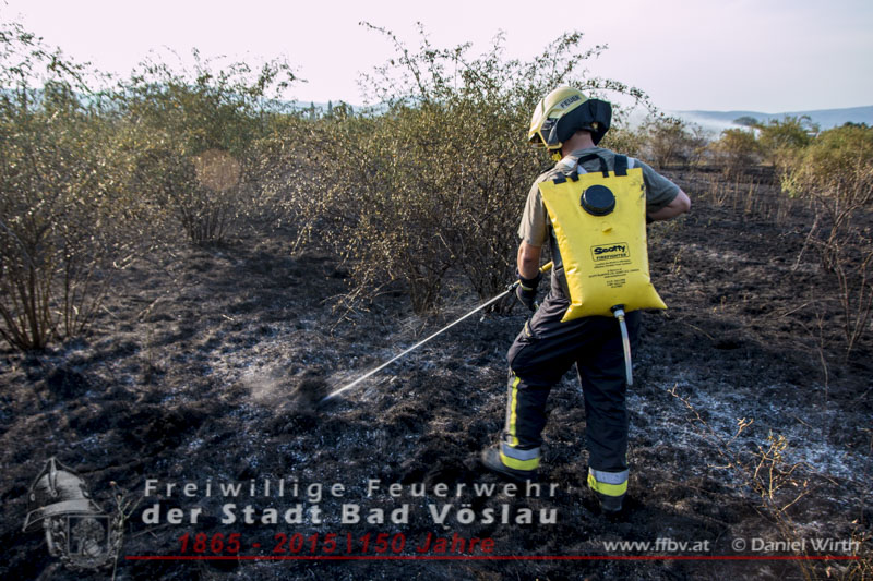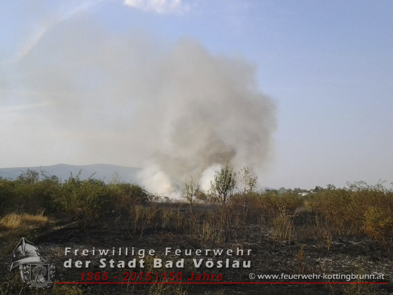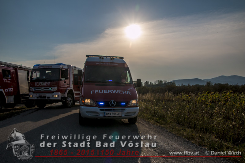 beschäftigt waren. Mit zwei Löschgruppen- und einem Versorgungsfahrzeug machten sich die Einsatzkräfte aus Bad Vöslau auf den Weg zum Einsatzort. Mit Tanklösch- und Rüstlöschfahrzeug wurde ein Pendelverkehr zwischen Einsatzstelle und einem Hydranten aufgebaut, um die beiden Löschfahrzeuge der Feuerwehr Kottingbrunn mit ausreichend Wasser zu versorgen. Auch eine Feuerpatsche und ein Löschrucksack kamen zum Einsatz um einzelne Glutnester abzulöschen. Durch einen Rettungswagen des Roten Kreuzes Bad Vöslau wurde die Sicherung der Atemschutzgeräteträger und die Versorgung mit Trinkwasser sichergestellt. Nach gut einer Stunde konnten die Fahrzeuge der Freiwilligen