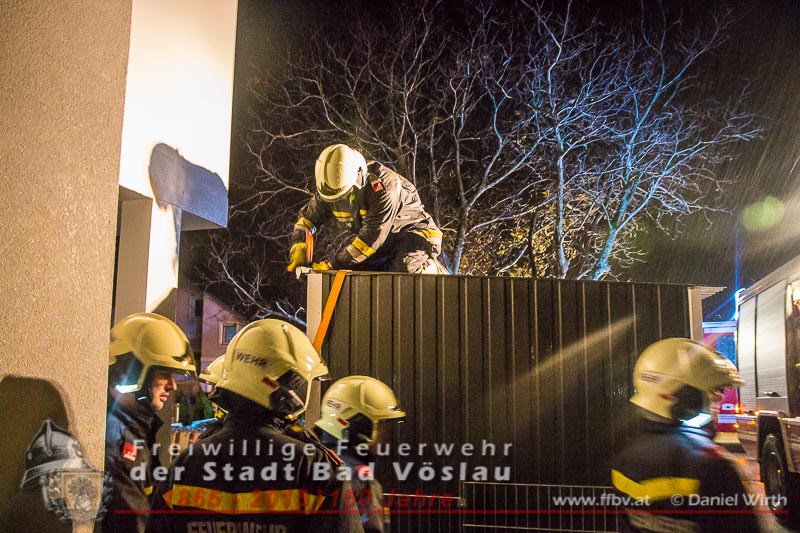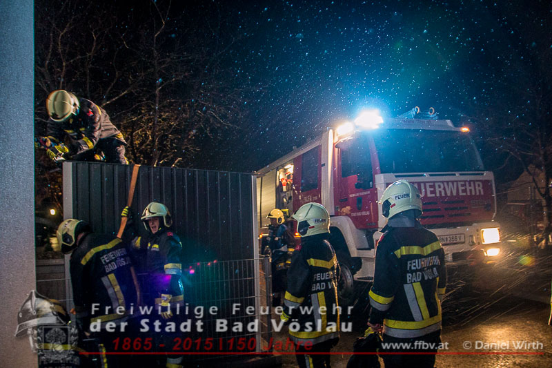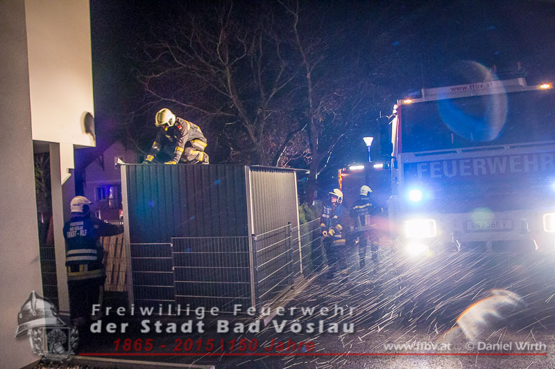 In der Nacht auf den 16. November 2015 kam es im Stadtgebiet von Bad Vöslau zu einem wetterbedingten Einsatz. Durch die starken Windböen wurde eine Gartenhütte beschädigt und drohte abzuheben. Beim Eintreffen der Feuerwehreinsatzkräfte war bereits ein Teil der Dachkonstruktion abgerissen. Mit einem Spanngurt wurde die Blechhütte gesichert, das abgerissene Teil wurde wieder befestigt. Nach gut einer halben Stunde konnte die Feuerwehr wieder einrücken. Bericht und Fotos: Daniel Wirth, SB ÖABeitrag erstellt am: 16.11.2015