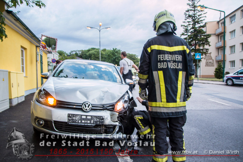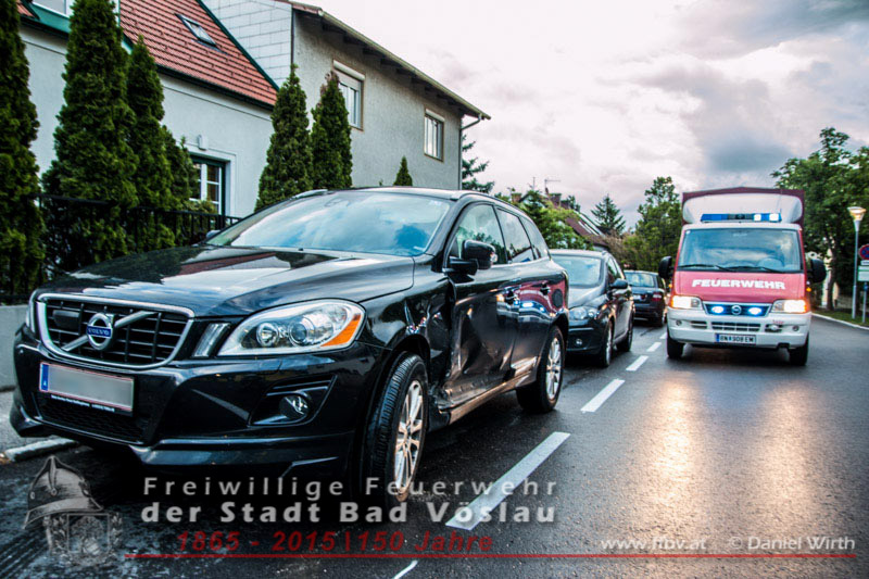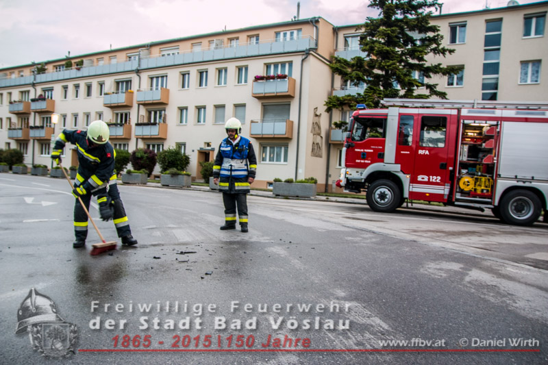 In den Abendstunden des 20.05.2015 kam es im Stadtgebiet von Bad Vöslau zu einem Verkehrsunfall. Ein zufällig vorbeikommender Rettungssanitäter verständigte die Einsatzkräfte und sicherte die, im Kreuzungsbereich befindliche, Unfallstelle ab. Die eingetroffene Polizei übernahm die Unfallaufnahme, die Absicherung wurde von der Freiwilligen Feuerwehr der Stadt Bad Vöslau übernommen. Der Rettungsdienst wurde an der Einsatzstelle nicht benötigt, da bei dem Zusammenstoß niemand verletzt wurde. Die beiden beschädigten Fahrzeuge mussten von den freiwilligen Feuerwehreinsatzkräften aus dem Kreuzungsbereich geschoben werden. Abschließend wurden die PKW’s gesichert abgestellt und die Fahrbahn von Trümmerteilen gereinigt. Nach einer guten halben Stunde konnte der Einsatz erfolgreich abgeschlossen werden.