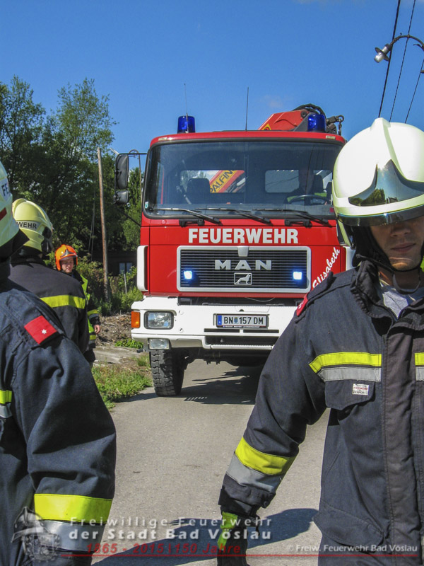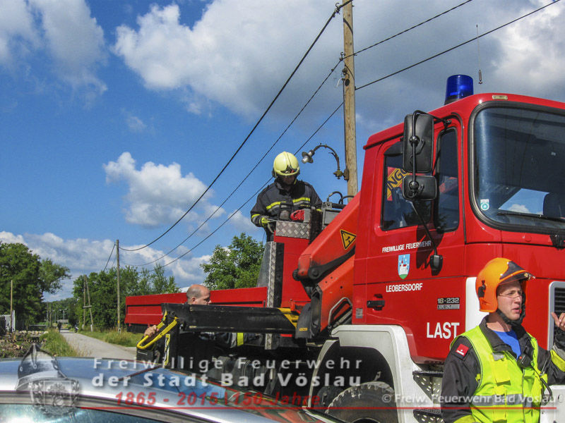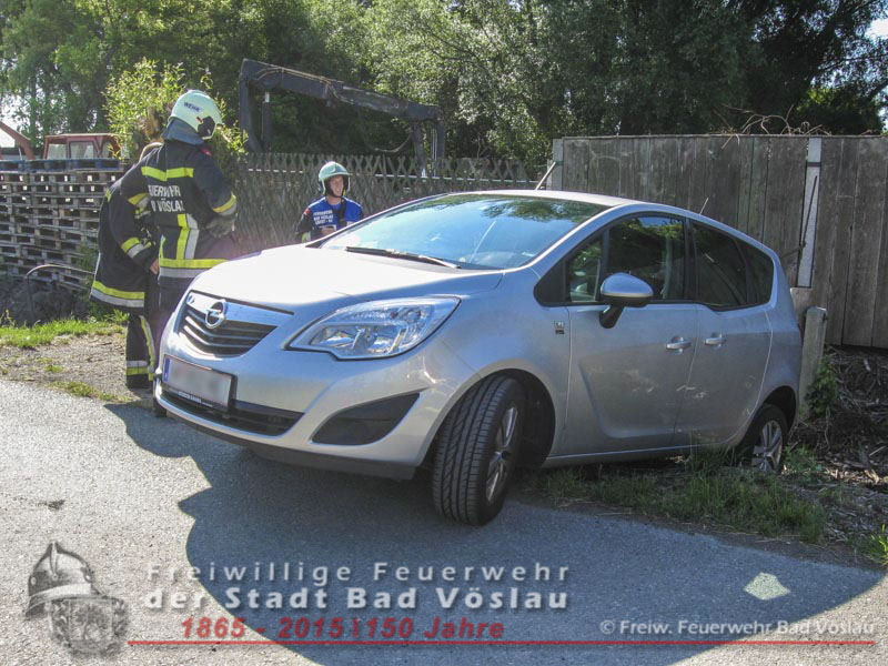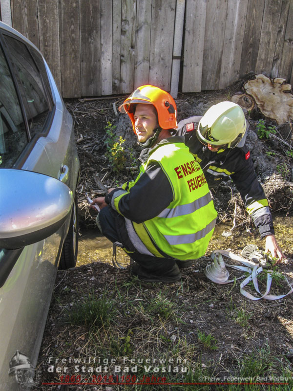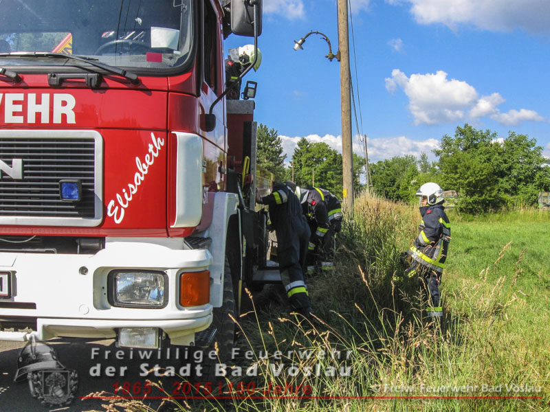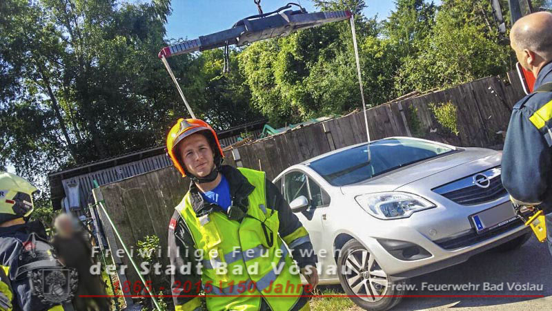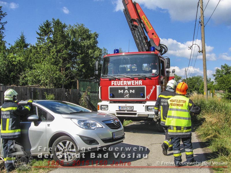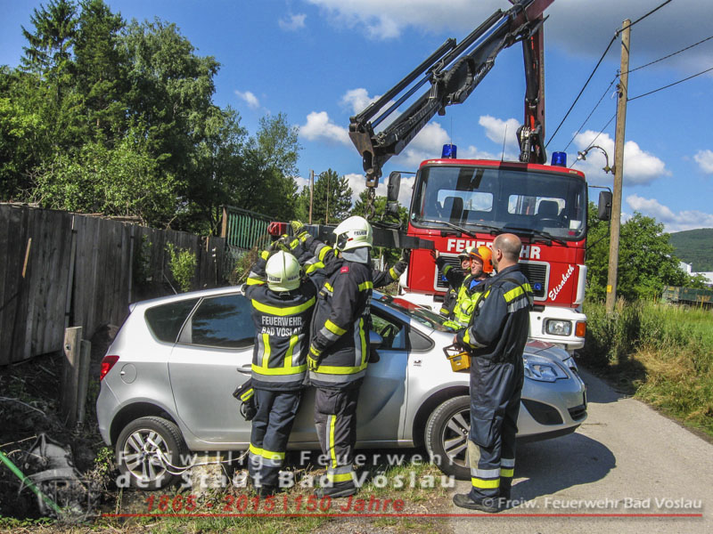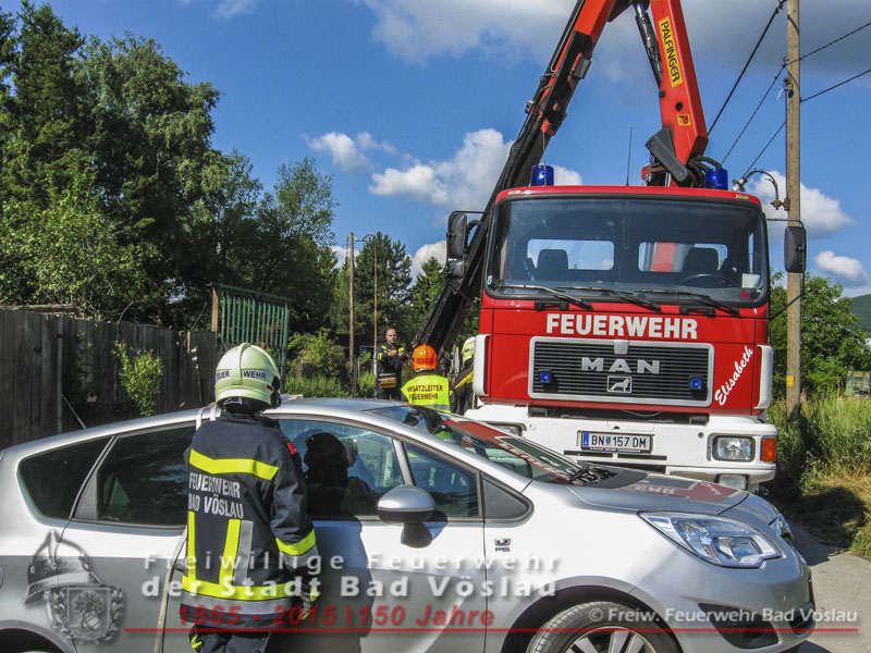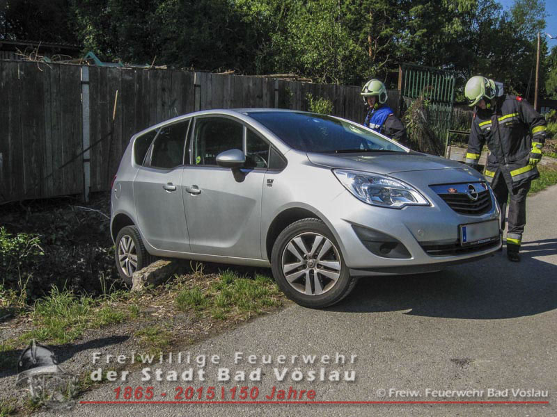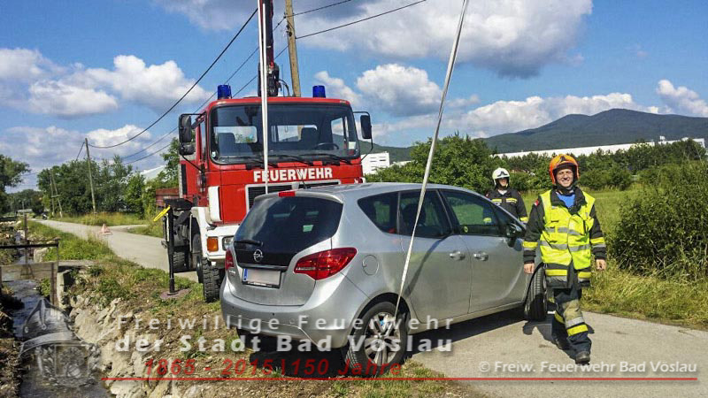 In den Vormittagsstunden des 25. Juni 2015 wurde die Freiwillige Feuerwehr der Stadt Bad Vöslau zu einer Fahrzeugbergung nach einem missglückten Wendemanöver gerufen. Am Einsatzort eingetroffen machte sich der Feuerwehreinsatzleiter ein Bild von der Lage, ein PKW war bei dem Versuch zu wenden, zu weit in den Straßengraben gefahren und saß mit der Hinterachse auf einem Betonblock auf. Umgehend wurde das Fahrzeug gegen ein weiteres Abrutschen gesichert und ein Brandschutz aufgebaut. Eine schonende Fahrzeugbergung war nur mit einem Kranfahrzeug möglich, daher entschied sich der Einsatzleiter das Lastfahrzeug aus Leobersdorf über die Bezirksalarmzentrale Baden anzufordern. Mit dem Ladekran des Leobersdorfer Feuerwehrfahrzeuges konnte der PKW behutsam angehoben und wieder auf die Fahrbahn gesetzt werden. Verletzt wurde bei dem Unfall niemand, auch die Beschädigungen