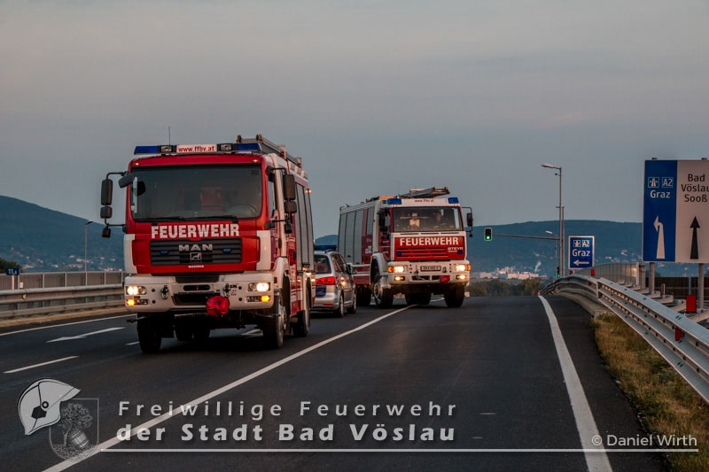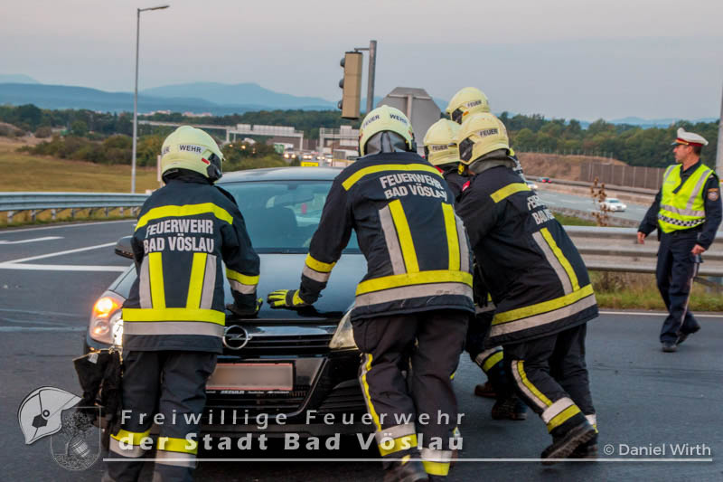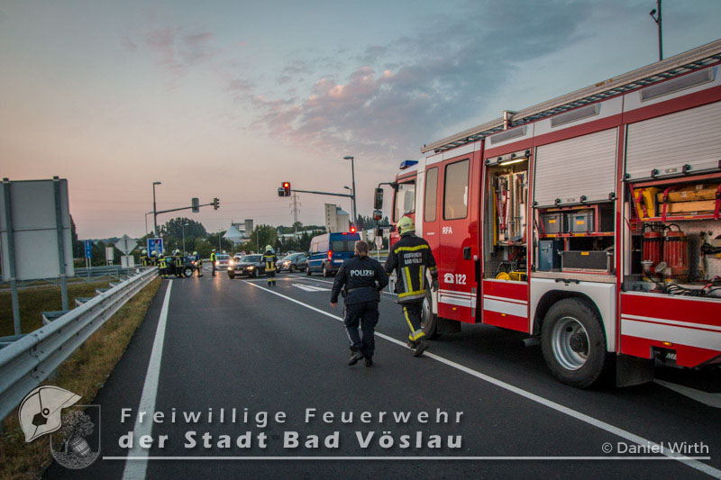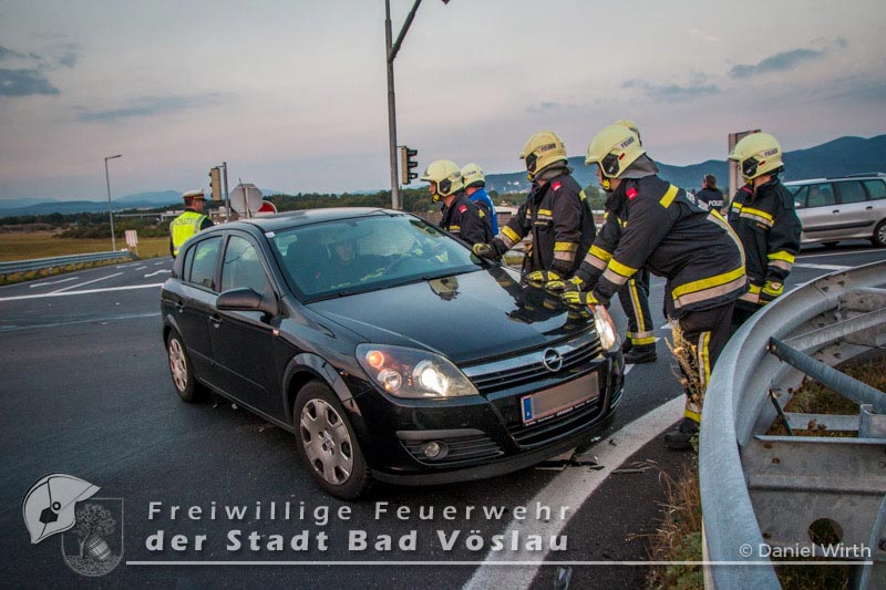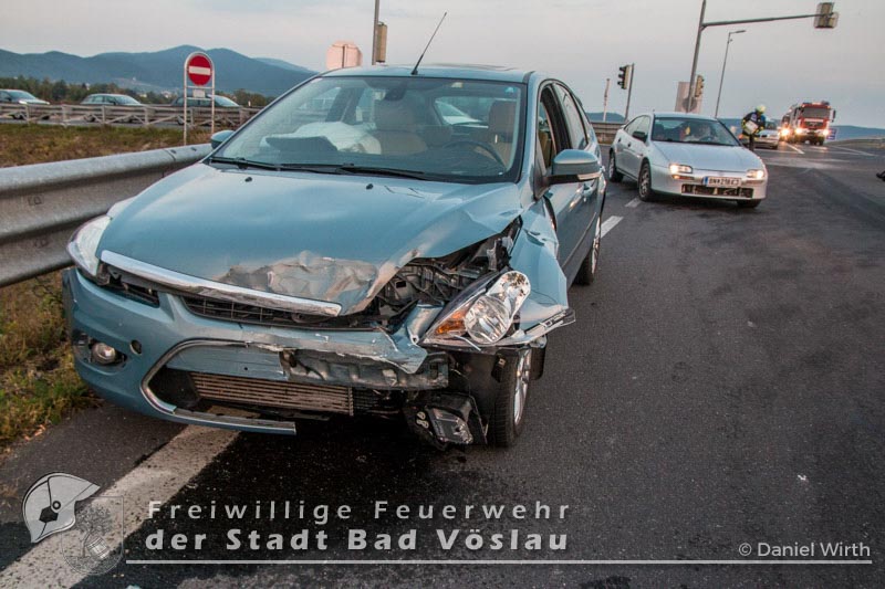 Am Autobahnzubringer Bad Vöslau kam es am 28. September 2016 zu einem Verkehrsunfall im Frühverkehr. Aus bislang ungeklärter Ursache stießen zwei Fahrzeuge im Kreuzungsbereich zusammen. Beide PKW blieben fahrunfähig am Fahrbahnrand stehen. Beim Eintreffen der Freiwilligen Feuerwehr der Stadt Bad Vöslau wurde die Unfallstelle bereits von mehreren Polizeifahrzeugen abgesichert. Mit Rangierrollern wurden die Fahrzeuge entfernt und die Fahrbahn mit Ölbindemittel von Betriebsstoffen und Trümmerteilen gereinigt. Die beiden PKW wurden gesichert auf einem Parkplatz abgestellt. Nach gut einer dreiviertel Stunde konnte der Einsatz beendet werden. Bericht und Fotos: Daniel Wirth, ASB ÖA Beitrag erstellt am: 28.09.2016