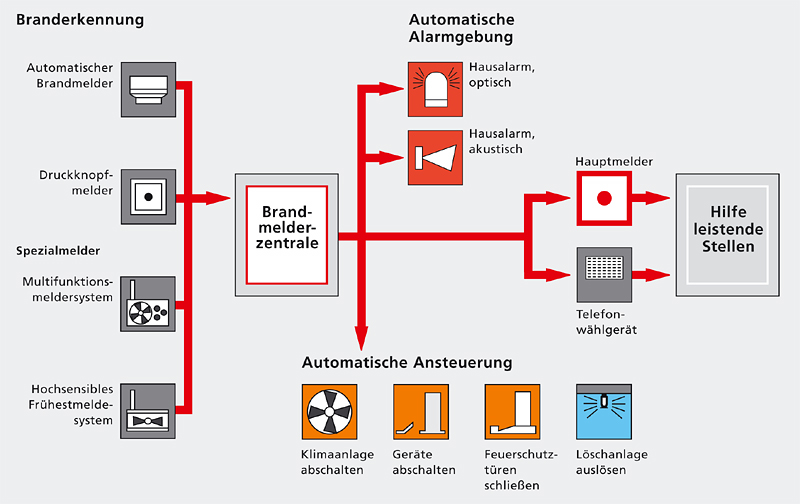 Alarmmeldungen können durch automatische Brand-/Rauchmelder oder Druckknopfmelder ausgelöst werden. Handelt es sich um einen tatsächlichen Brandfall, rüstet sich der Atemschutz-Trupp des Tanklöschfahrzeuges aus und beginnt mit der Evakuierung/Rettung von Personen in dem gefährdeten Bereich bzw. beginnt mit dem Löschangriff und fordert Verstärkung an. Ein großer Vorteil dieses Alarmierungssystem ist die mögliche Zeitersparnis bis ein Brand entdeckt wird - so können größere Schäden verhindert werden! Jedoch wird ein Großteil der Alarmmeldungen durch Fehlalarme (z.B. technischer Defekt in der Anlage) oder durch Täuschungsalarme (z.B. Zigarettenqualm, Wasserdampf usw.) ausgelöst.