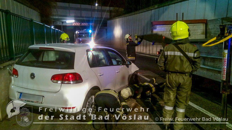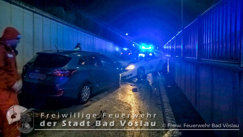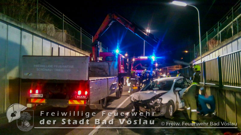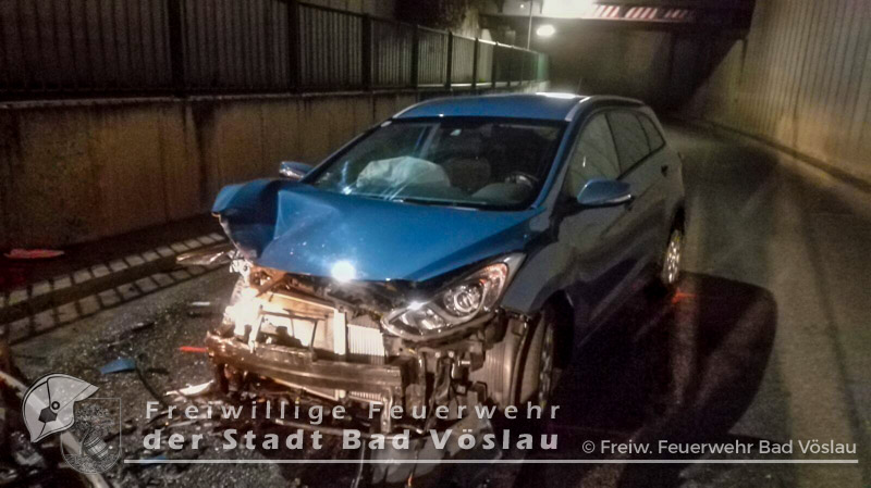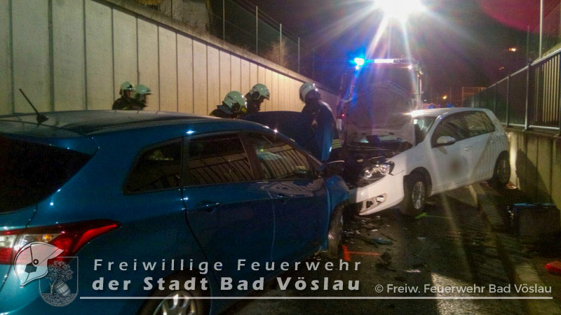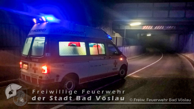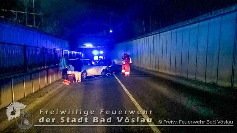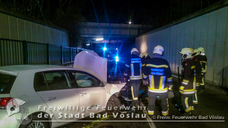 Am 30. Dezember 2016 kam es im Bereich einer Bahnunterführung im Stadtgebiet von Bad Vöslau zu einem Verkehrsunfall. Aus bislang unbekannter Ursache prallten in den Nachmittagsstunden des 30.Dezembers 2016 zwei PKW in einer Unterführung frontal ineinander. Beim Eintreffen der beiden Rettungsfahrzeuge aus Bad Vöslau befand sich noch eine Person in einem der schwer beschädigten Fahrzeuge. Um die verletzte Frau schonend aus dem PKW retten zu können, entschieden sich die Rettungssanitäter zu einer Rettung mittels Spineboard. Nur kurze Zeit später traf die Freiwillige Feuerwehr der
