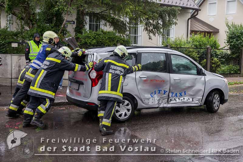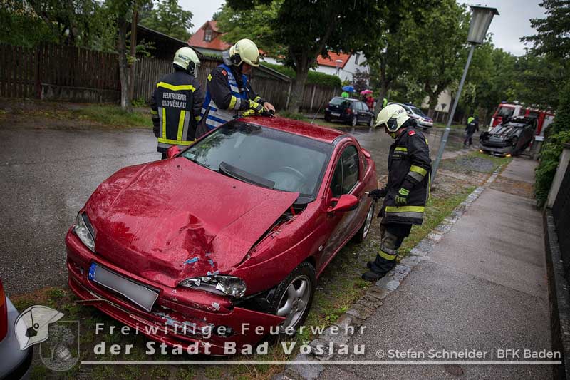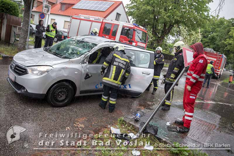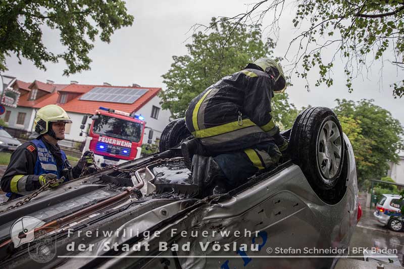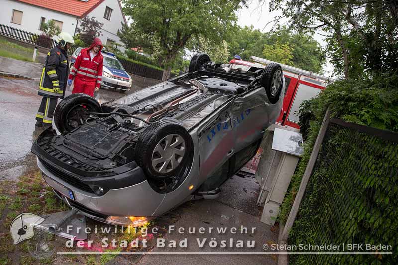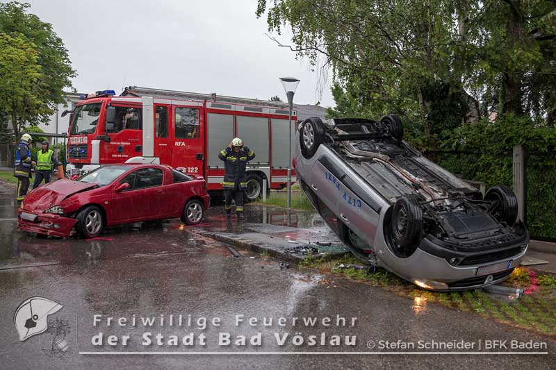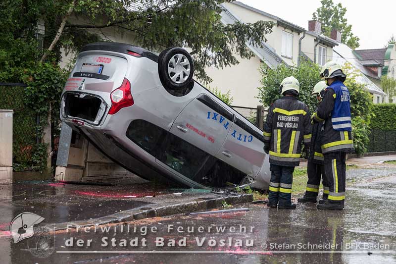 Während dem heftigen Regen in den Vormittagsstunden des 20. Juni 2016 kam es auch in Bad Vöslau zu einem spektakulären Verkehrsunfall. Mitten im Stadtgebiet von Bad Vöslau prallten in einem Kreuzungsbereich zwei Fahrzeuge zusammen. Dabei wurde ein Pkw-Taxi seitlich erfasst und weggeschleudert. In Folge kam das Taxi Fahrzeug am Fahrzeugdach liegend zum Stillstand. Dabei wurden auch ein Verkehrsschild geknickt und zwei Elektro/Strom-Hausanschlusskästen stark beschädigt. In dem Taxi Pkw befand sich zum Glück nur der Lenker, welcher unbestimmten Grades verletzt und von den alarmierten Rettungskräften abtransportiert wurde.Die zweite Lenkerin blieb unverletzt. An beiden Unfallfahrzeugen entstand beträchtlicher Sachschaden. Für die Bergung der Unfallwracks wurde die örtlich zuständige Freiwillige Feuerwehr Bad Vöslau angefordert. Das auf dem Fahrzeugdach liegende Taxi Fahrzeug musste von der Feuerwehreinsatzkräften mittels Seilwinde des Rüstfahrzeuges wieder auf die Räder gestellt werden, bevor es ebenfalls zur Seite verbracht werden konnte. Anschließend musste noch die Unfallstelle von Wrackteilen und ausgelaufenen Betriebsmittel gereinigt werden. Fotos und Bericht: © Stefan Schneider BFK Presseteam Beitrag erstellt am: 21.06..2016