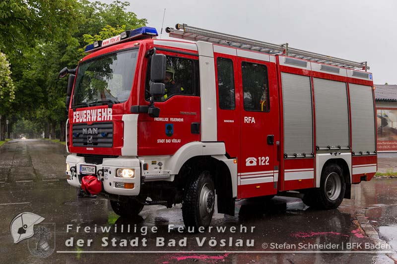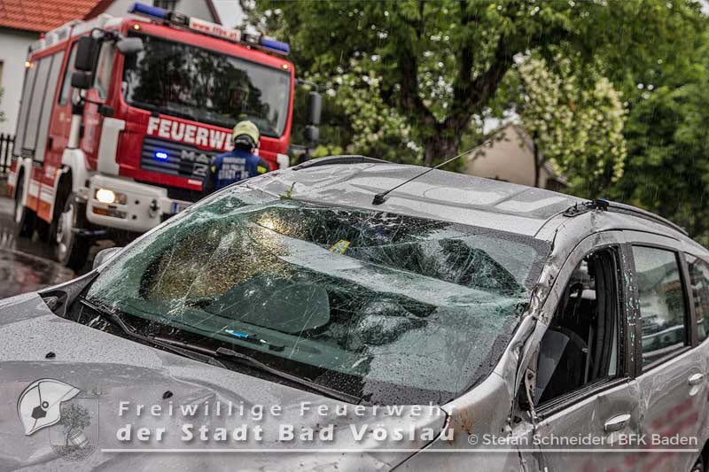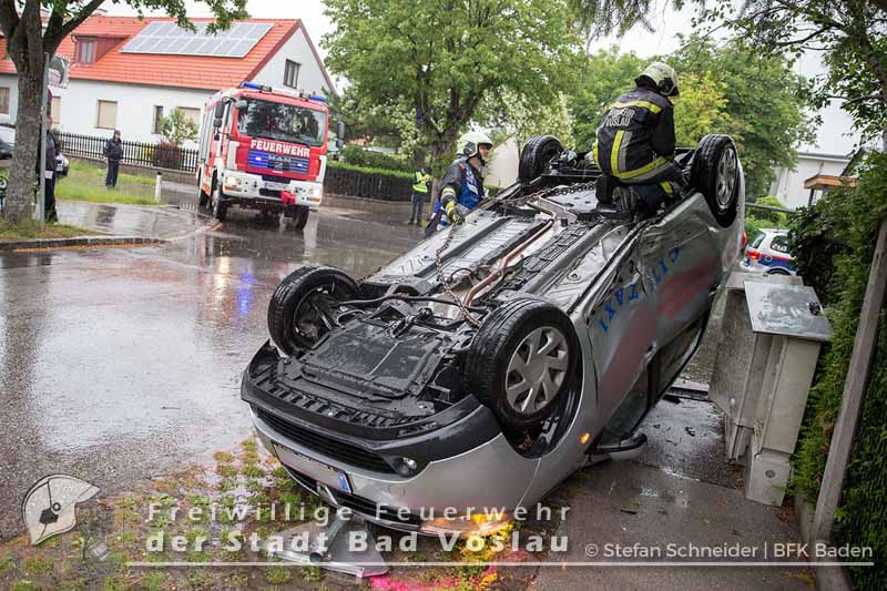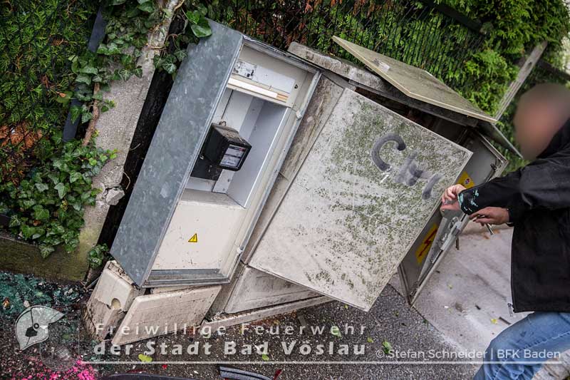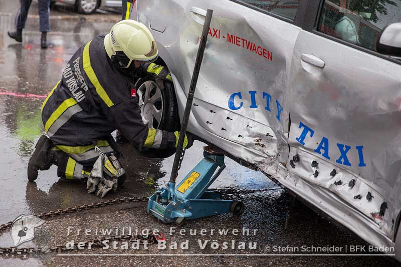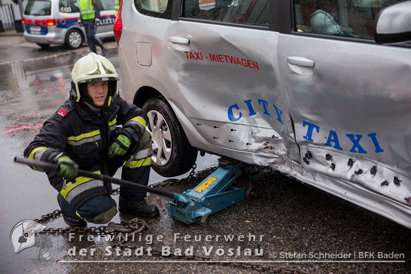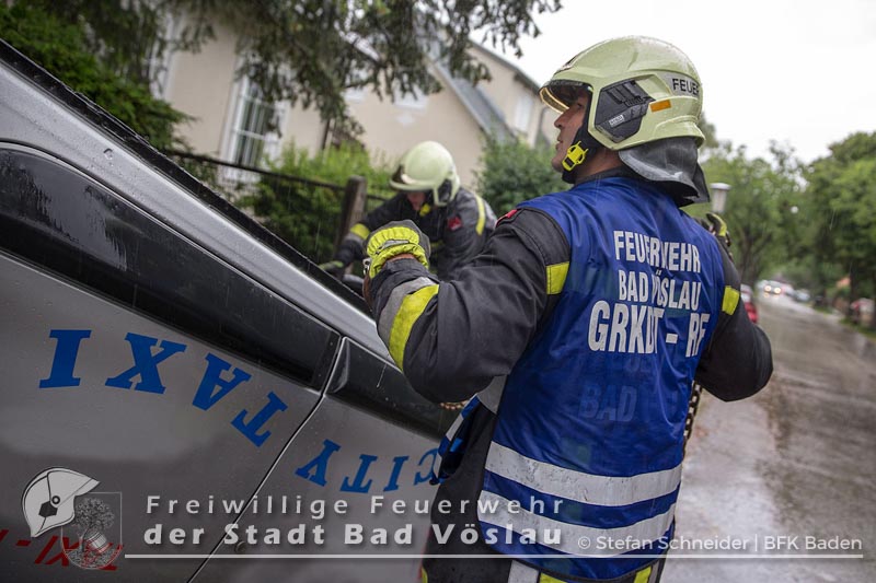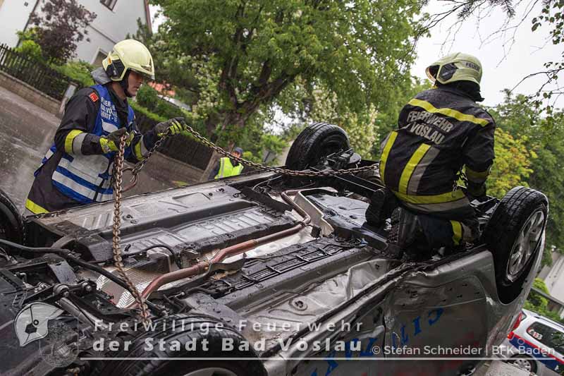 Während dem heftigen Regen in den Vormittagsstunden des 20. Juni 2016 kam es auch in Bad Vöslau zu einem spektakulären Verkehrsunfall. Mitten im Stadtgebiet von Bad Vöslau prallten in einem Kreuzungsbereich zwei Fahrzeuge zusammen. Dabei wurde ein Pkw-Taxi seitlich erfasst und weggeschleudert. In Folge kam das Taxi Fahrzeug am Fahrzeugdach liegend zum Stillstand. Dabei wurden auch ein Verkehrsschild geknickt und zwei Elektro/Strom-Hausanschlusskästen stark beschädigt. In dem Taxi Pkw befand sich zum Glück nur der Lenker, welcher unbestimmten Grades verletzt und von den alarmierten Rettungskräften abtransportiert wurde.Die zweite Lenkerin blieb unverletzt. An beiden Unfallfahrzeugen entstand beträchtlicher Sachschaden. Für die Bergung der Unfallwracks wurde die örtlich zuständige Freiwillige Feuerwehr Bad Vöslau angefordert. Das auf dem Fahrzeugdach liegende Taxi Fahrzeug musste von der Feuerwehreinsatzkräften mittels Seilwinde des Rüstfahrzeuges wieder auf die Räder gestellt werden, bevor es ebenfalls zur Seite verbracht werden konnte. Anschließend musste noch die Unfallstelle von Wrackteilen und ausgelaufenen Betriebsmittel gereinigt werden. Fotos und Bericht: © Stefan Schneider BFK Presseteam Beitrag erstellt am: 21.06..2016