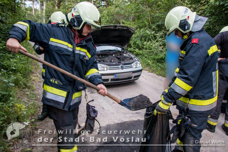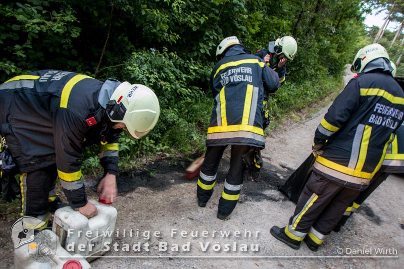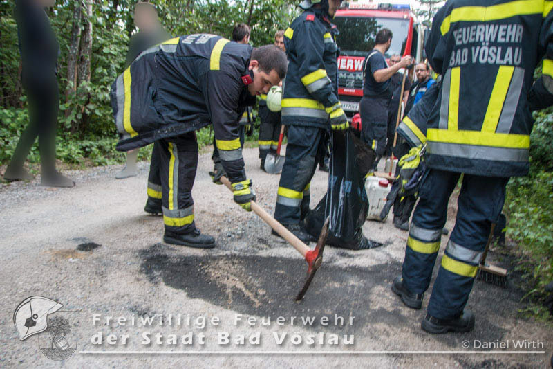 Harzbergstraße auf. Umgehend setzten sich das Rüstfahrzeug und das Kommandofahrzeug in Richtung Einsatzort in Bewegung. Nach der Erkundung durch den Einsatzleiter konnte mit Ölbindemittel ein Eindringen in das Gewässer neben der Fahrbahn verhindert werden. Ein paar Zentimeter des verunreinigten Waldbodens mussten ebenfalls abgetragen werden. Der fahrunfähige PKW wurde auf einen nahegelegenen Parkplatz geschoben und dort gesichert abgestellt. Nach gut einer Stunde konnte dieser Einsatz erfolgreich beendet werden. Fotos: Roland Schremser und Daniel WirthBericht: Daniel Wirth, SB ÖA Beitrag erstellt am: 28.06.2016