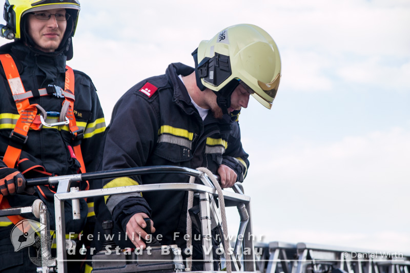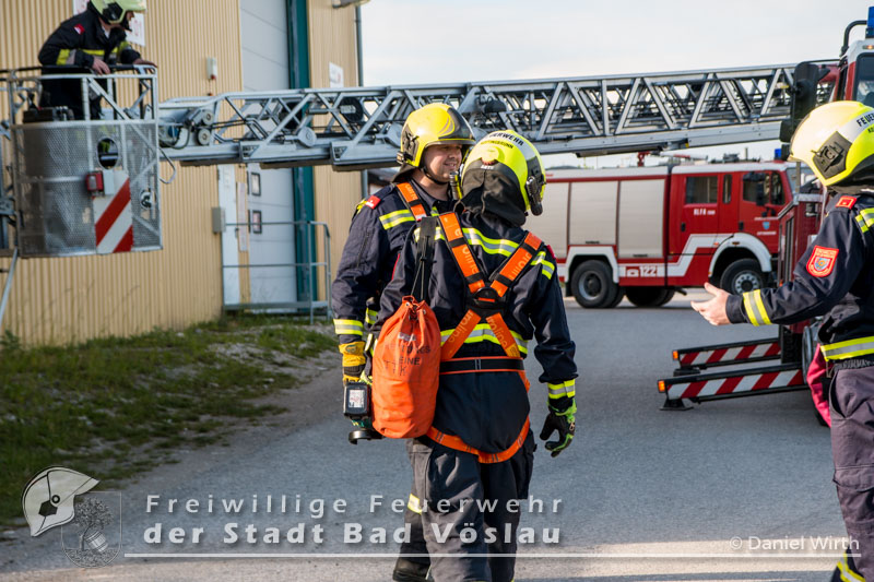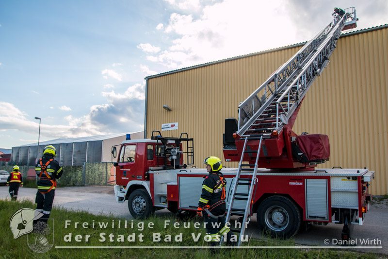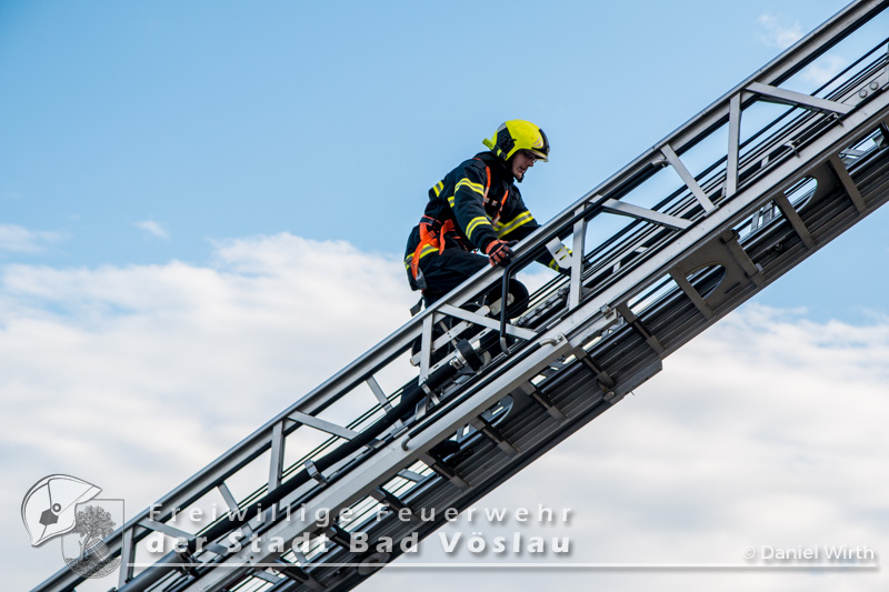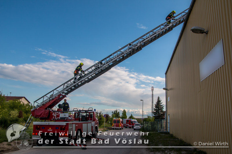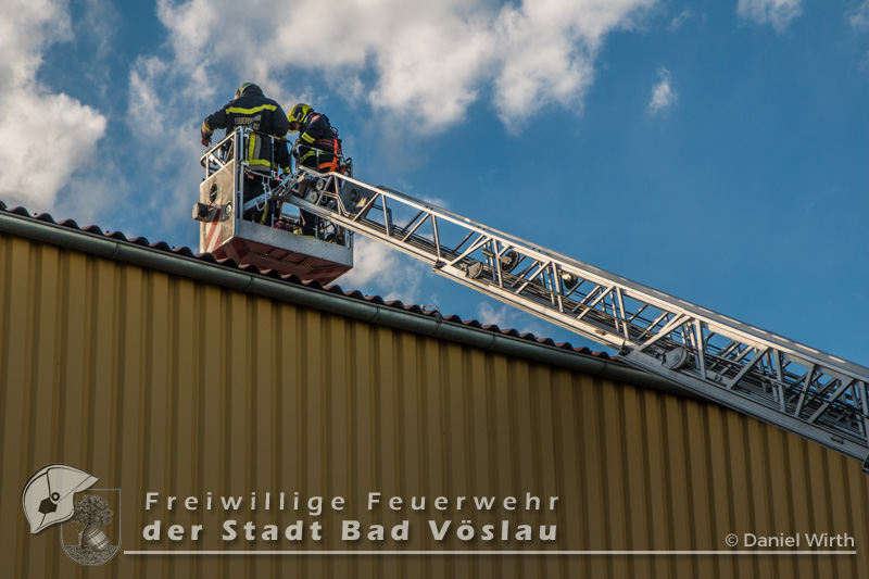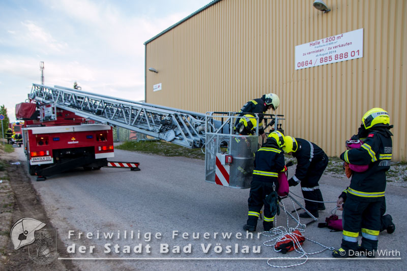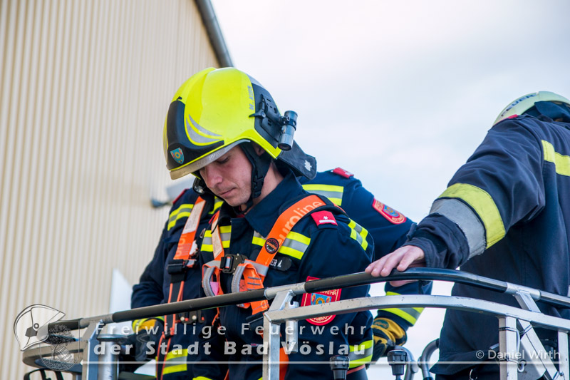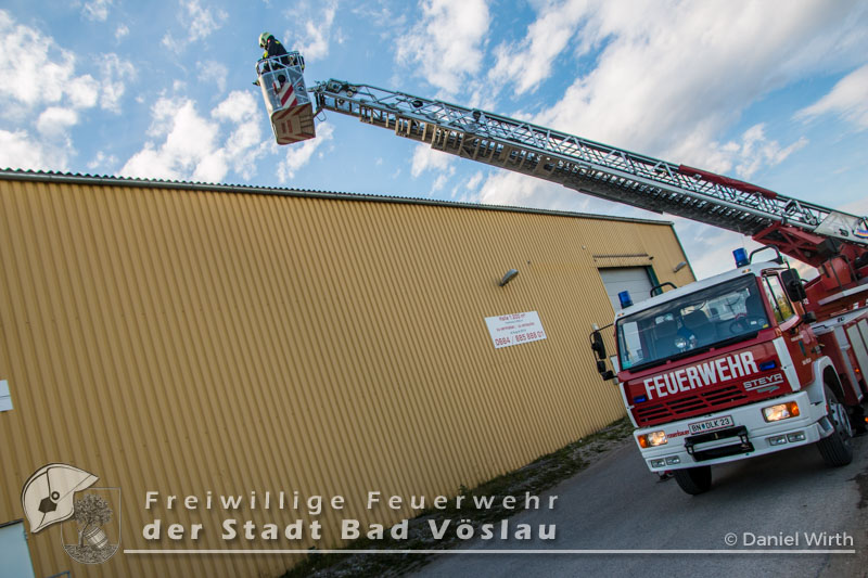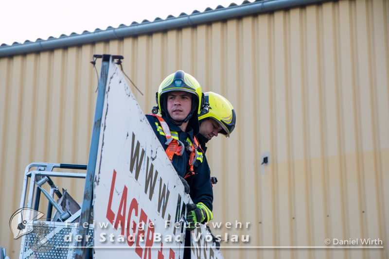 Am Abend des 26.04.2016 wurde die Freiwilligen Feuerwehr Kottingbrunn zu einem Sturmschaden gerufen. Am Einsatzort angekommen, stellte der Einsatzleiter fest, dass sich eine Werbetafel aus der Verankerung gelöst hatte und abzustürzen drohte. Aufgrund der Höhe des Gebäudes und zwecks Eigensicherung wurde die Drehleiter der Freiwilligen Feuerwehr der Stadt Bad Vöslau zur Unterstützung angefordert. Inzwischen wurden mehrere Mitglieder mit 5-Punkt-Geschirren ausgerüstet, um sich oben am Dach sichern zu können. Mit dem Drehleiterkorb ging es dann auf das Dach des Gebäudes, dort wurde die Werbetafel abgetrennt und gesichert zu Boden gebracht. Fotos: Daniel Wirth, SB ÖABericht: Melanie Deli, SB ÖA Beitrag erstellt am: 28.04.2016