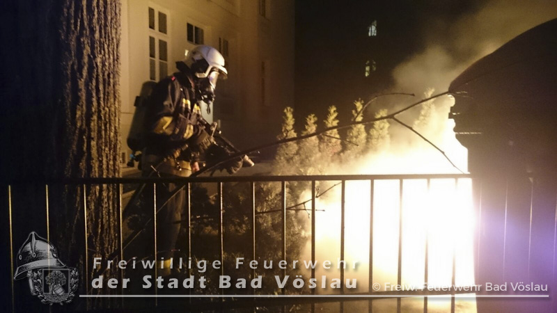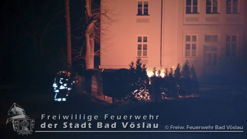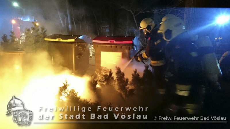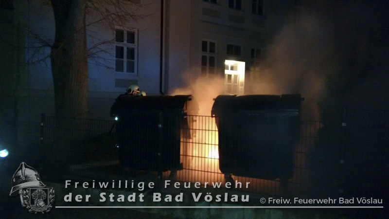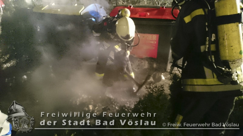 In den Nachtstunden des 12. März 2016 geriet ein Großraummüllbehälter aus bislang unbekannter Ursache im Stadtgebiet von Bad Vöslau in Brand. Als die Freiwillige Feuerwehr der Stadt Bad Vöslau an der Einsatzstelle eintraf schlugen bereits Flammen aus dem Müllbehälter. Unter Atemschutz wurde ein Rohr der Schnellangriffsvorrichtung des Tanklöschfahrzeuges vorgenommen und abgelöscht. Abschließend wurde die Mülltonne ausgeräumt und die benachbarten Tonnen mit der Wärmebildkamera kontrolliert. Nach gut einer Stunde konnte der Einsatz beendet werden. Fotos: Gernot Binder, Philipp Michalek Bericht: Daniel Wirth, SB ÖA Beitrag erstellt am: 14.03.2016