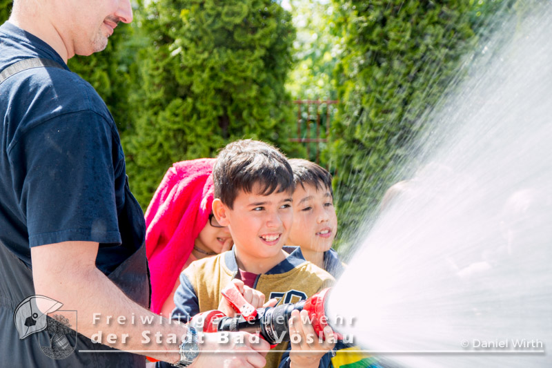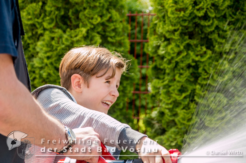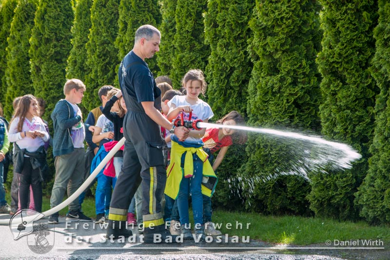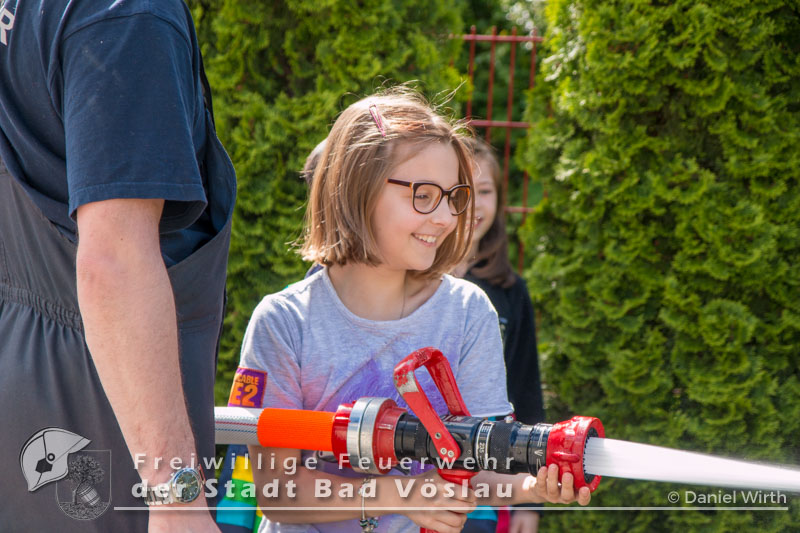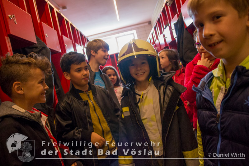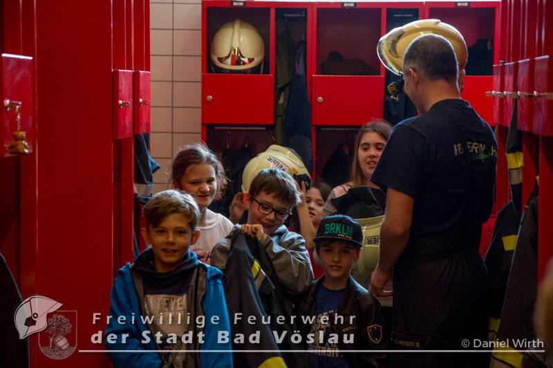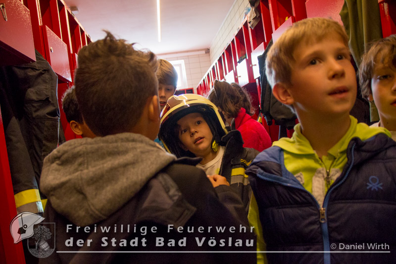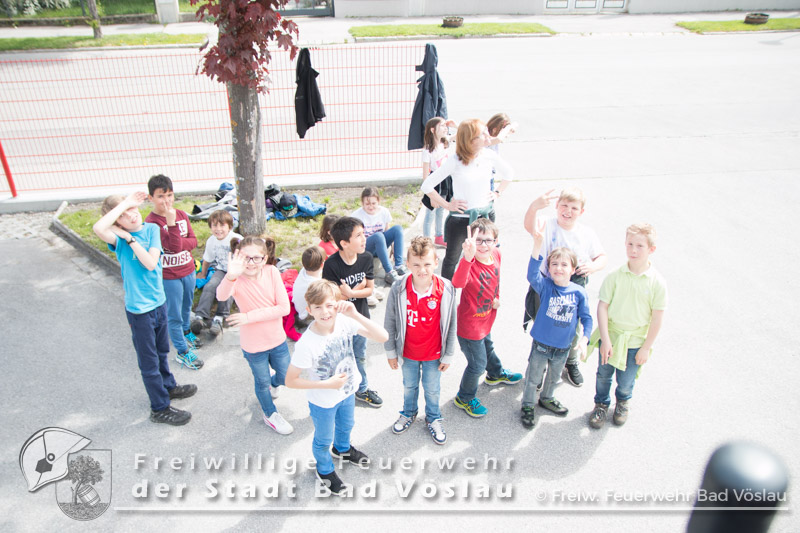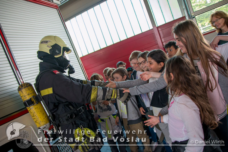 Am 12. Mai 2017 besuchten wieder überaus neugierige Kinder der Volksschule Bad Vöslau die Stadtfeuerwehr Bad Vöslau. Bei bestem Wetter wurden die zahlreichen Kinder und ihre Betreuerinnen von SB ÖA Daniel Wirth und seinem Team begrüßt. Bereits zu Beginn glänzten die Volksschüler mit ihrem außerordentlichen Wissen über Vorgehensweisen bei einem Notfall und das richtige Absetzen eines Notrufes. Danach konnten sie sämtliche Schritte und Stationen, die auch ein Feuerwehrmann absolviert - also von der Alarmierung über die Ausrüstung zu den Fahrzeugen und den Arbeitsgeräten - durchlaufen. Gestartet wurde daher in der Garderobe des Feuerwehrhauses, in der jeder einmal Feuerwehrfrau oder Feuerwehrmann spielen konnte. Ob Jacke, Handschuhe oder sogar ein echter Feuerwehrhelm - alles wurde genauestens von den Kindern probiert und angeschaut. Im Anschluss daran rüstete sich ein Feuerwehrmitglied unter den neugierigen Blicken der kleinen Besucher vollständig mit einem Atemschutzgerät aus. Da sie Schritt für Schritt sehen konnten, wie sich der Feuerwehrmann verwandelte, war die Scheu vor den lauten Atemgeräuschen und der furchteinflößenden Maske schnell verflogen. Die nächste Station führte die Kinder hinaus zu