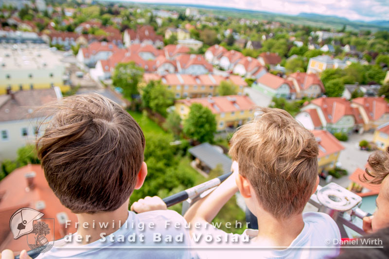 Abschließend ging es für die jungen Besucher noch mit der Drehleiter hoch hinaus, wo sie aus 30m Höhe Bad Vöslau überblicken konnten. Nach rund zwei Stunden musste sich die Gruppe wieder auf den Weg zurück in die Schule machen. Wir hoffen, es hat euch gefallen und ihr kommt bald wieder vorbei - vielleicht sogar als neues Mitglied der Feuerwehrjugend!?