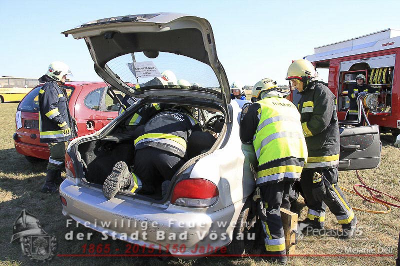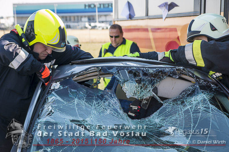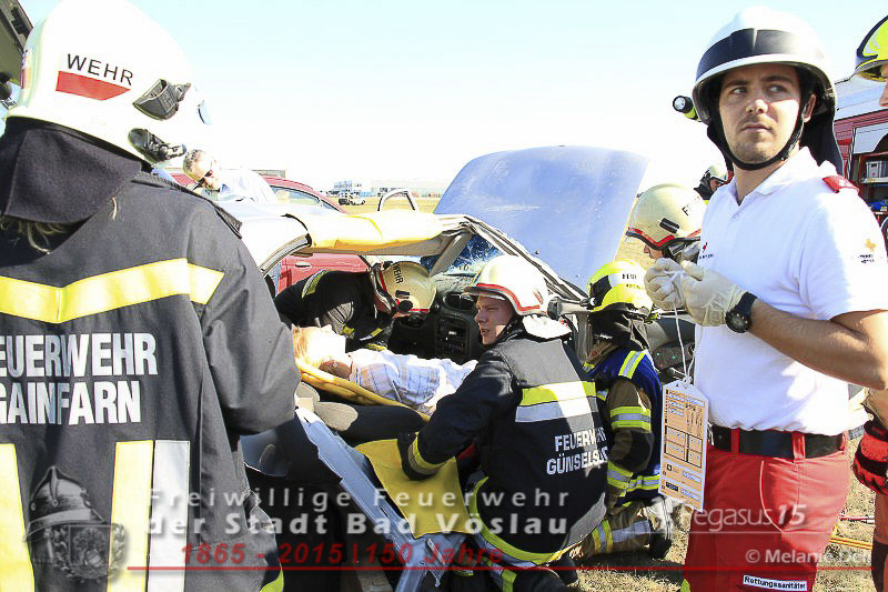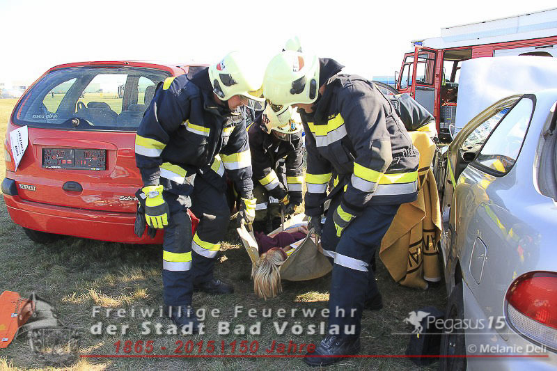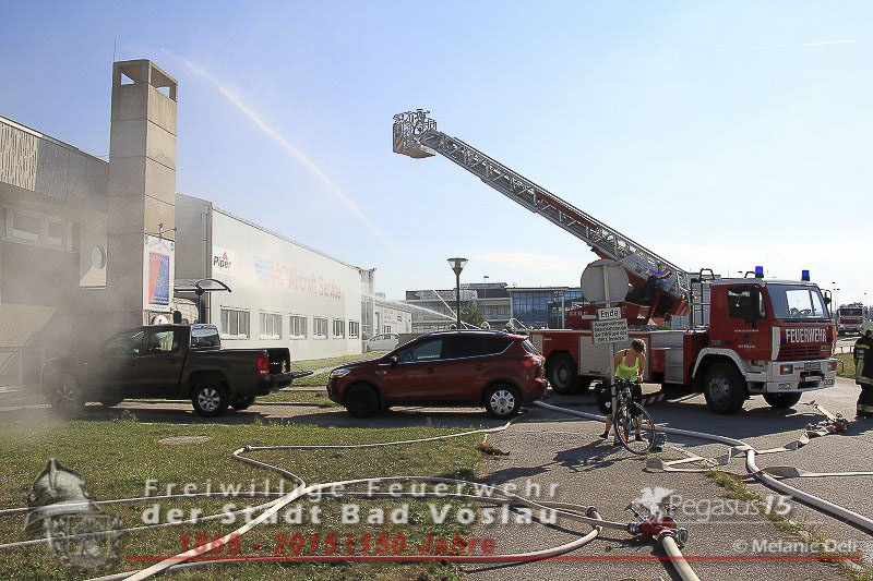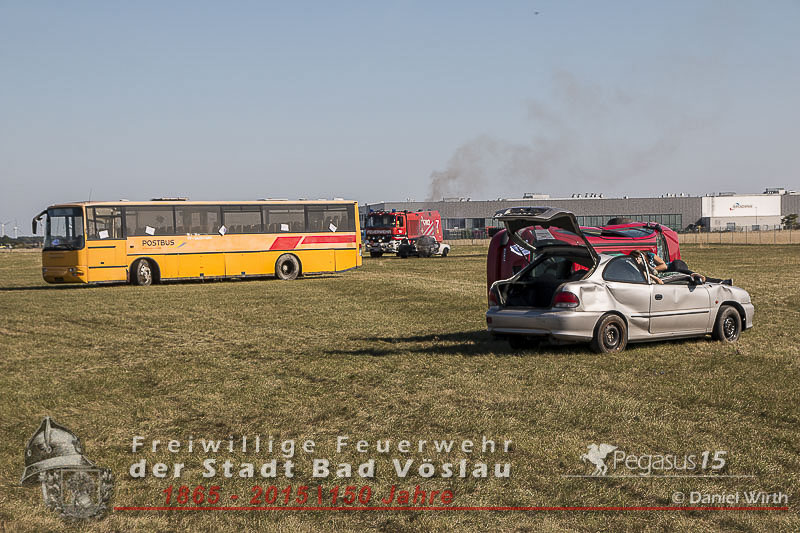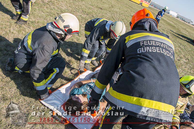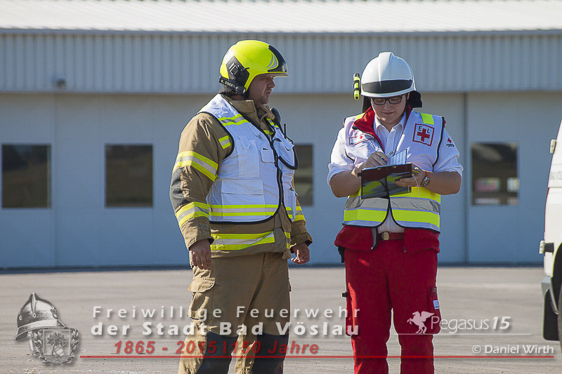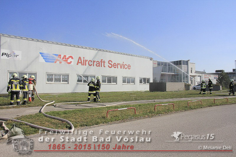 statt. Das folgende Szenario wurde von der Freiwilligen Feuerwehr der Stadt Bad Vöslau und dem Roten Kreuz Bad Vöslau erarbeitet. Flugzeugteile wurden mit PKW’s und einem Bus dargestellt. Um 15:00 Uhr kommt es zu einer Notlandung einer Maschine des Typs „Beechcraft 1900“. Die zweimotorige Propellermaschine mit 13 Passagieren an Bord hat Probleme mit den Triebwerken und streift beim Landeversuch das Flughafengebäude. Durch herumfliegende Flugzeugteile wird eine weitere Maschine des Typs „Cessna 172“ mit zwei Personen an Bord getroffen. Ein Hangar neben dem Hauptgebäude fing durch auslaufende Betriebsstoffe Feuer und stand binnen weniger Minuten in Vollbrand. In den Schulungsräumen im Keller des Hauptgebäudes wurden weitere 2 Personen vom dichten Rauch eingeschlossen. Ausgangslage, Eintreffen der Feuerwehreinsatzkräfte und Beginn der Lösch- und Rettungsarbeiten.