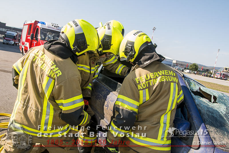 Die Feuerwehr Kottingbrunn fuhr sofort auf das Vorfeld des Flugplatzes und begann mit der technischen Menschenrettung. Die Bereichsleitung „Rollfeld“ übernahm der erste Gruppenkommandant der FF Kottingbrunn. Die restlichen Freiwilligen Feuerwehren wurden auf die beiden Bereiche aufgeteilt und begannen ebenfalls mit der Brandbekämpfung und der Menschenrettung. Die Einsatzkräfte des Rettungsdienstes gingen, parallel zu den Arbeiten der Feuerwehren, nach den Richtlinien bei einem Großunfall vor. Der erste RTW aus Bad Vöslau verschaffte sich einen Überblick und übernahm die Einsatz- sowie die Transportleitung vor Ort. Nach und nach trafen weitere 7 Fahrzeuge des Roten Kreuzes Berndorf sowie Bad Vöslau am Unglücksort ein. Eintreffen der Rettungskräfte des Roten Kreuz Bad Vöslau und Berndorf.