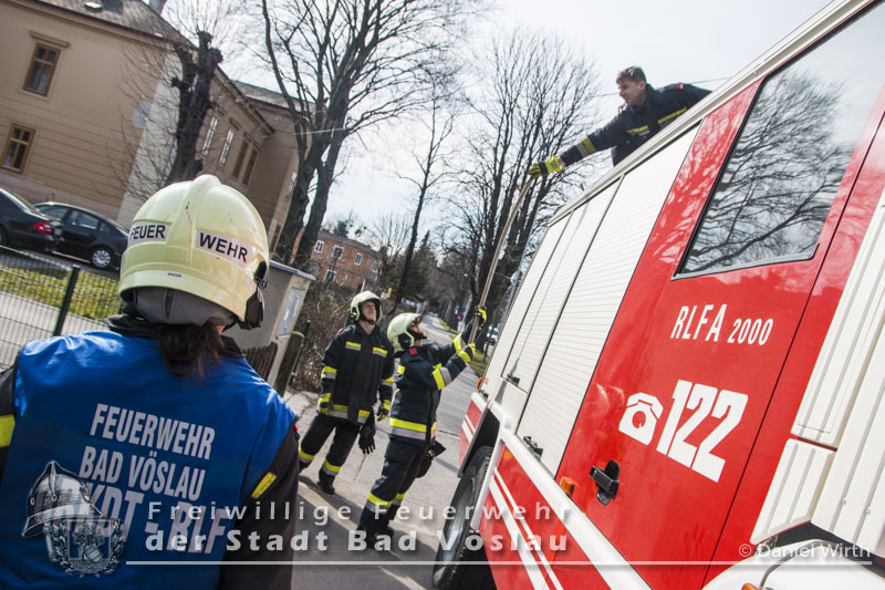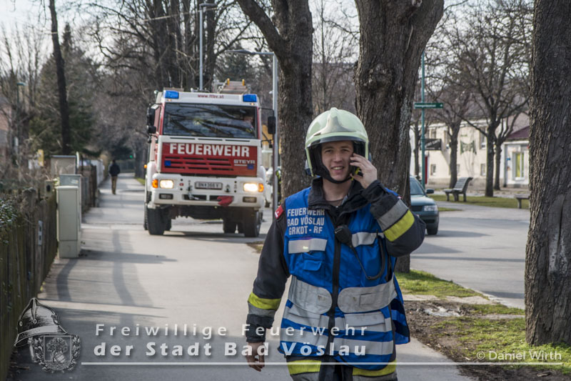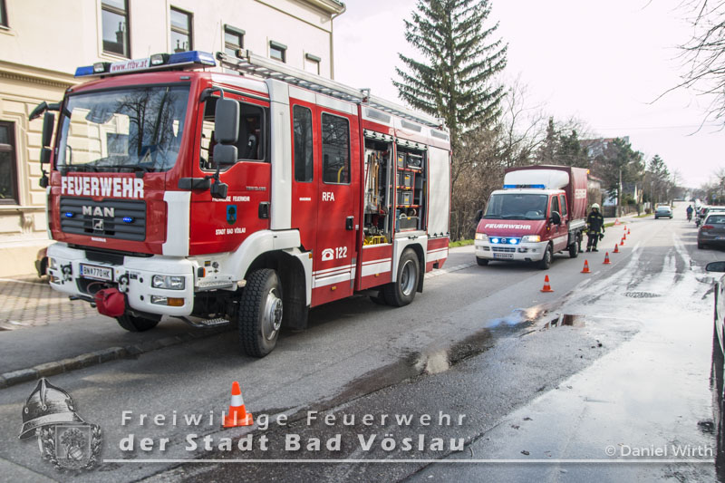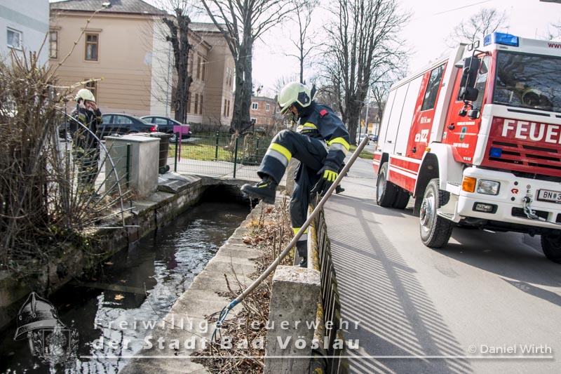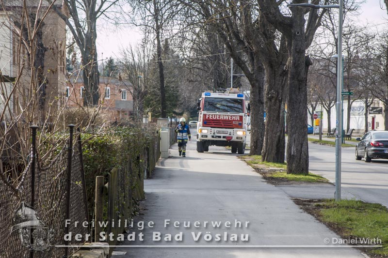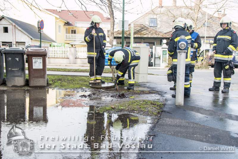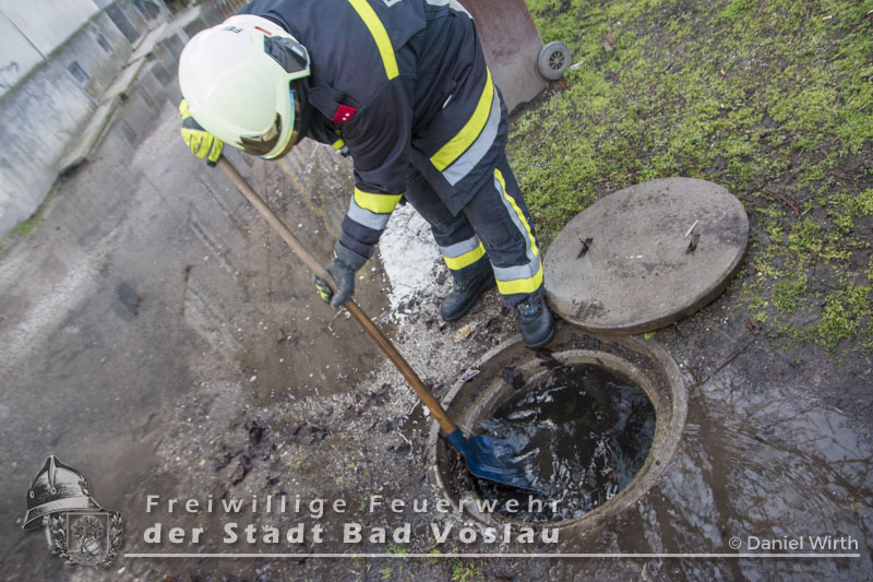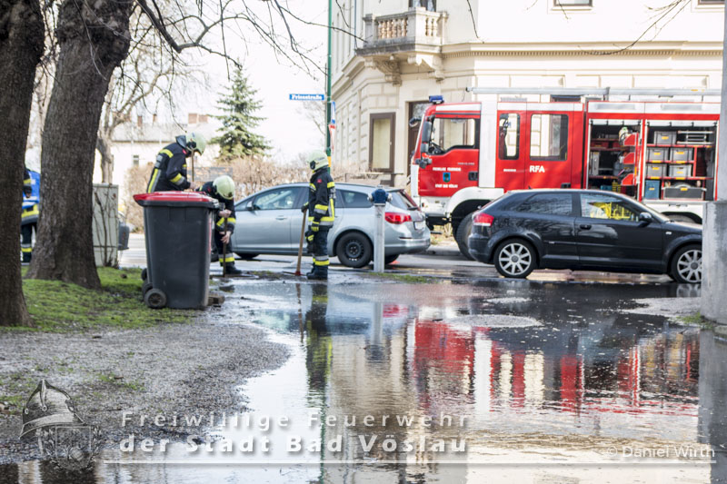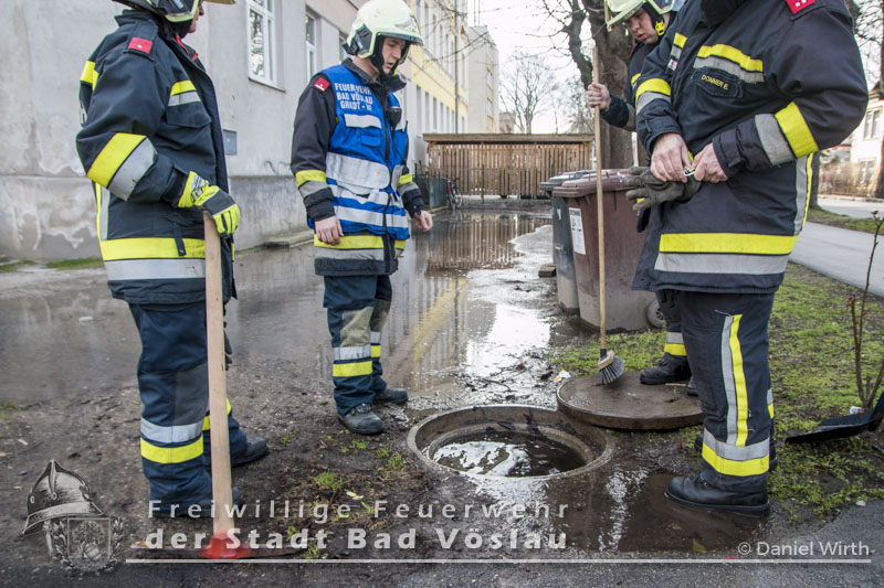 In den Mittagsstunden des 27. Februar 2016 wurden in Bad Vöslau zwei Straßen teilweise überschwemmt. Aufmerksame Anwohner alarmierten aus diesem Grund die Freiwillige Feuerwehr der Stadt Bad Vöslau über den Feuerwehrnotruf 122. Vom Einsatzleiter konnte rasch die Ursache gefunden werden. Eine kleinräumige Verklausung eines Baches ließ das Wasser über die Ufer treten. Da der Bach teilweiße unterirdisch unter den Straßen verläuft drückte das Wasser auch aus einem Kanaldeckel.Mit Schaufeln wurden die Blätter und Äste entfernt und der Durchfluss im Kanalbereich wieder hergestellt. Nach einer halben Stunde konnte der Einsatz beendet werden.